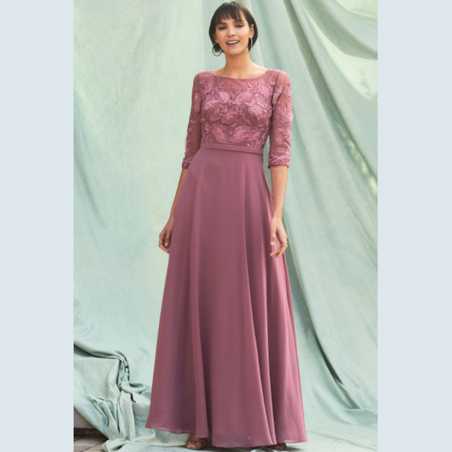 Vestido corte A de manga larga adornado con detalle floral, recomendado para cuerpos tipo Manzana, Pera y Reloj de Arena.Leer más