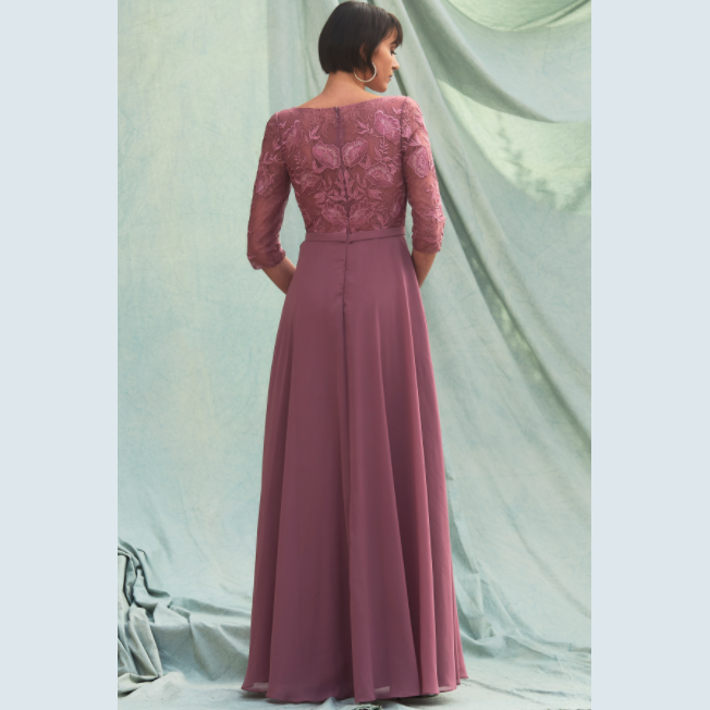 Vestido corte A de manga larga adornado con detalle floral, recomendado para cuerpos tipo Manzana, Pera y Reloj de Arena.