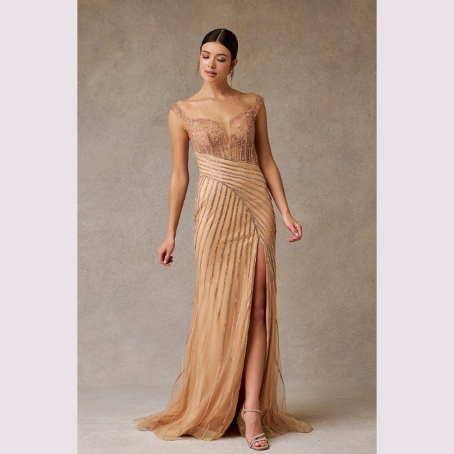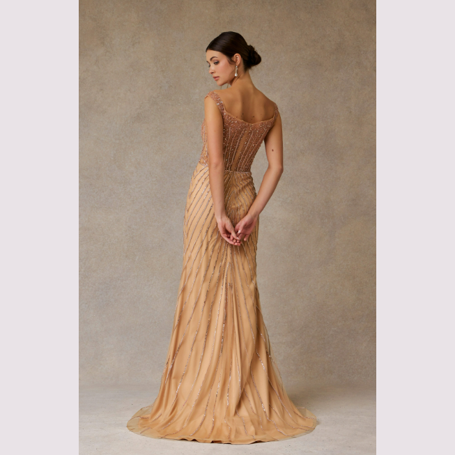Vestido corte sirena con visagismo en la cadera y transparencia en la parte superior, es recomendado para cuerpos tipo Reloj de Arena y Pera.