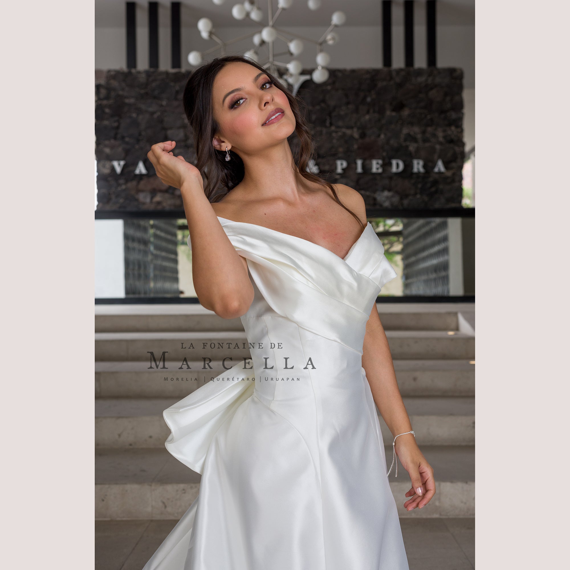 Vestido de novia corte en A con manga de ojal, es recomendado para cuerpos tipo Rectángulo y Triangulo Invertido.