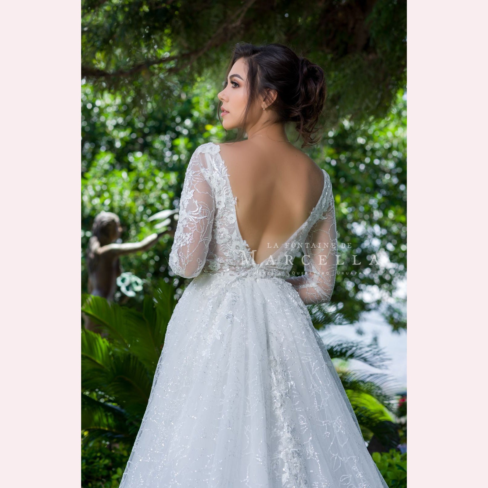 Vestido de novia con manga larga, escote en V y abertura en la pierna, es recomendado para cuerpos tipo Rectángulo y Triangulo Invertido.Read more