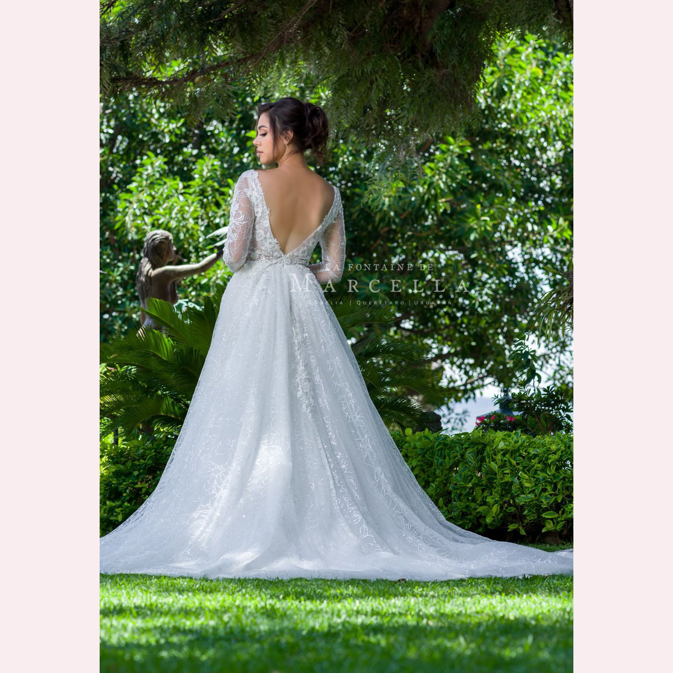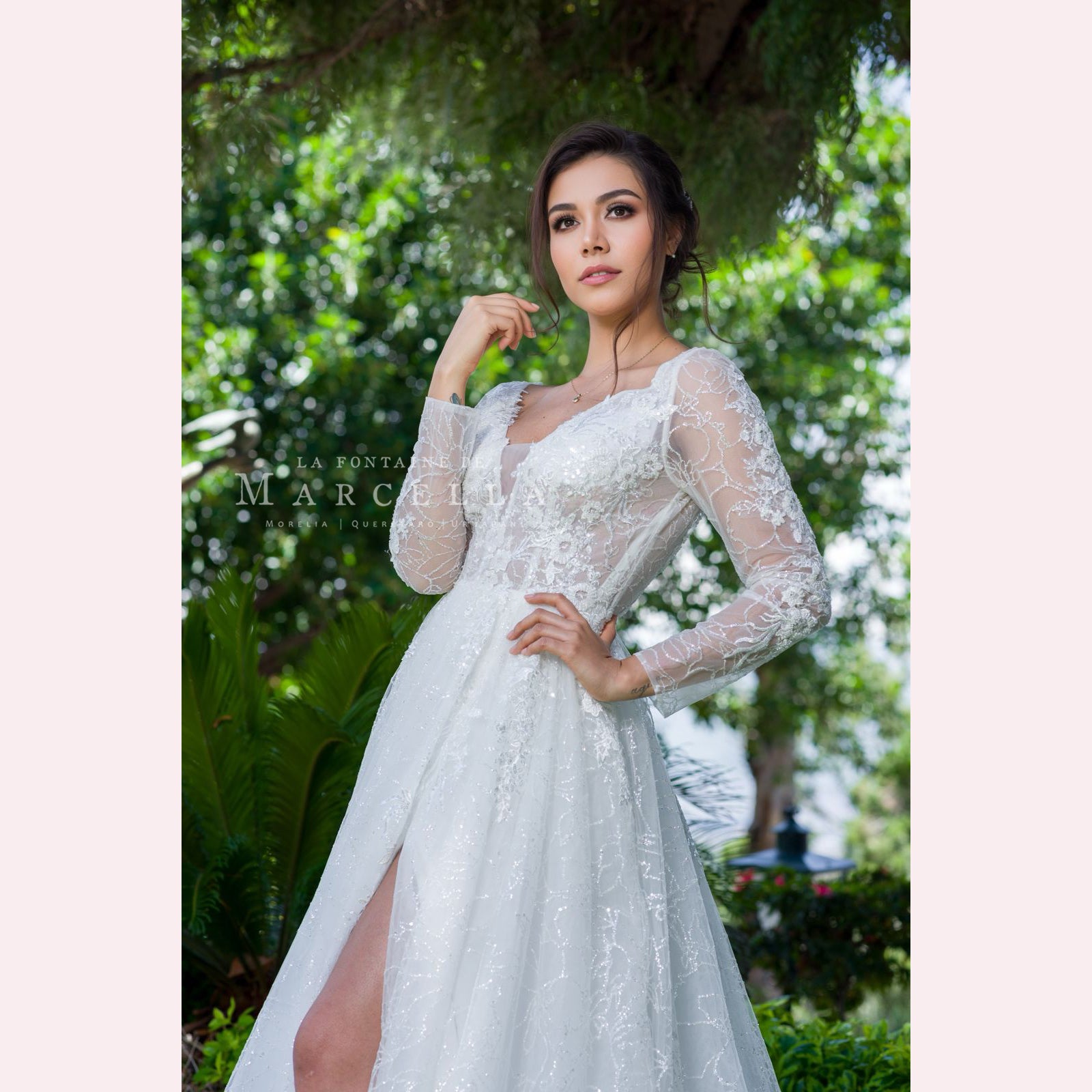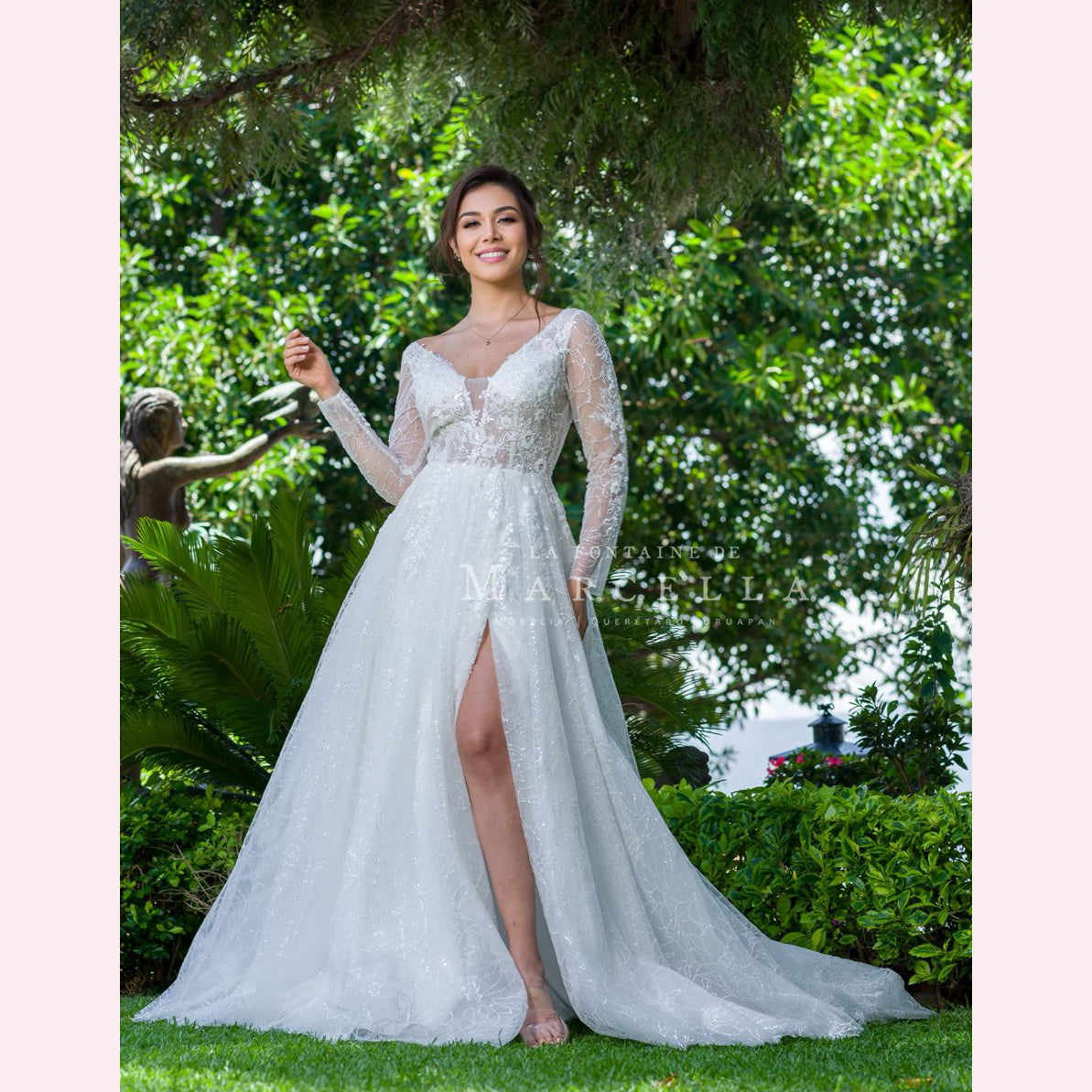 Vestido de novia con manga larga, escote en V y abertura en la pierna, es recomendado para cuerpos tipo Rectángulo y Triangulo Invertido.
