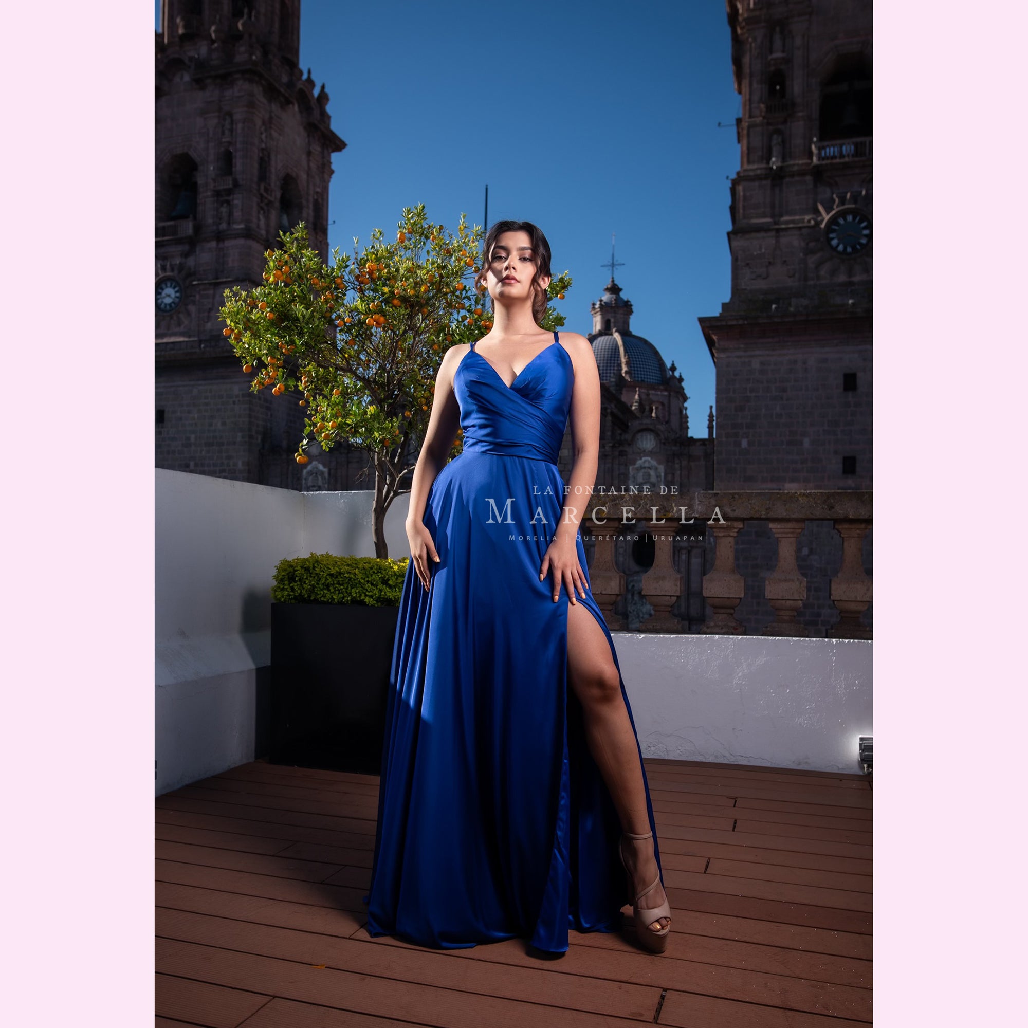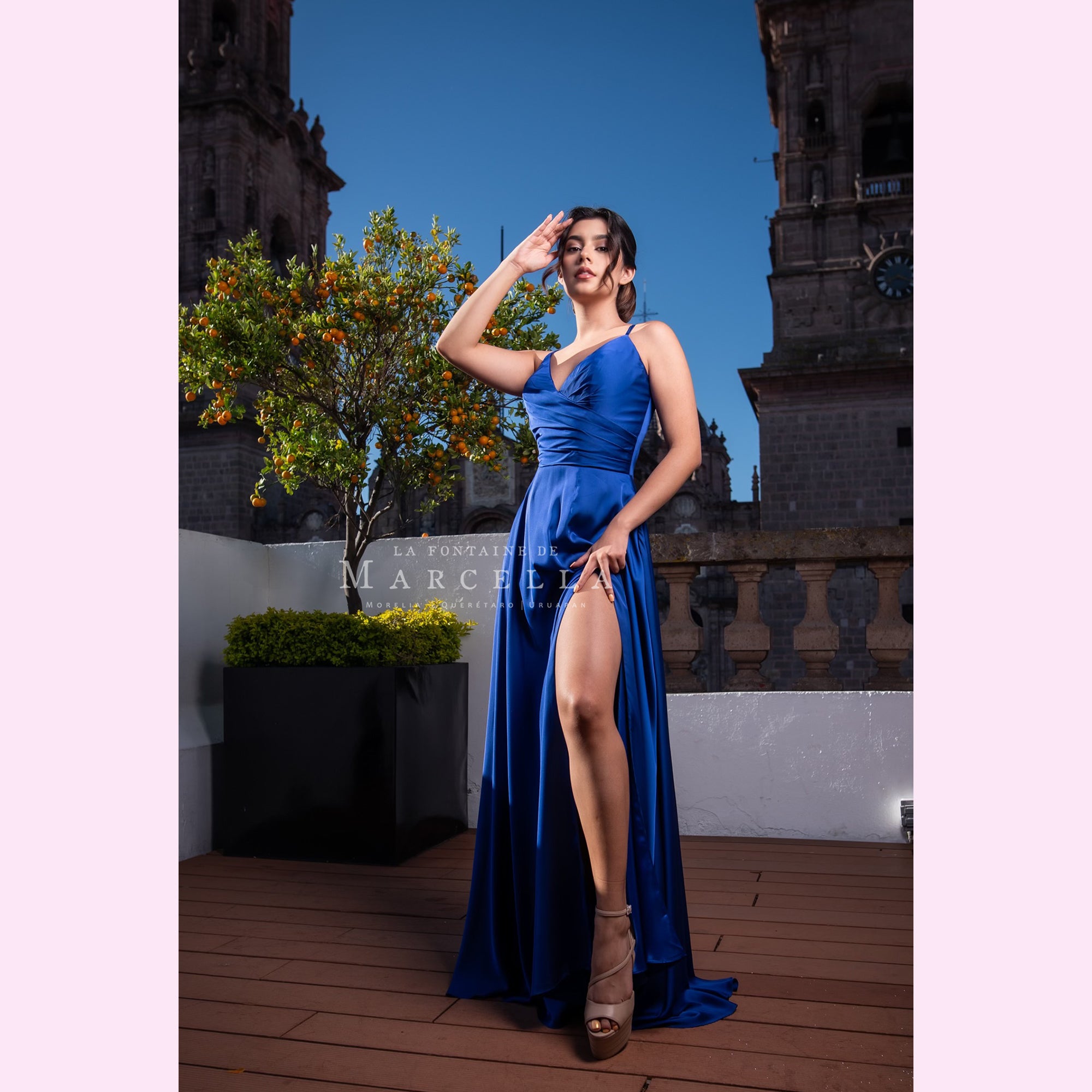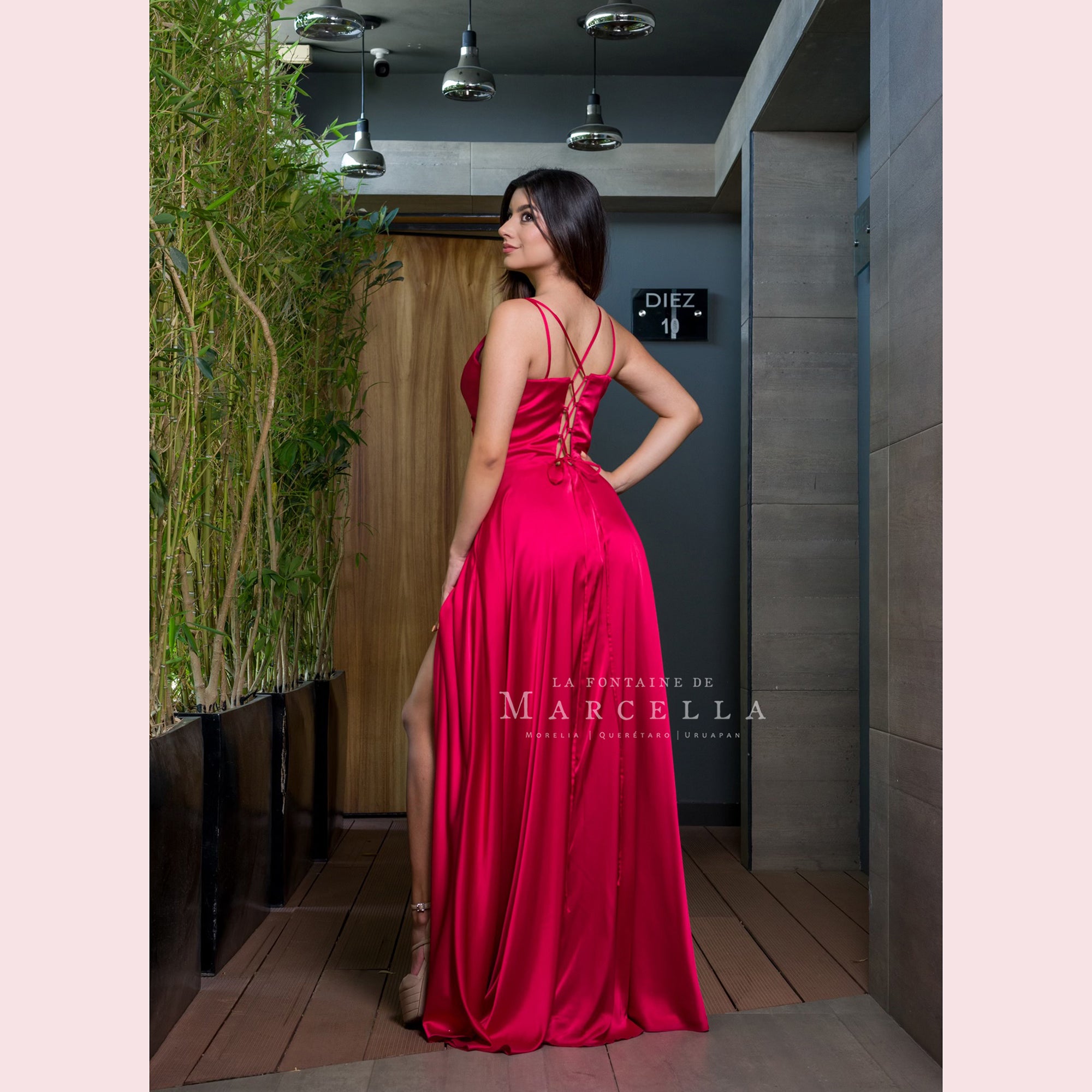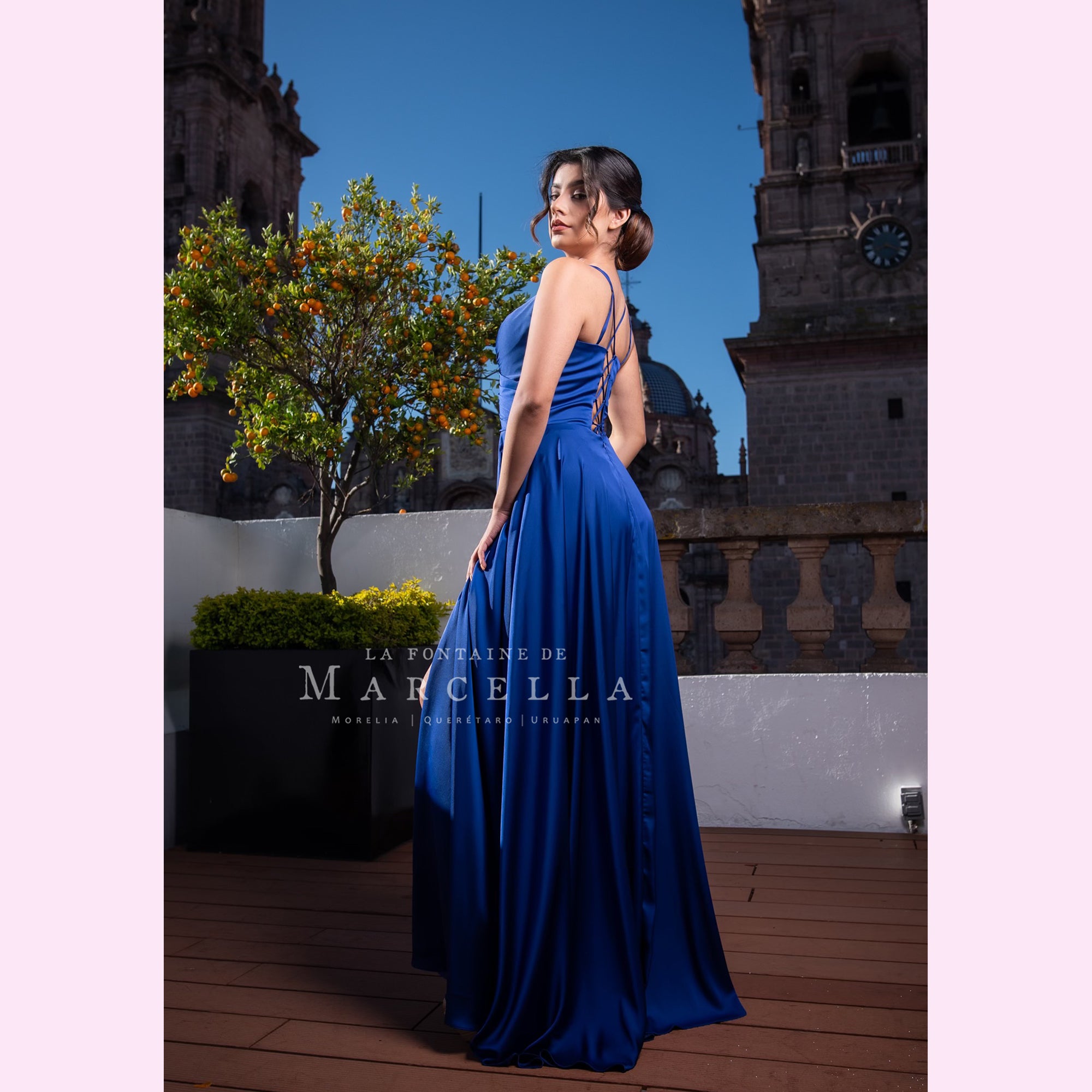 Vestido largo corte en A con escote corazón tirante delgado y corsé, es recomendado para cuerpos tipo Rectángulo y Triangulo Invertido