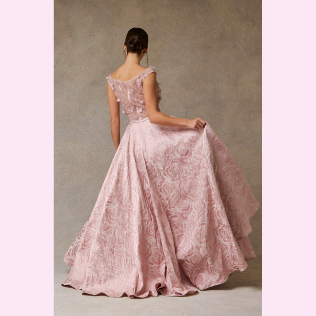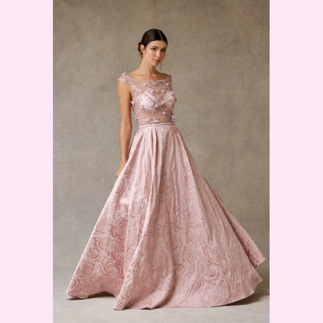 Vestido largo corte en A con la parte superior en transparencia con aplicación floral, falda con tela texturizada, es recomendado para cuerpos tipo Rectángulo y Triangulo Invertido.
