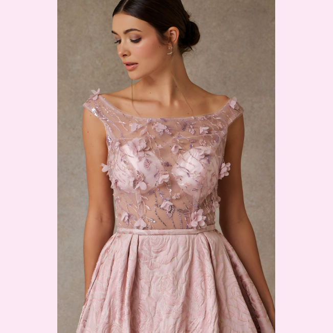 Vestido largo corte en A con la parte superior en transparencia con aplicación floral, falda con tela texturizada, es recomendado para cuerpos tipo Rectángulo y Triangulo Invertido. Read more