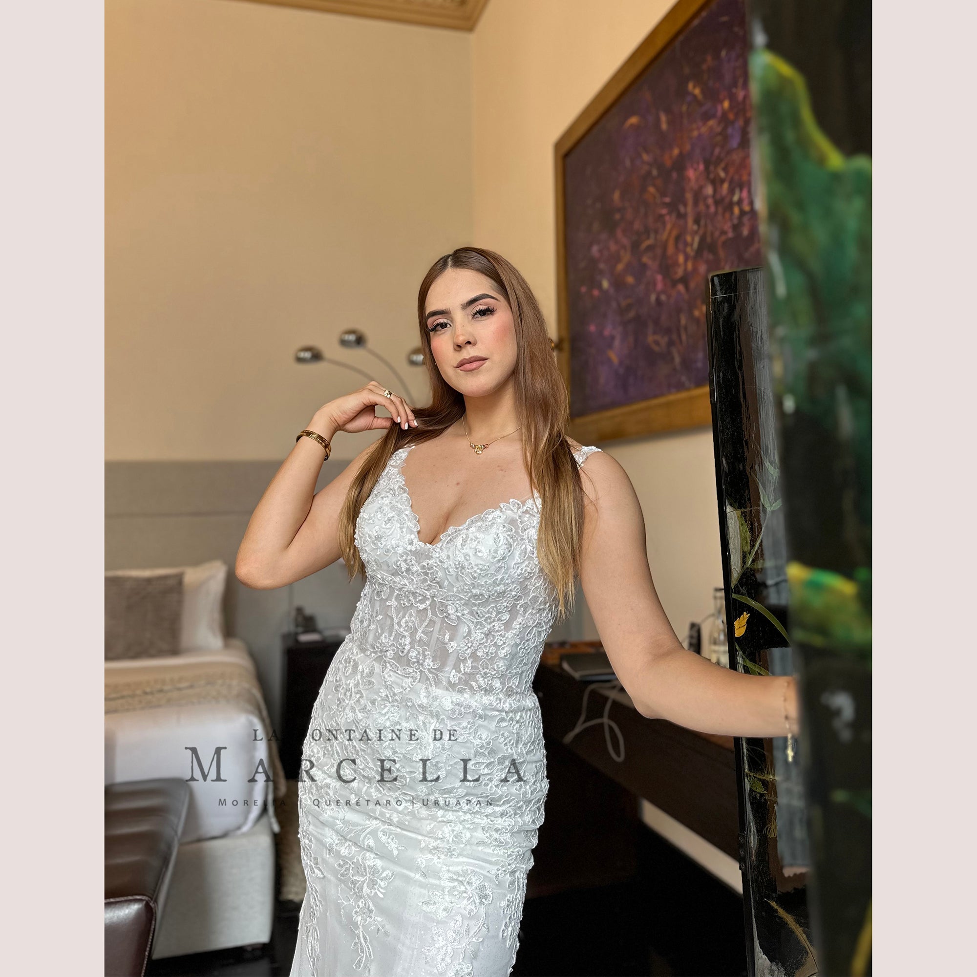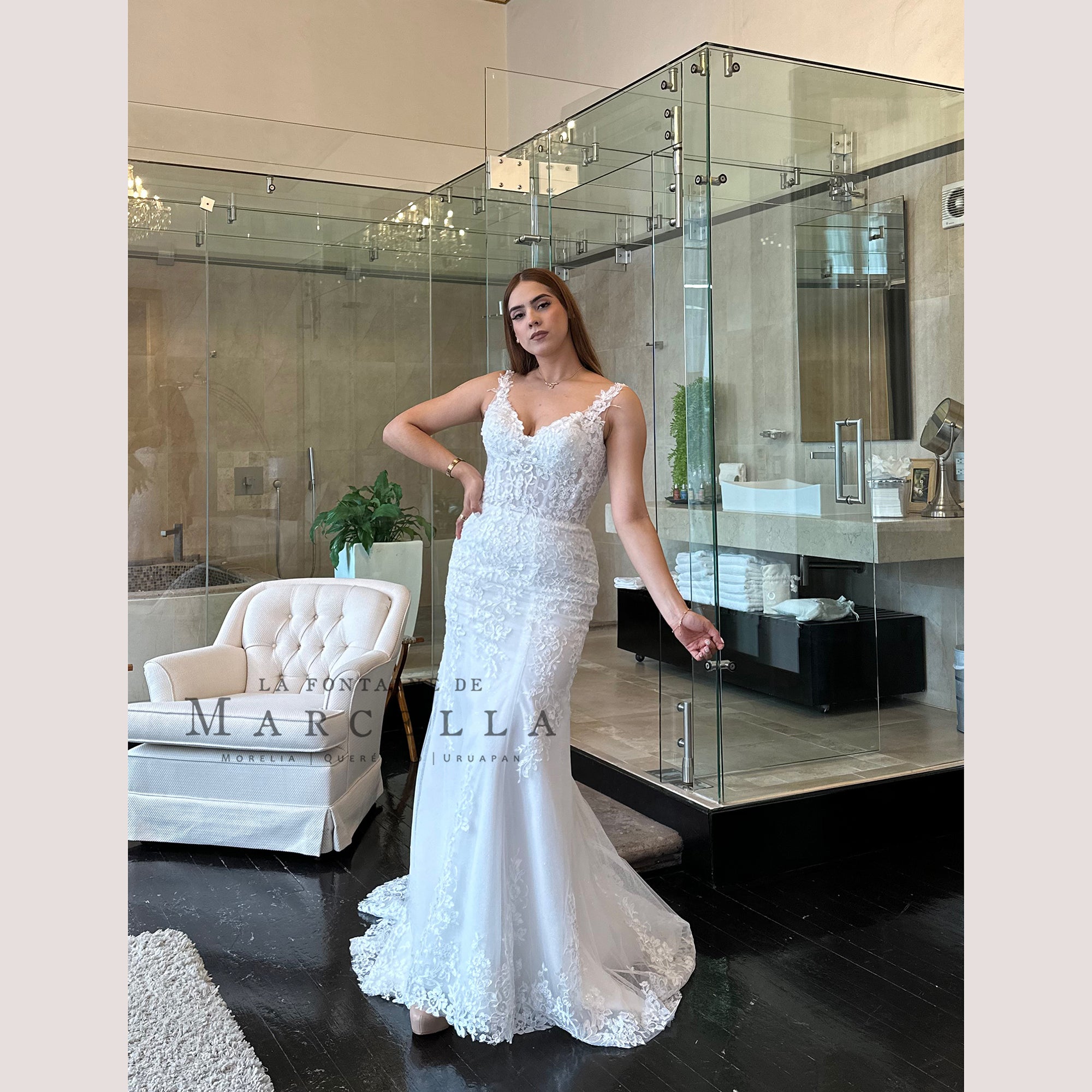 Vestido largo corte sirena hermosamente adornado con aplicación floral, con aplicación en toda la orilla de la cauda es recomendado para cuerpos tipo Pera y Reloj de Arena.Read more