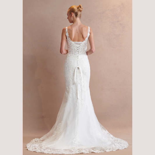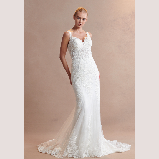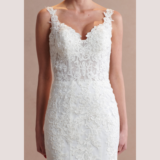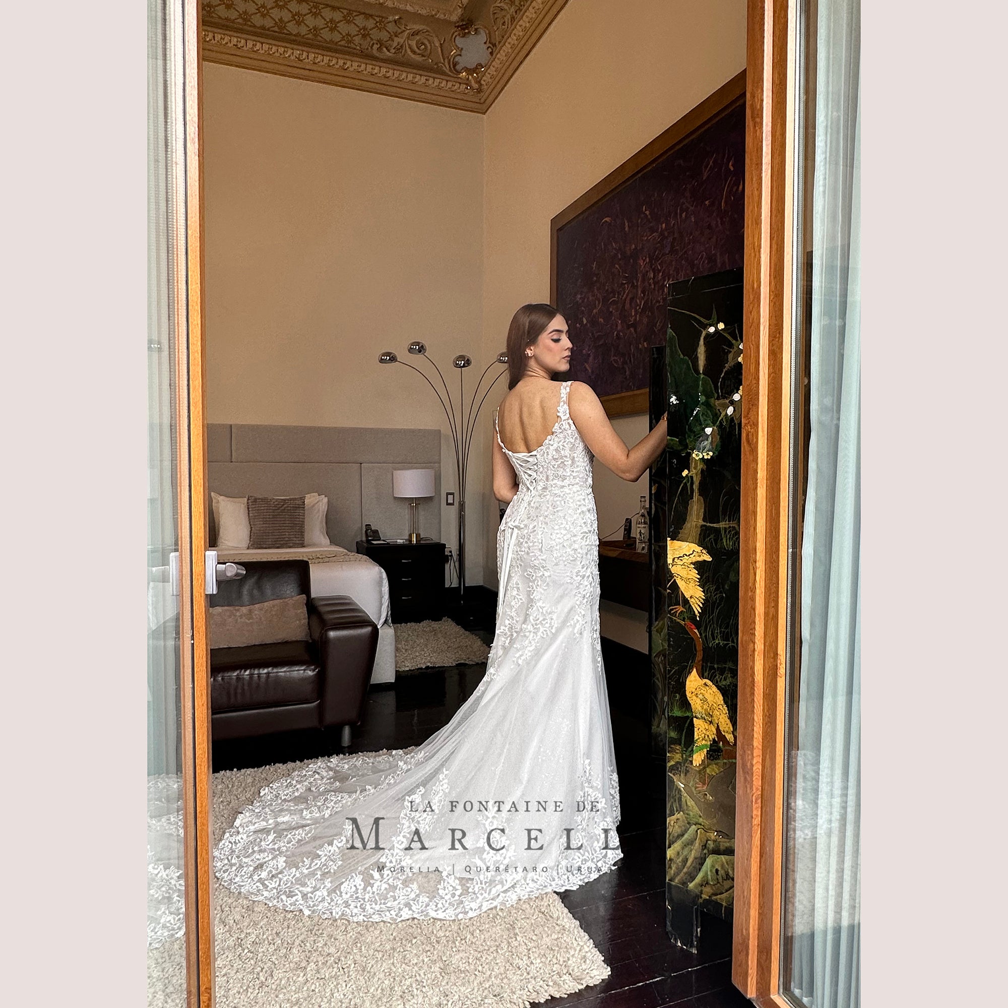 Vestido largo corte sirena hermosamente adornado con aplicación floral, con aplicación en toda la orilla de la cauda es recomendado para cuerpos tipo Pera y Reloj de Arena.