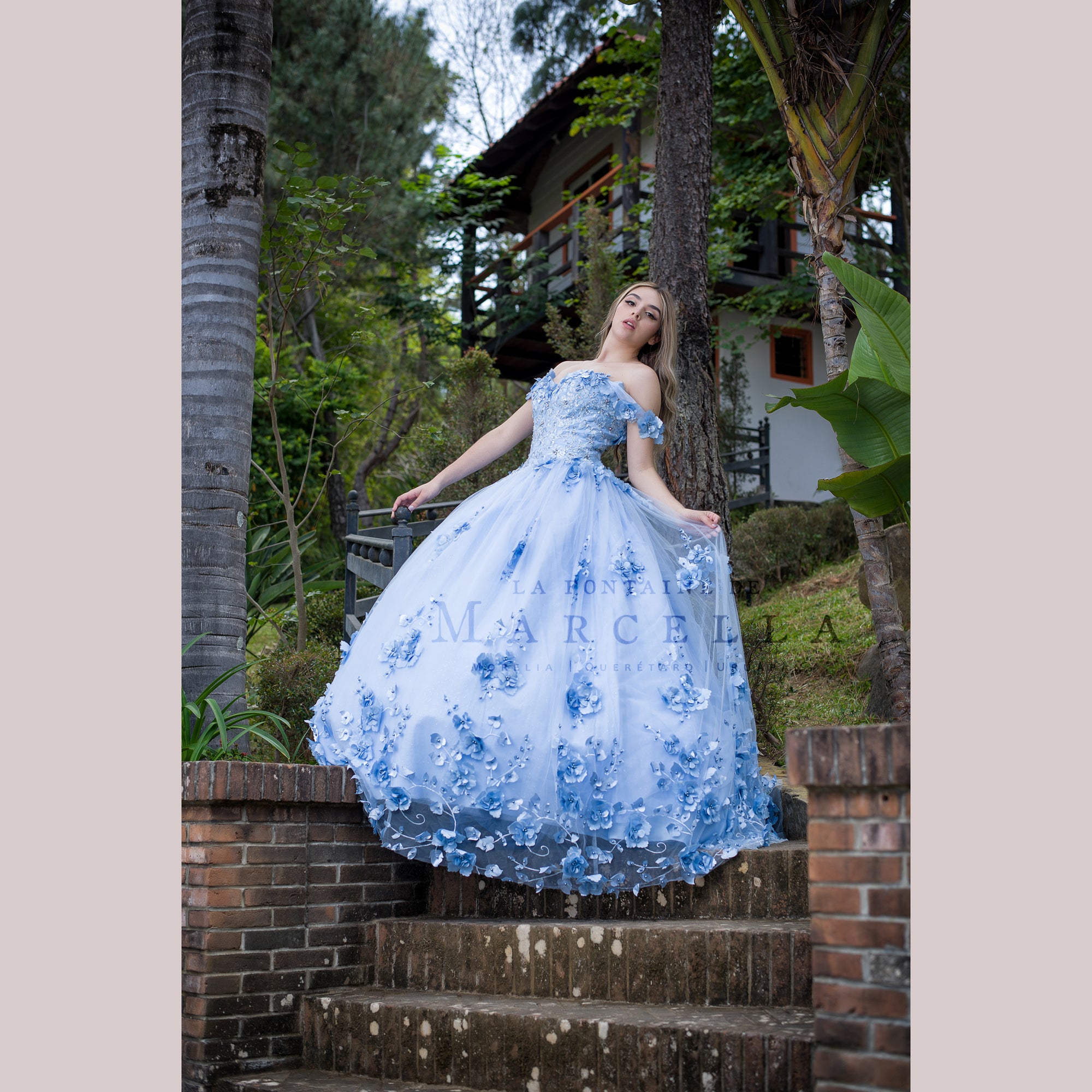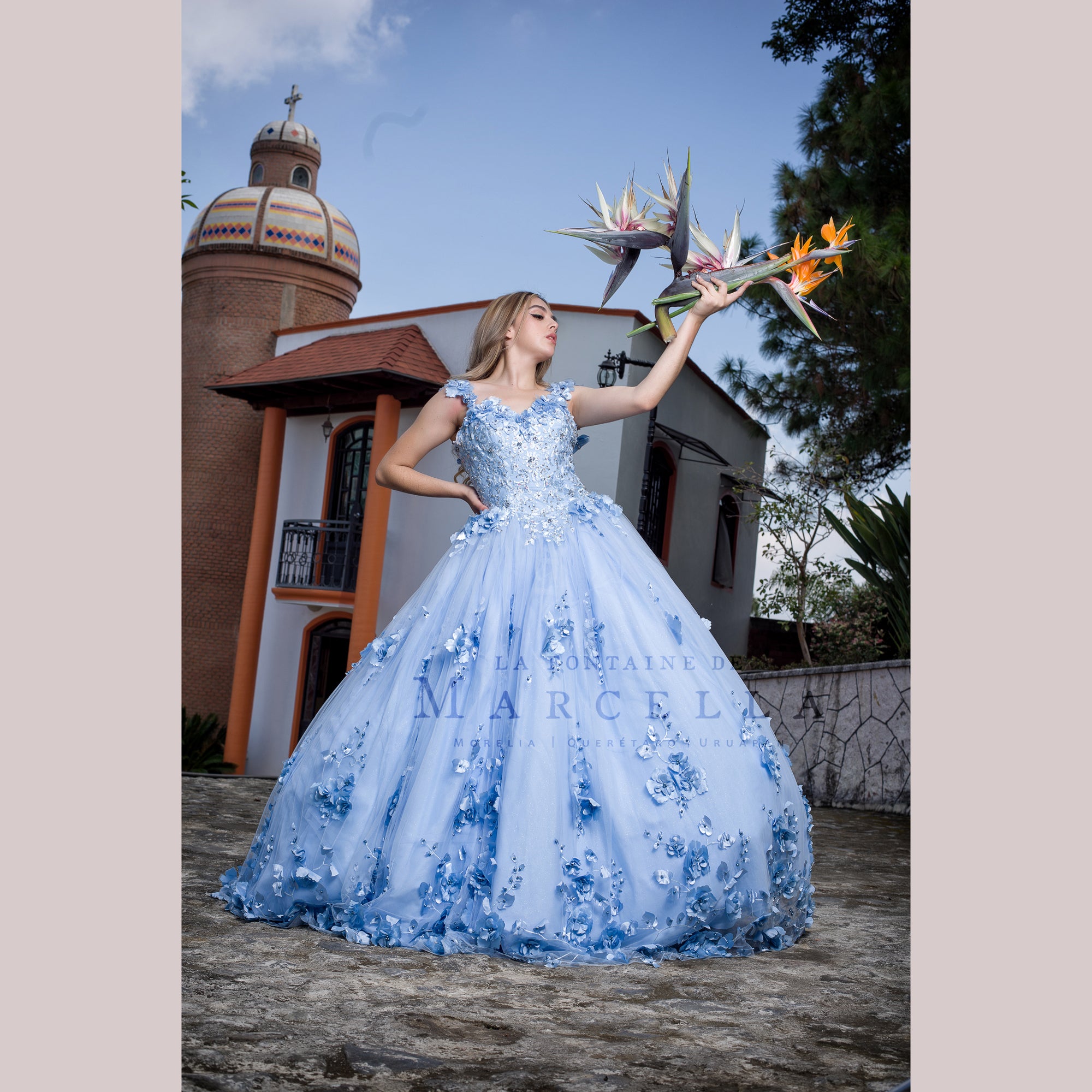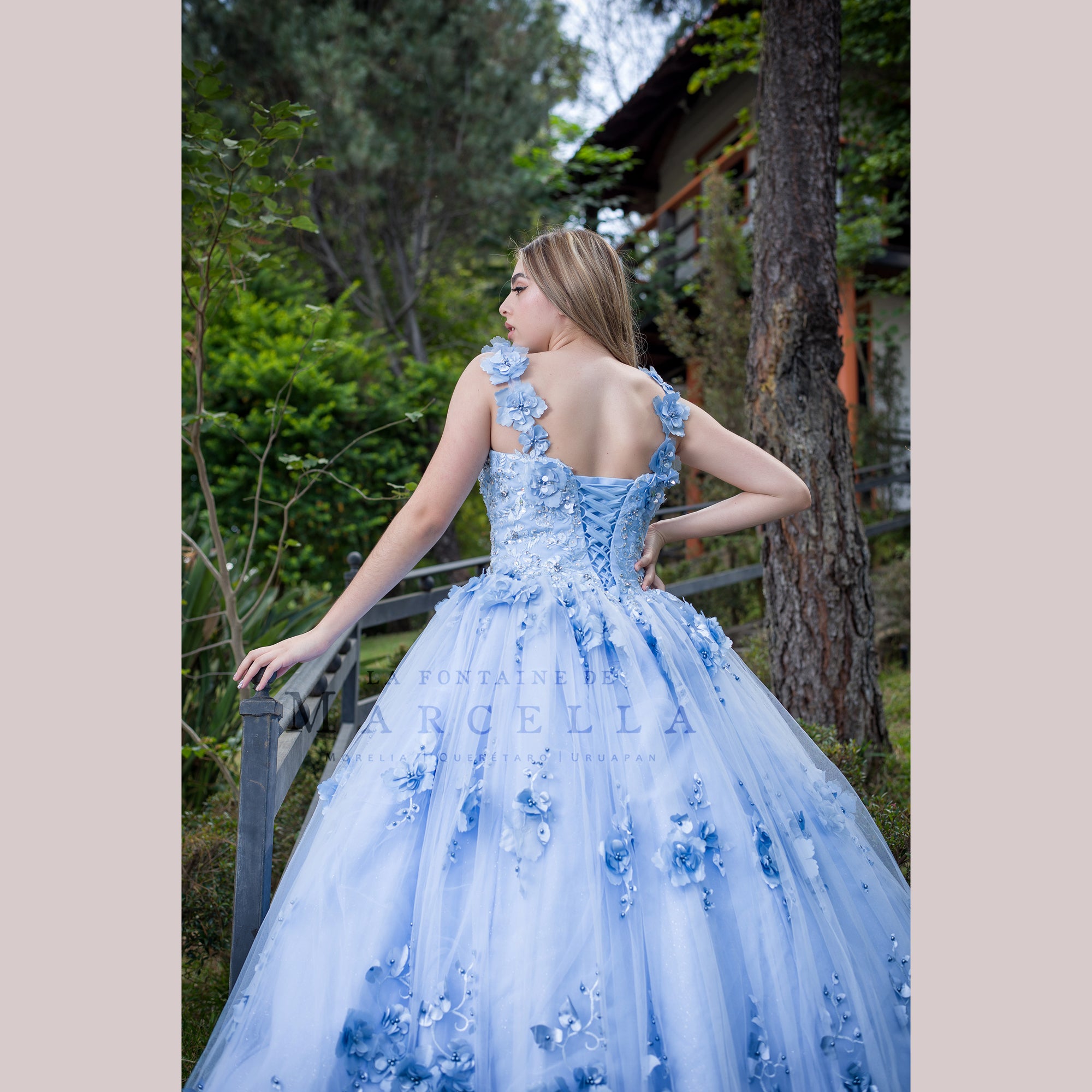Vestido corte princesa adornado con aplicación en relieve, con corsé en la parte de atrás y manga de ojal, recomendado para cuerpos tipo Rectángulo, Triangulo Invertido y Reloj de Arena.Read more