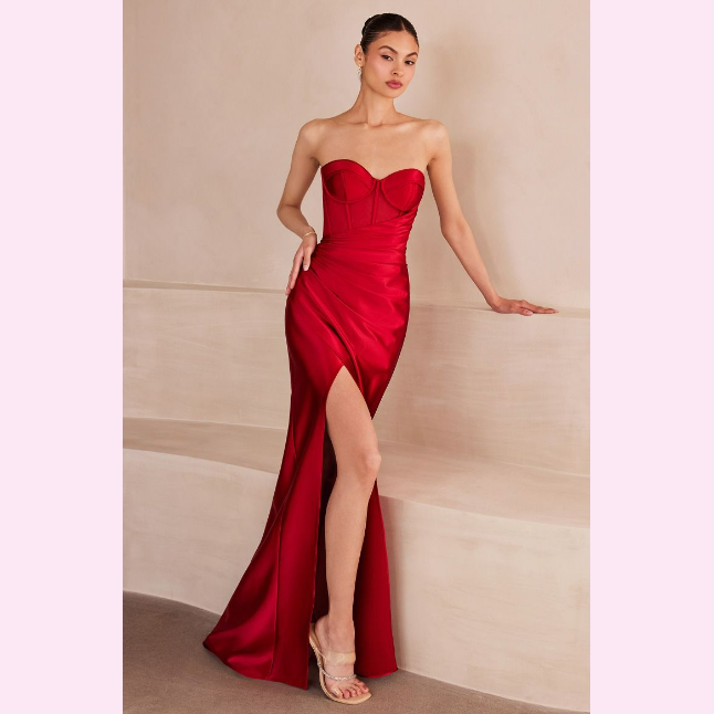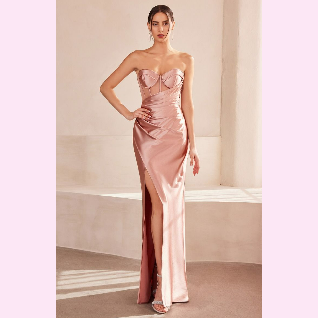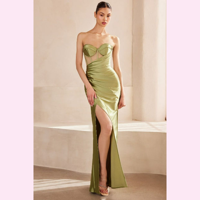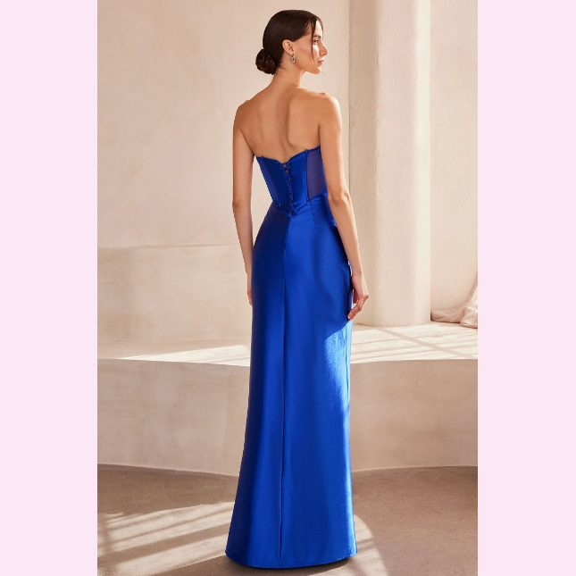 Vestido corte sirena con transparencia en la parte superior, escote corazón, plieguen en la cadera y abertura en la pierna, es recomendado para cuerpos Reloj de Arena y Triangulo Invertido.