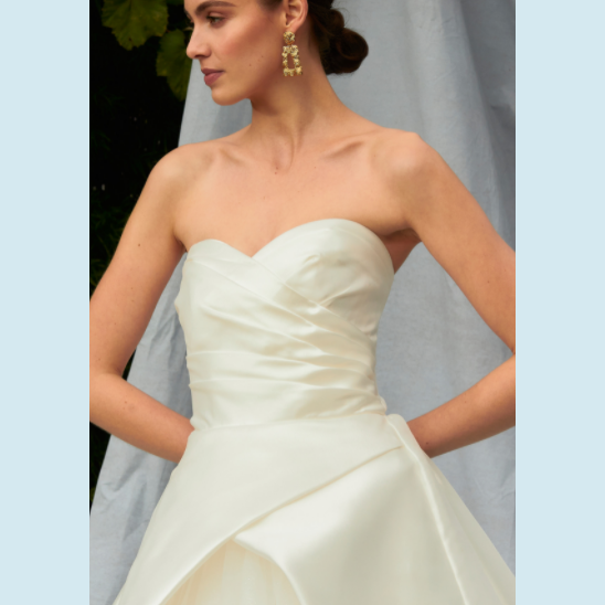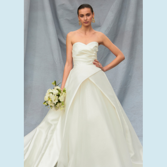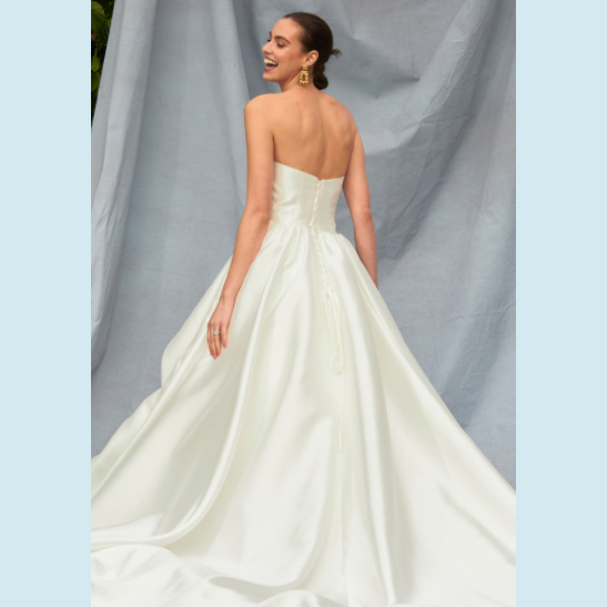 Vestido de Novia en tela semi brillante, strapless con pliegues en la parte superior. Recomendado para cuerpos tipo Rectángulo y Triangulo Invertido.