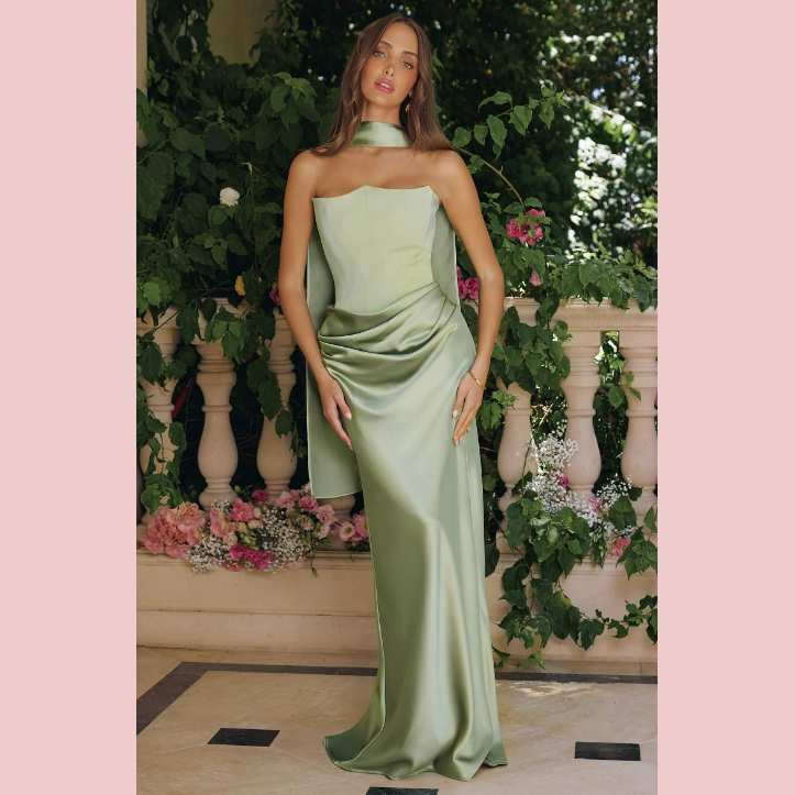 Vestido corte sirena strapless con vista corse y pashmina, es recomendado para cuerpos tipo Reloj de Arena y Pera.