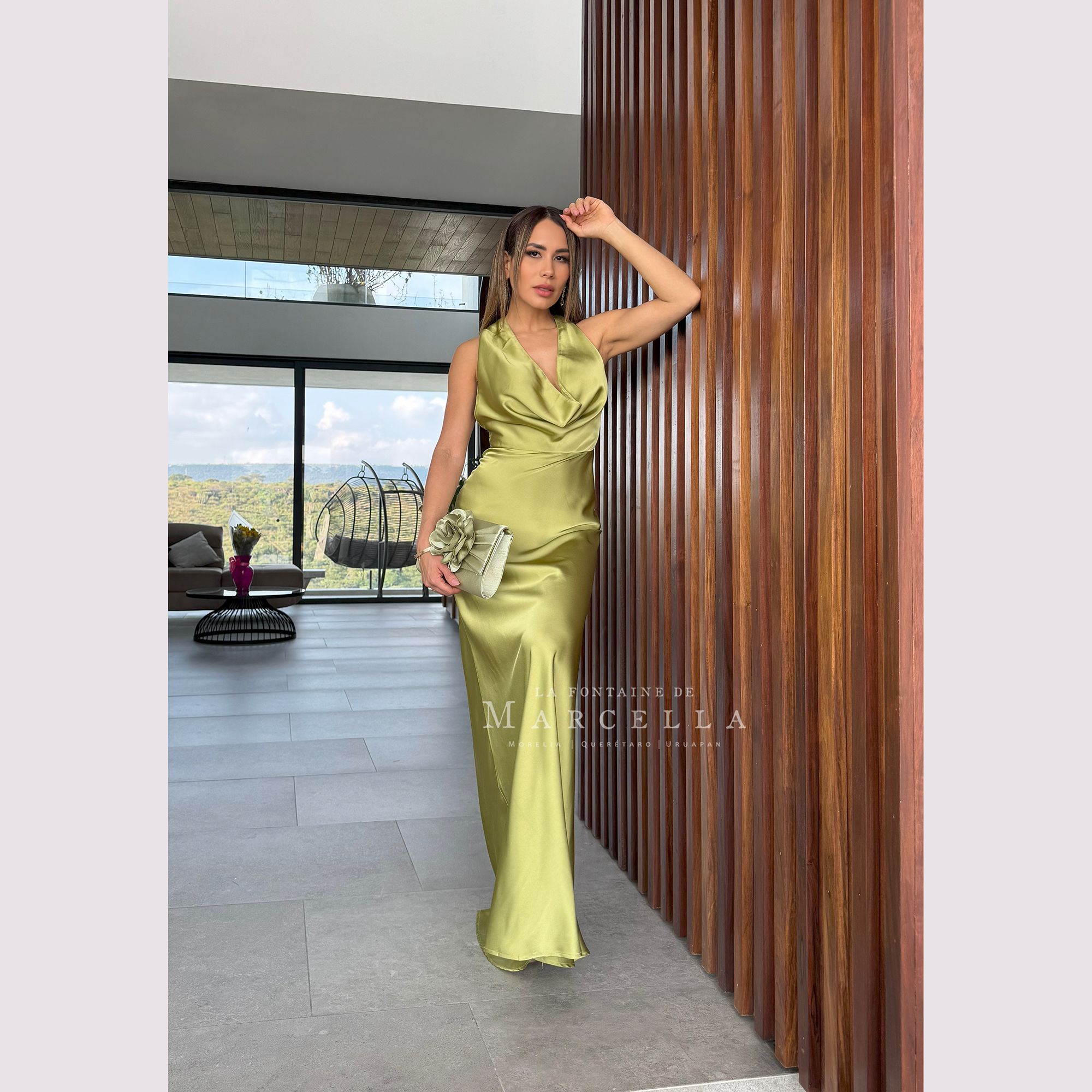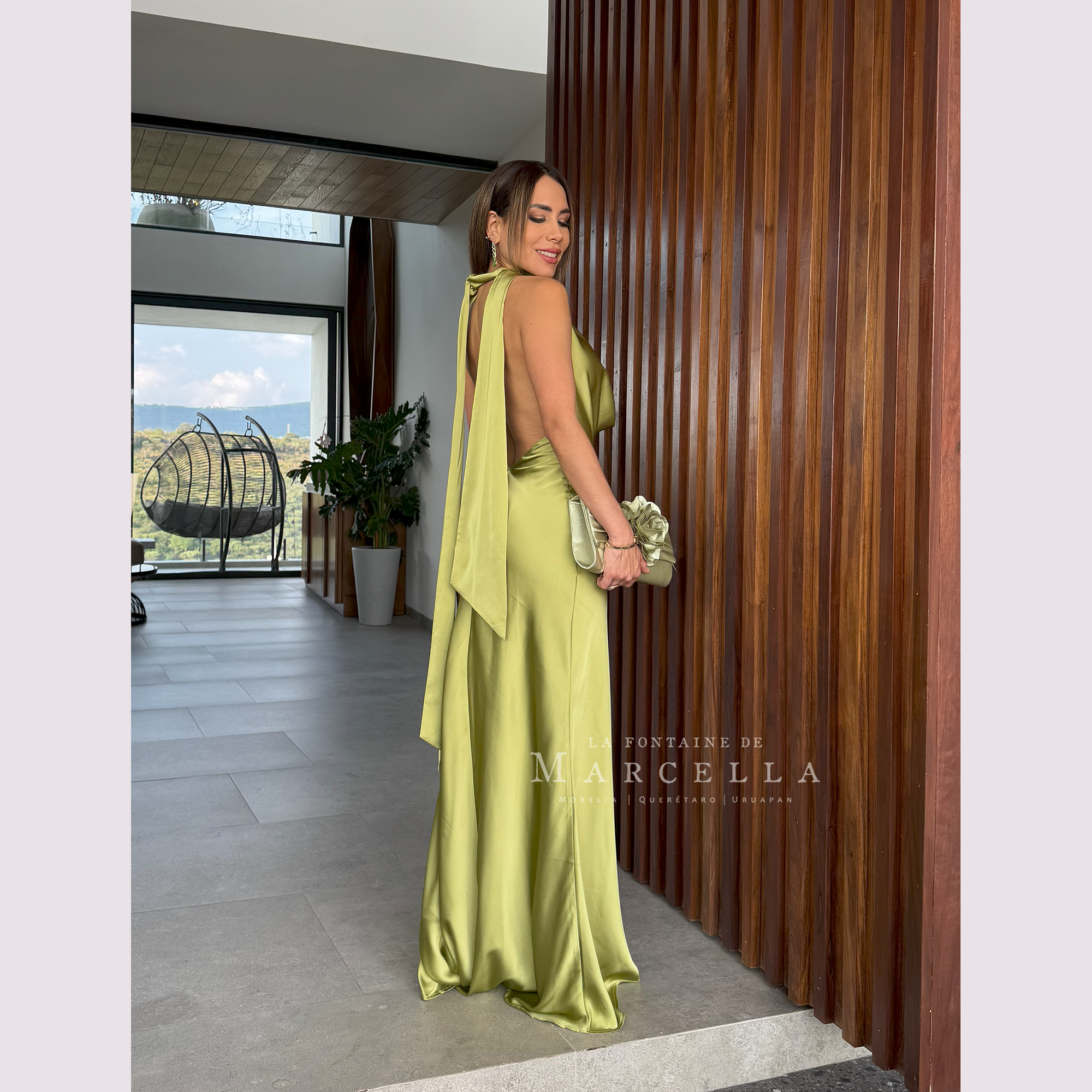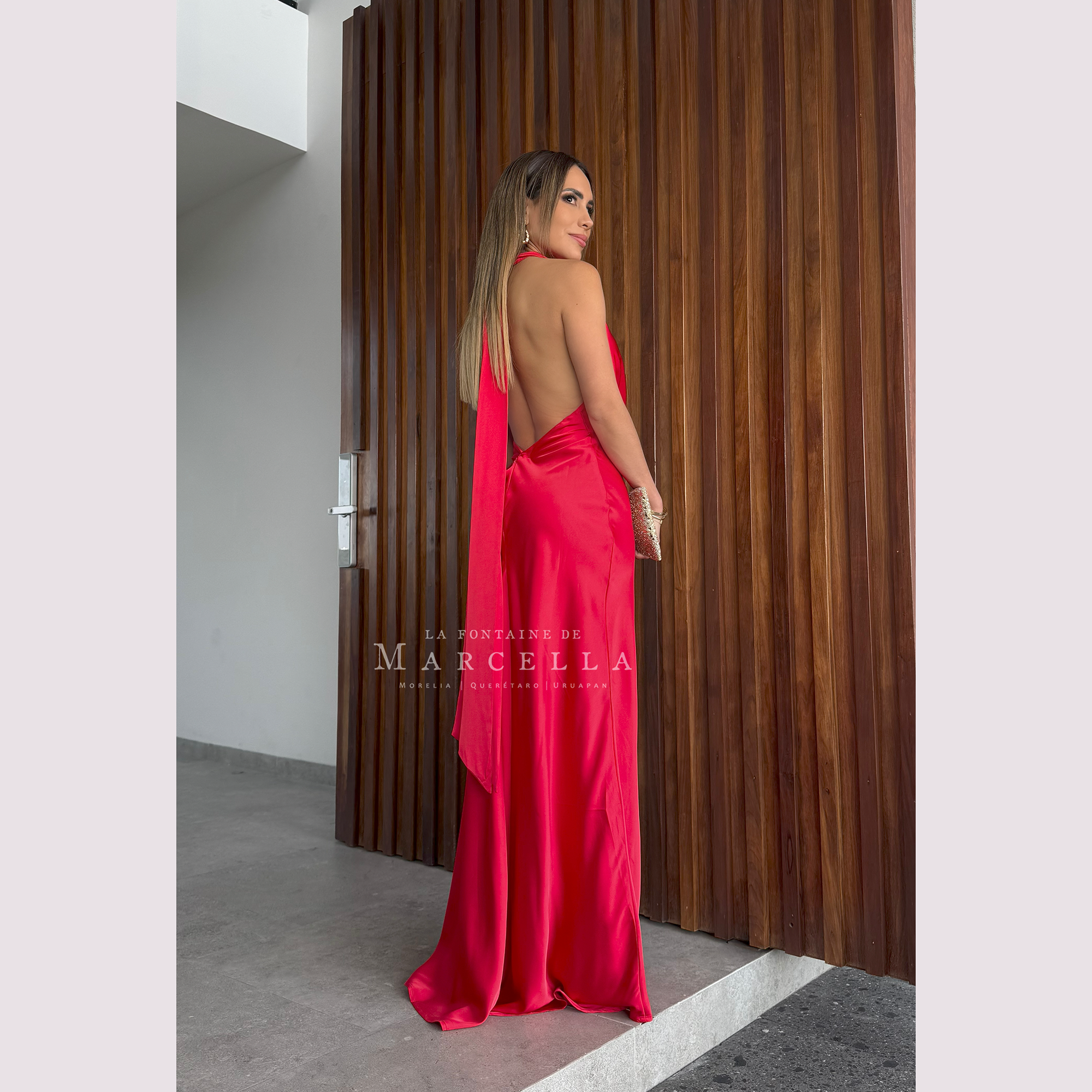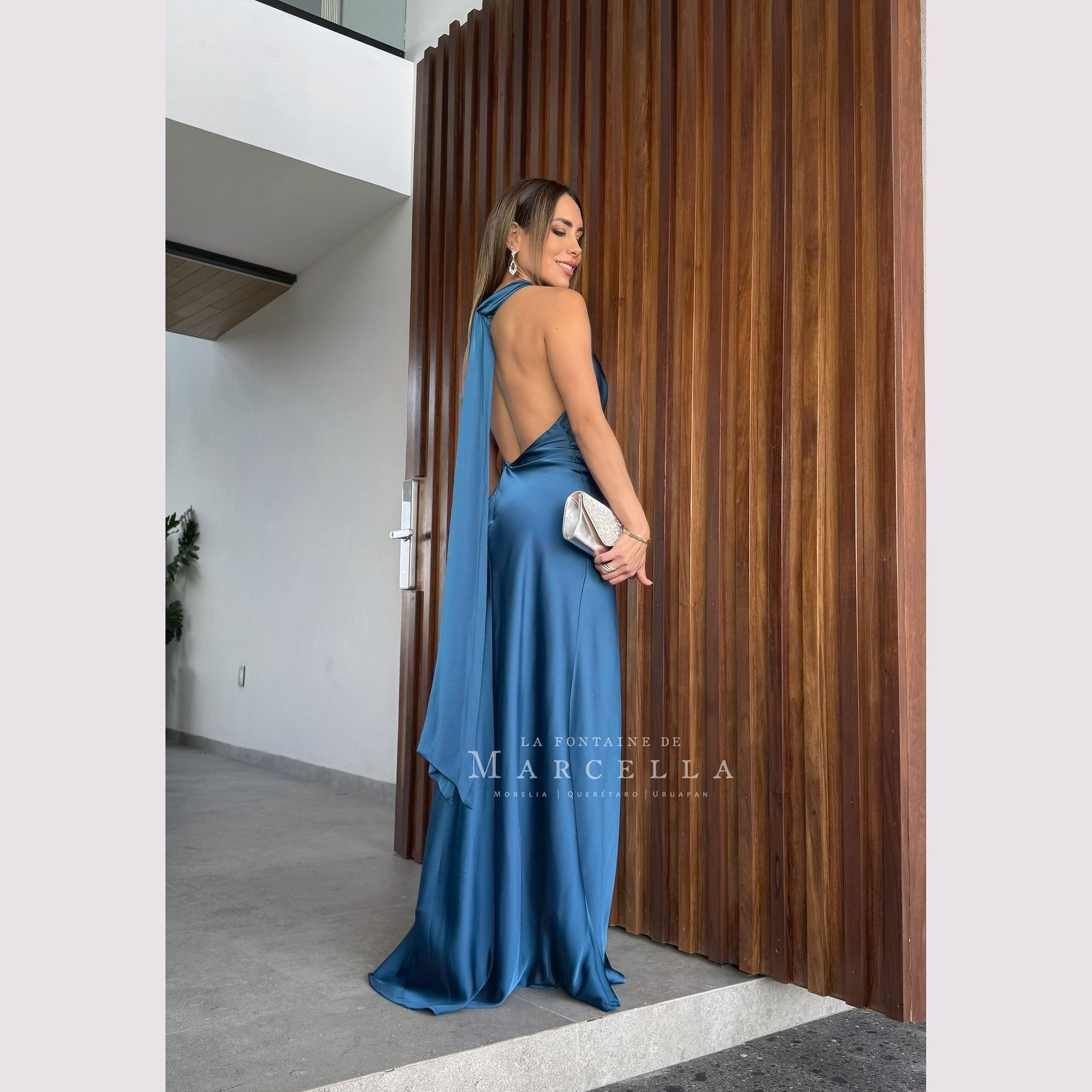Vestido largo corte sirena con cuello de ojal que se amarra al cuello, es recomendado para cuerpos tipo Reloj de Arena y Pera.