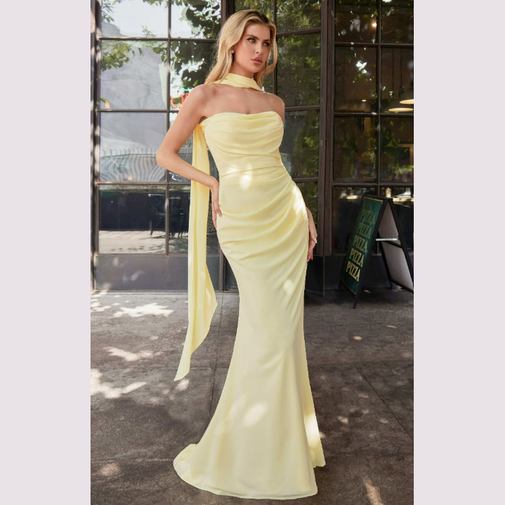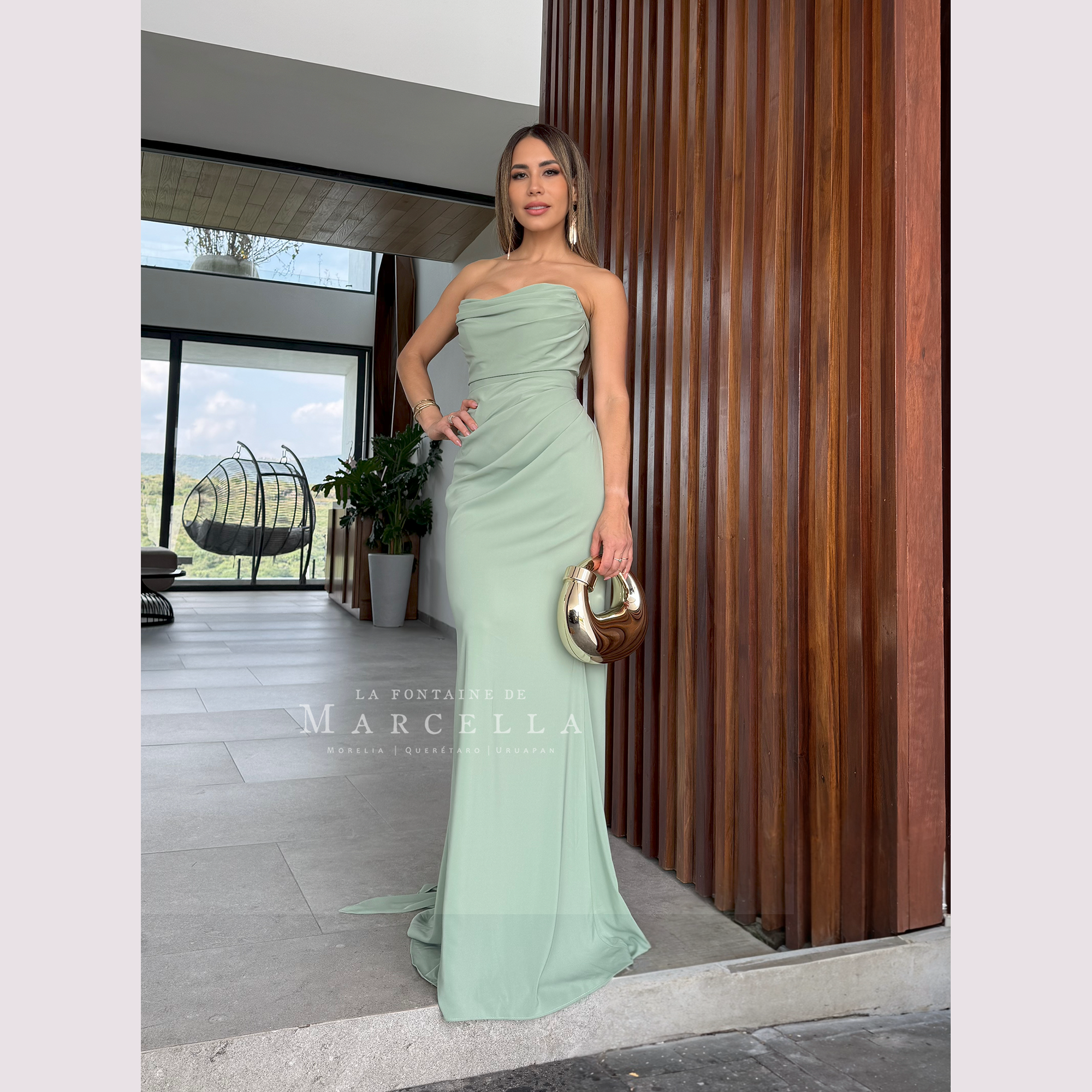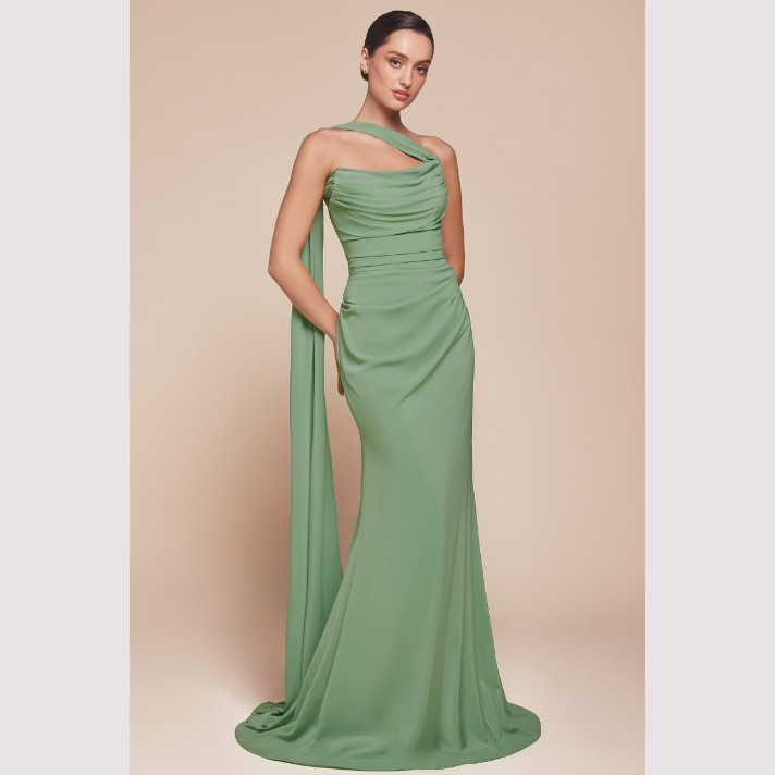 Vestido corte sirena con escote recto y pliegues, incluye pashmina.