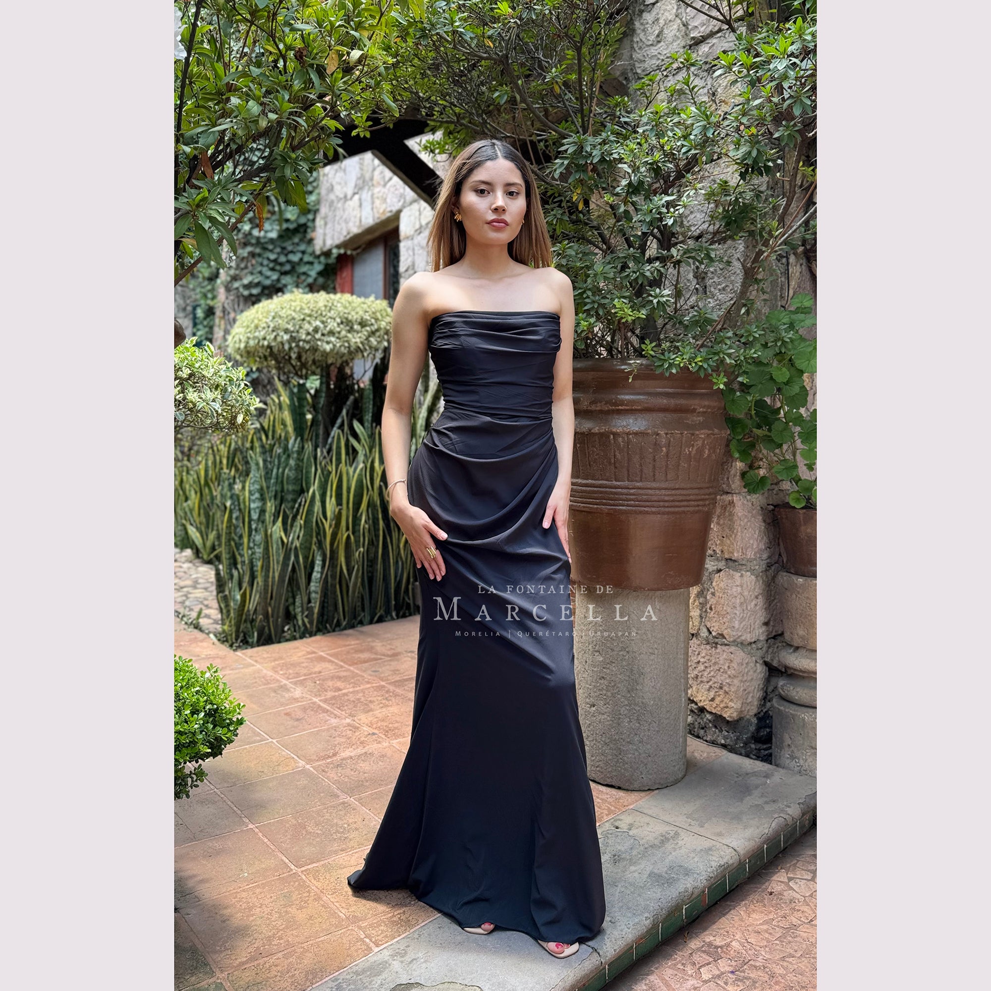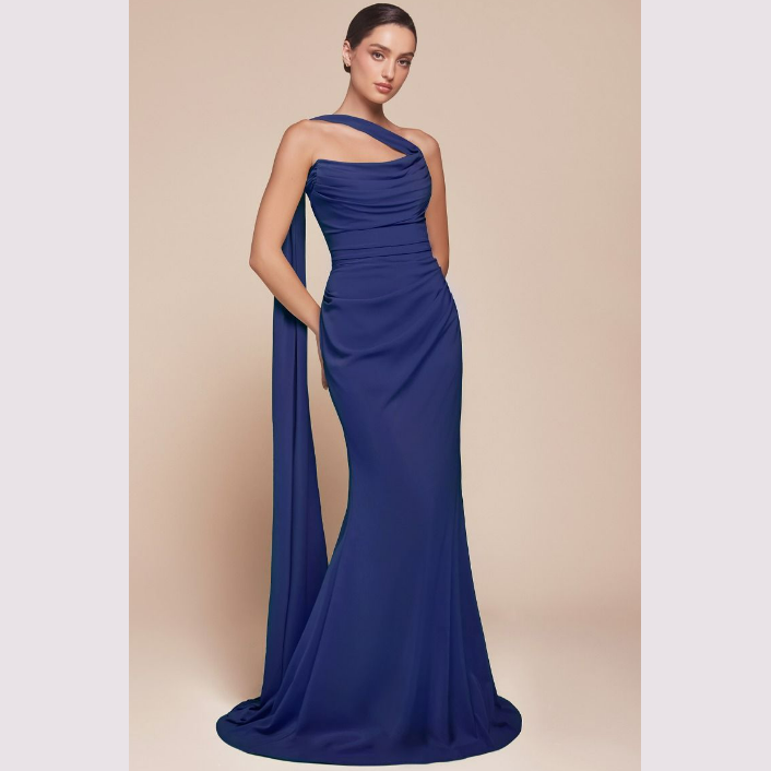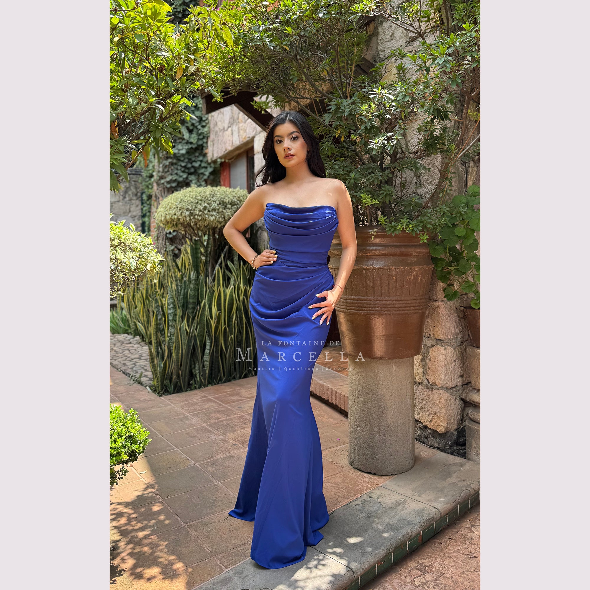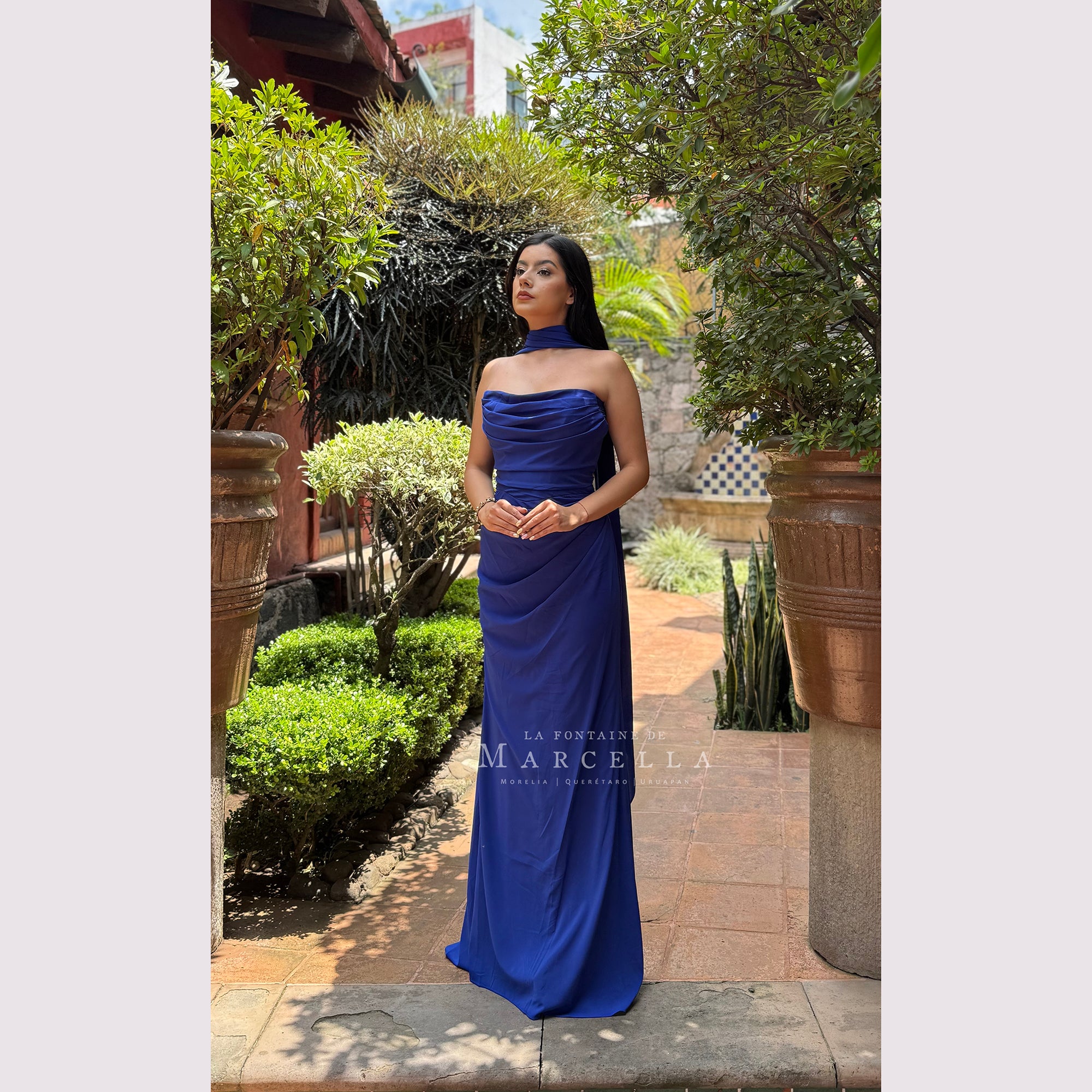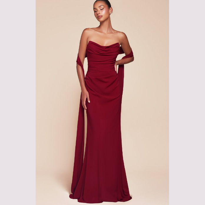 Vestido corte sirena con escote recto y pliegues, incluye pashmina. Recomendado para cuerpos tipo Reloj de Arena y Pera. Read more