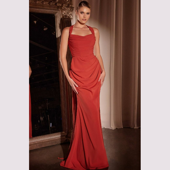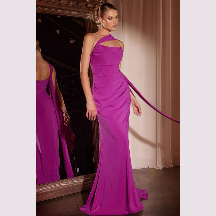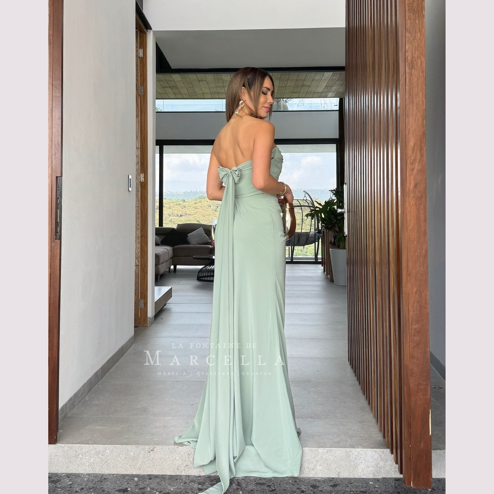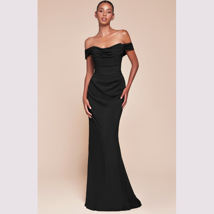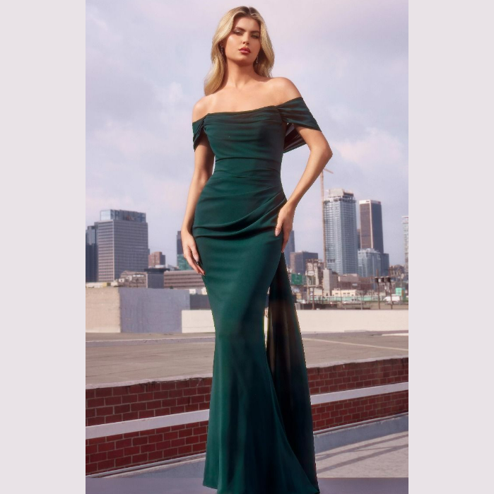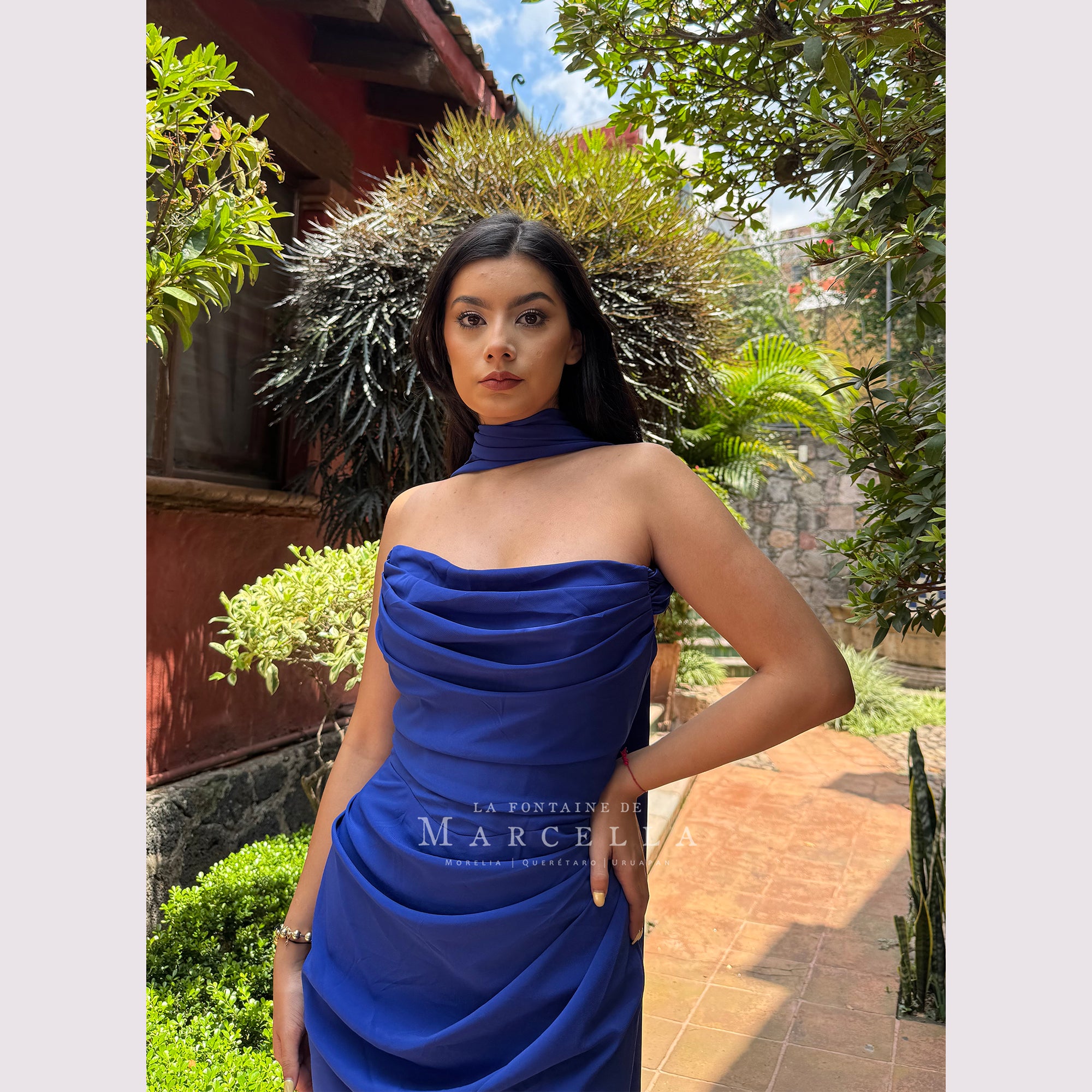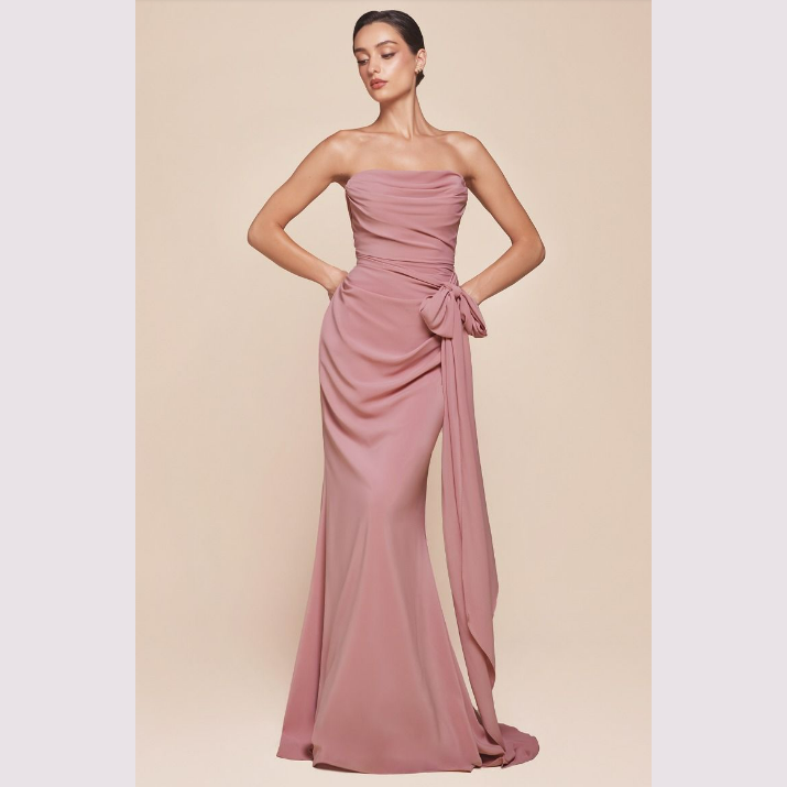 Vestido corte sirena con escote recto y pliegues, incluye pashmina. Recomendado para cuerpos tipo Reloj de Arena y Pera. Read more