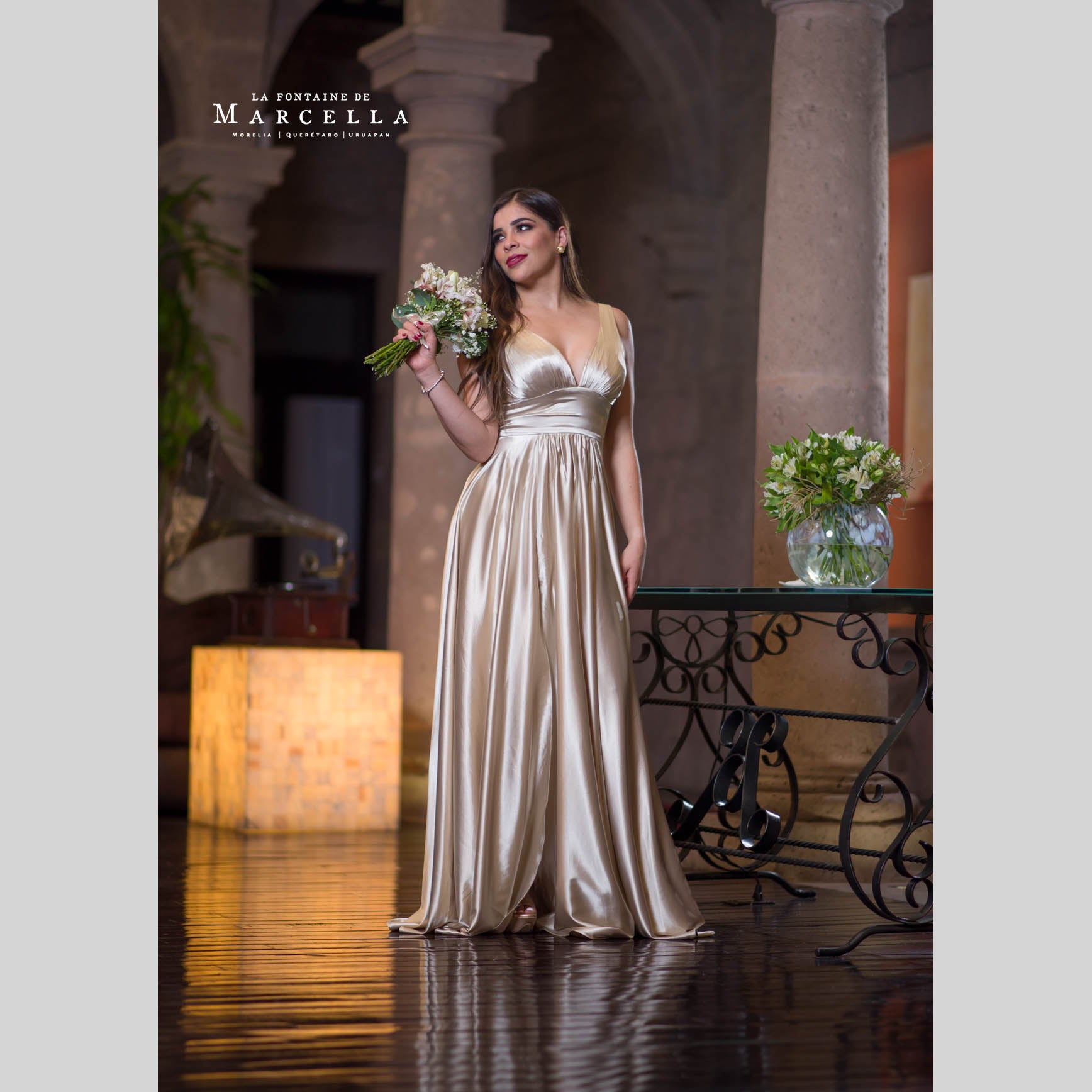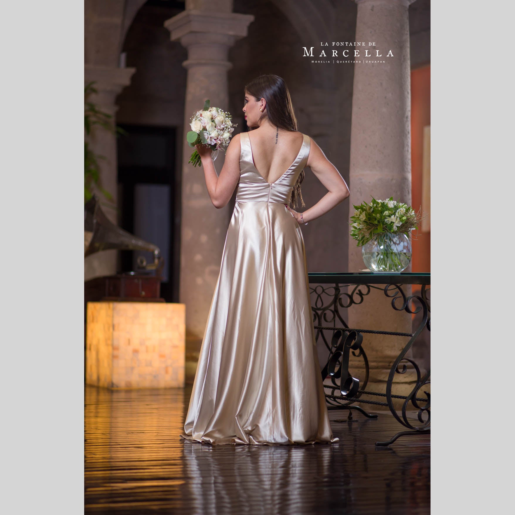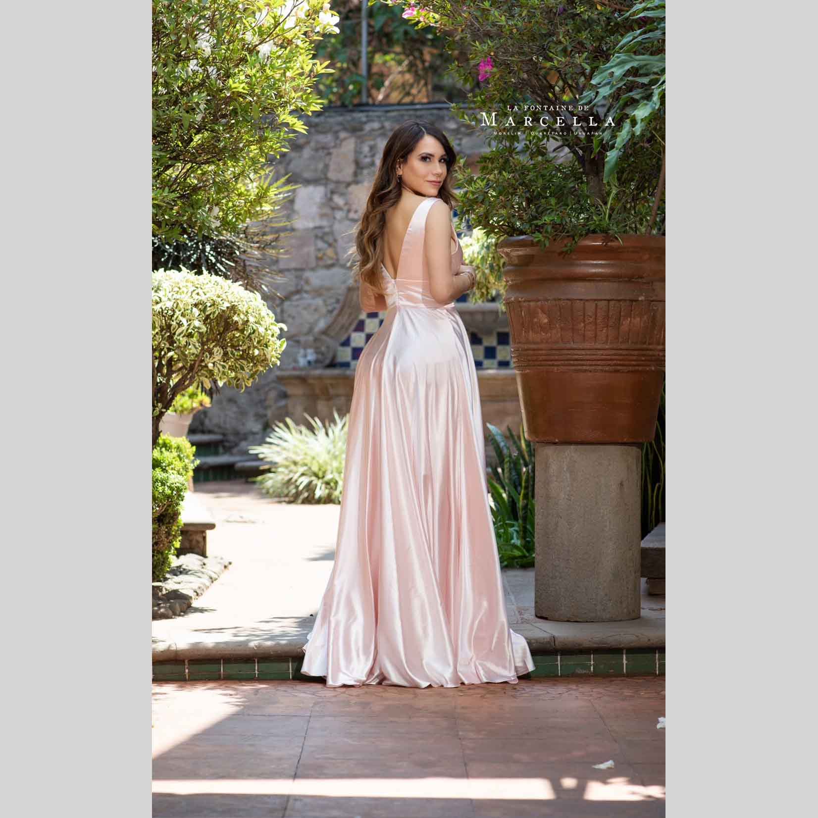 Vestido en tela satinada, espalda en V, liso con abertura en pierna, Corte A. Ideal para todo tipo de cuerpo.