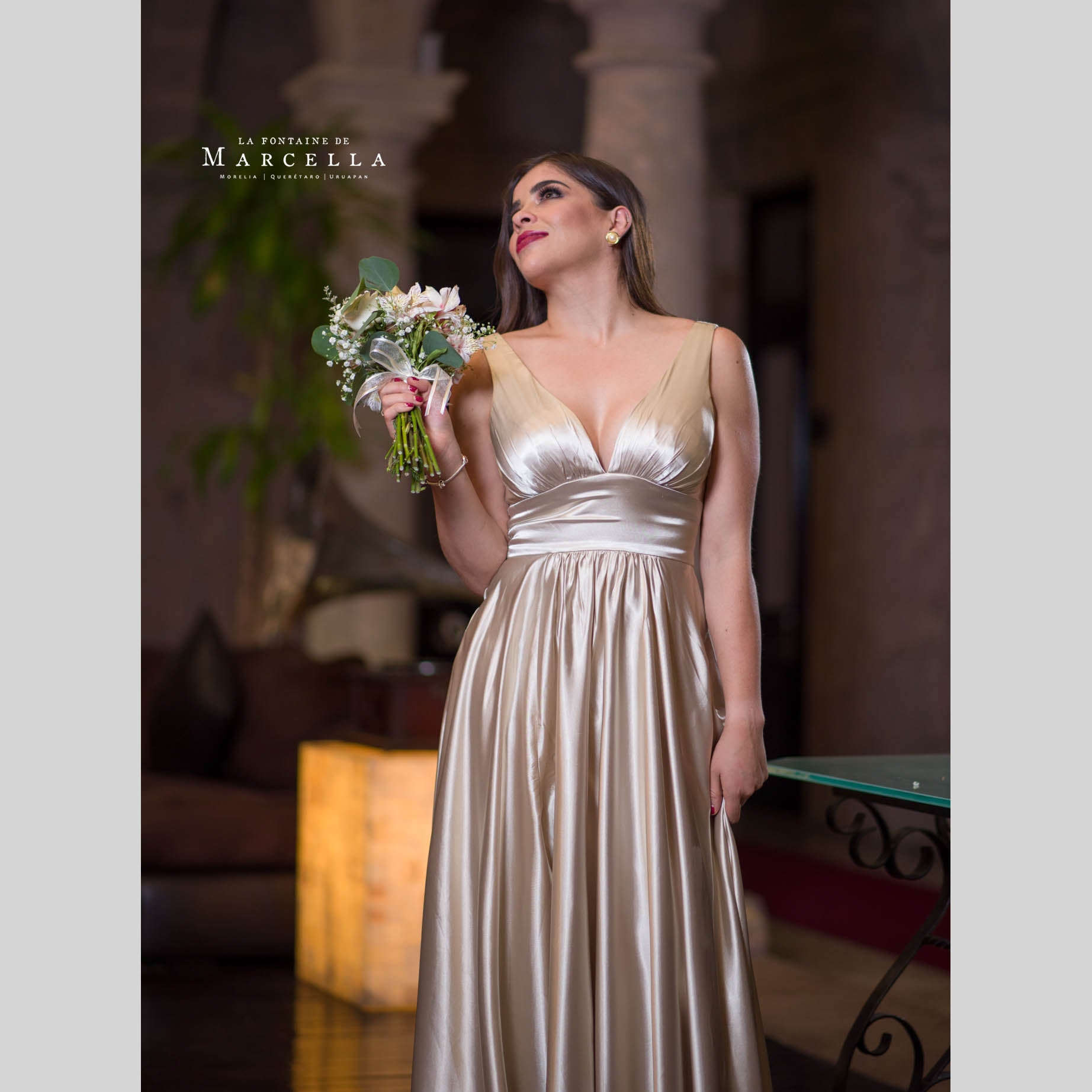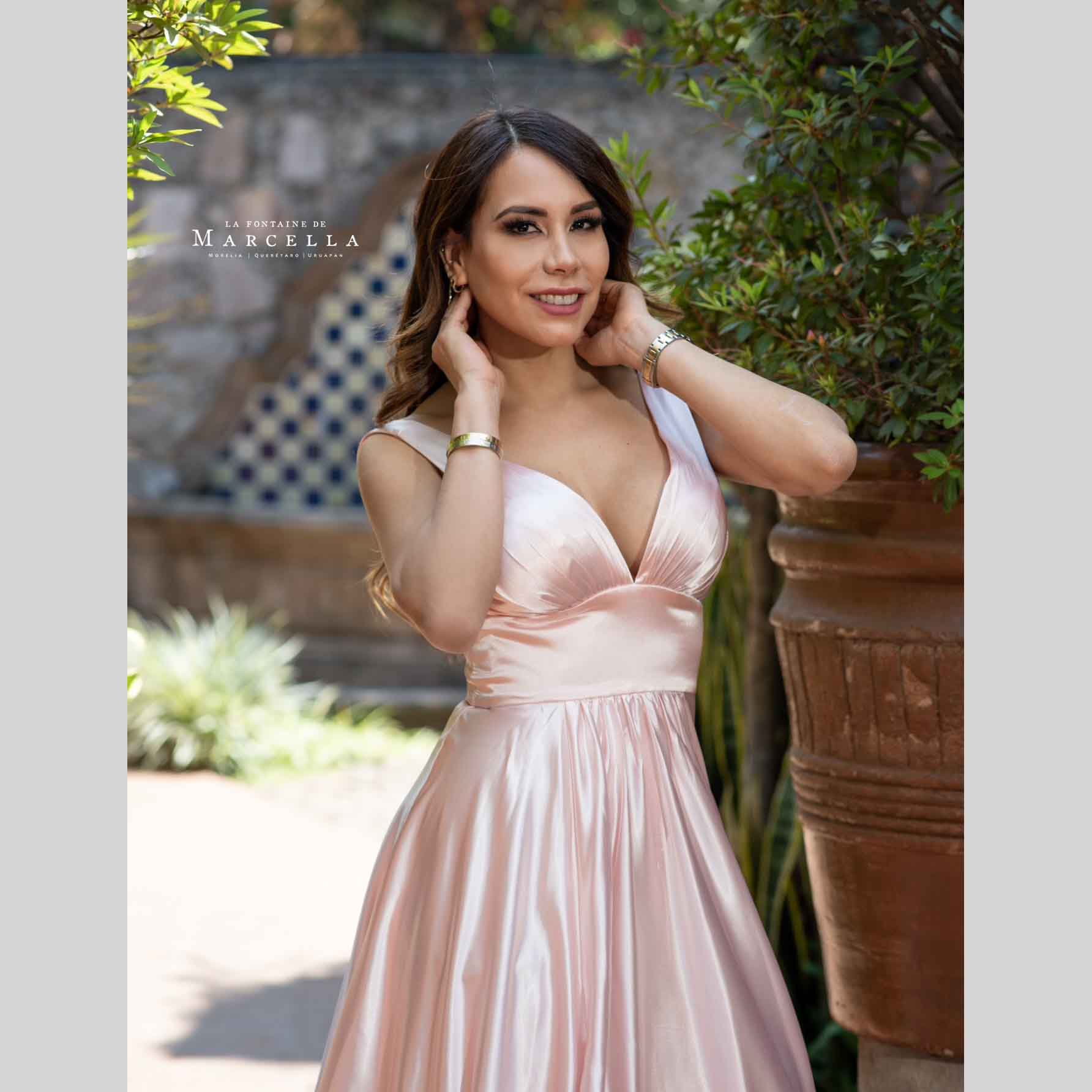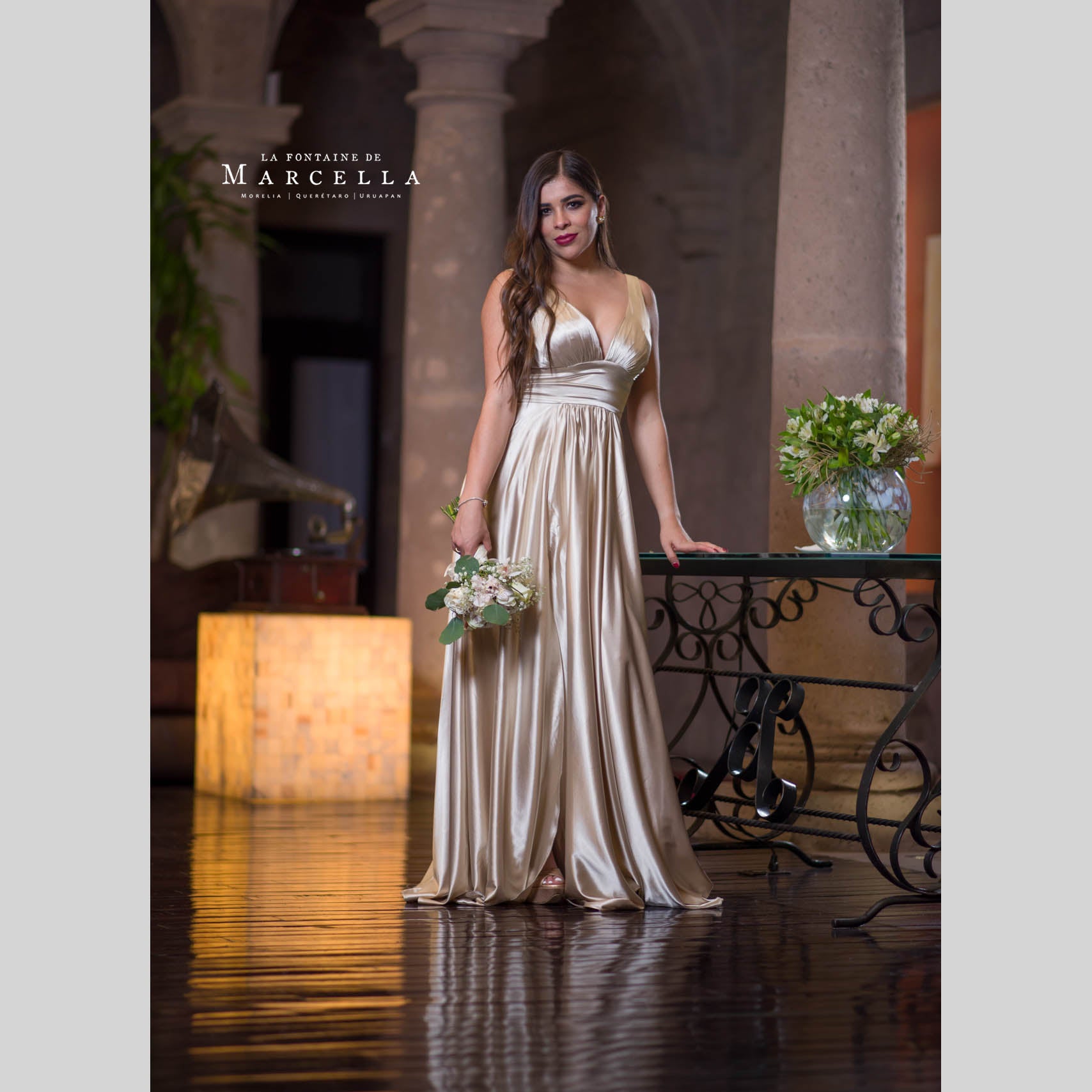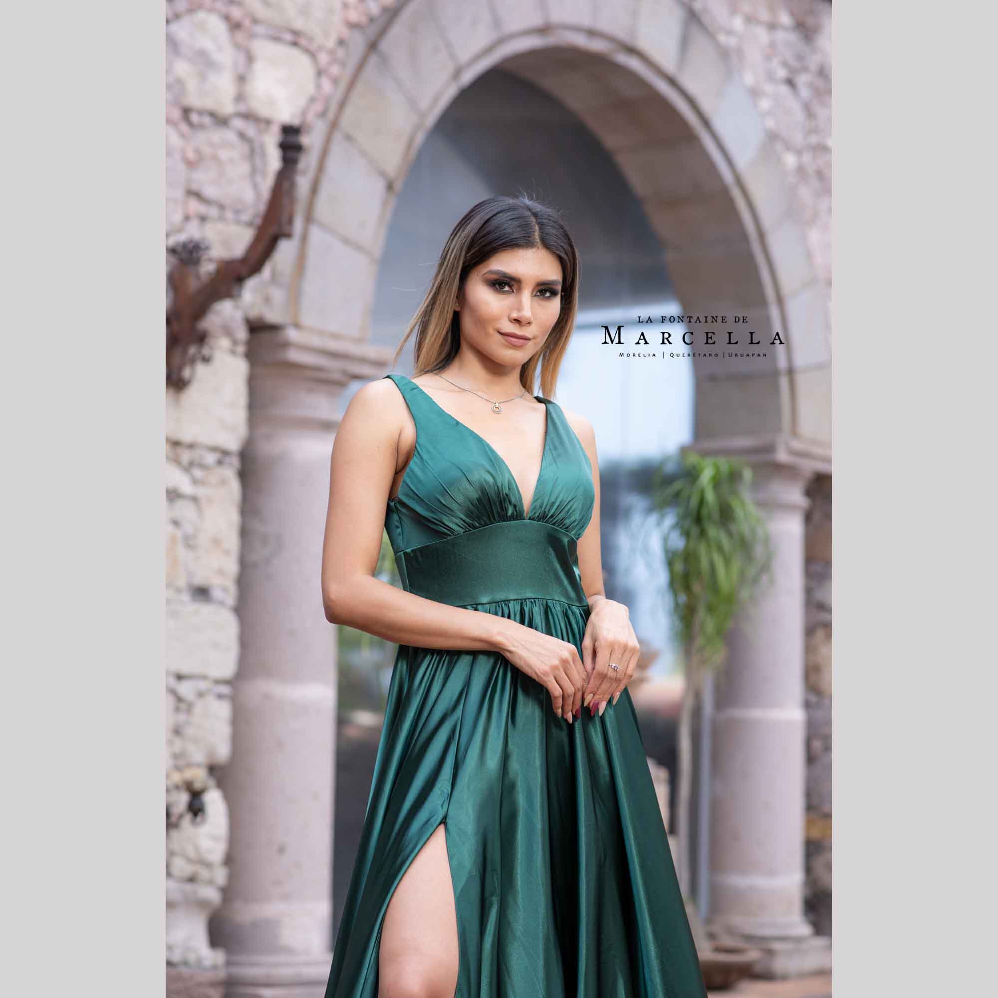 Vestido en tela satinada, espalda en V, liso con abertura en pierna, Corte A. Ideal para todo tipo de cuerpo.
