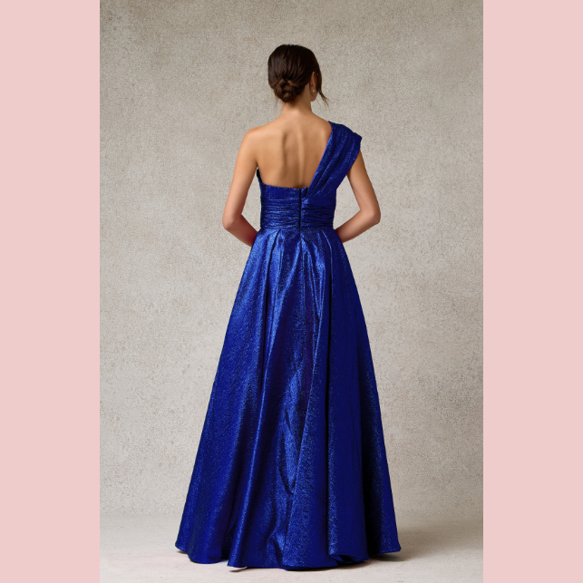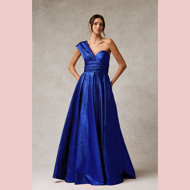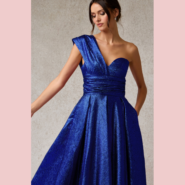 Vestido corte en A de escote corazón y con un solo hombro, es recomendado para cuerpos tipo Rectángulo y Triangulo Invertido.
