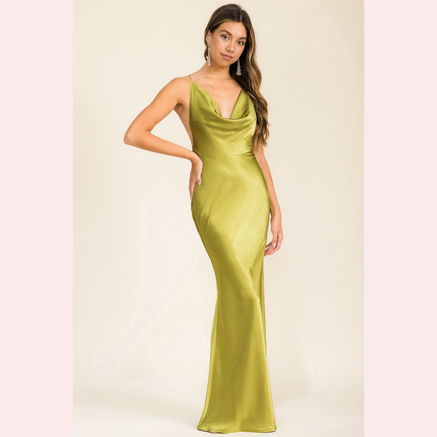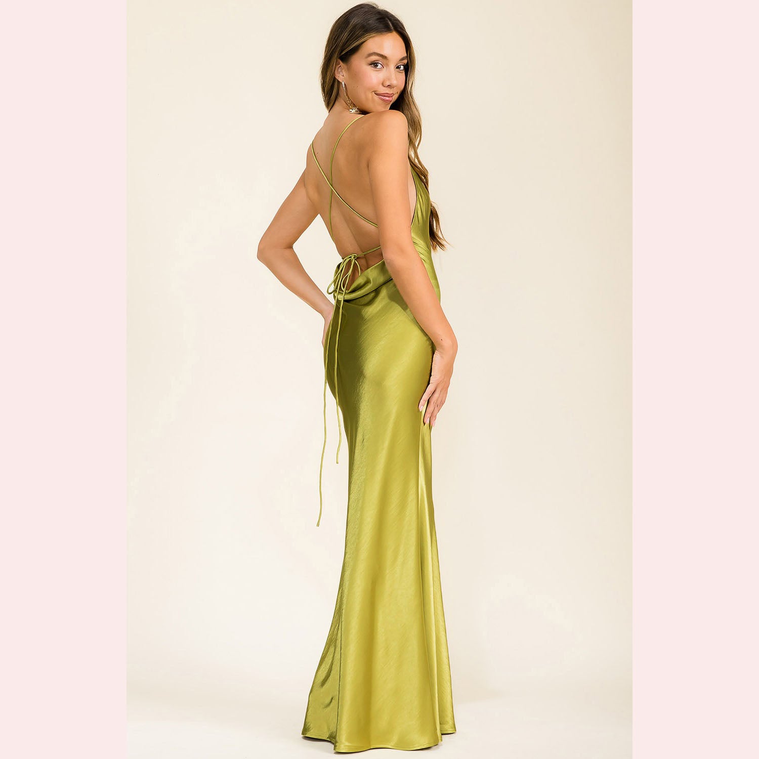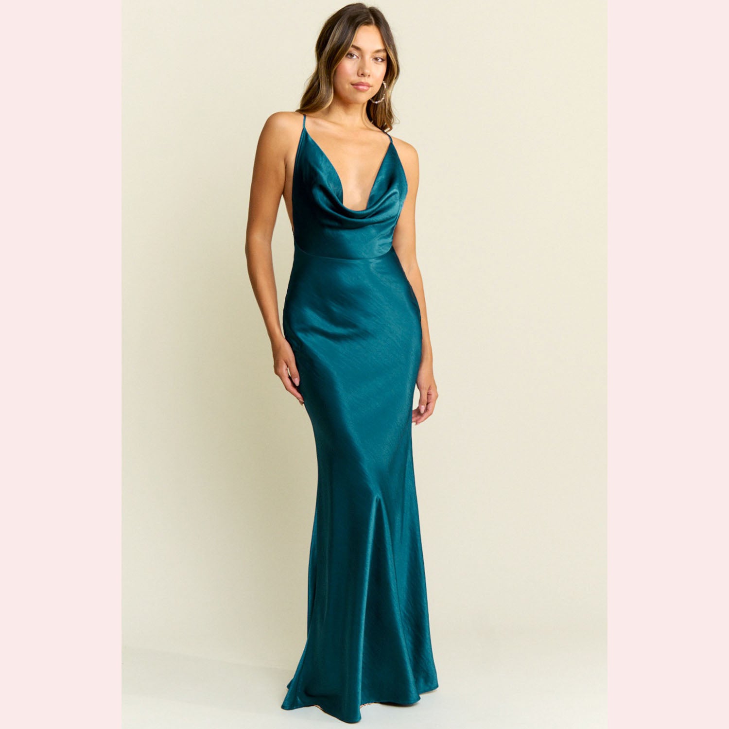 Vestido corte sirena con escote en U y espalda descubierta, es recomendado para cuerpos tipo Reloj de Arena y Pera.