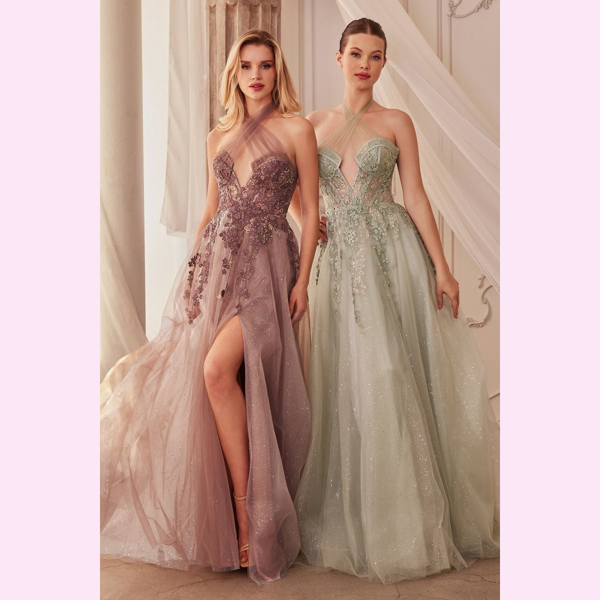 Vestido corte en A con cuello halter , recomendado para cuerpos tipo Rectángulo y Pera.