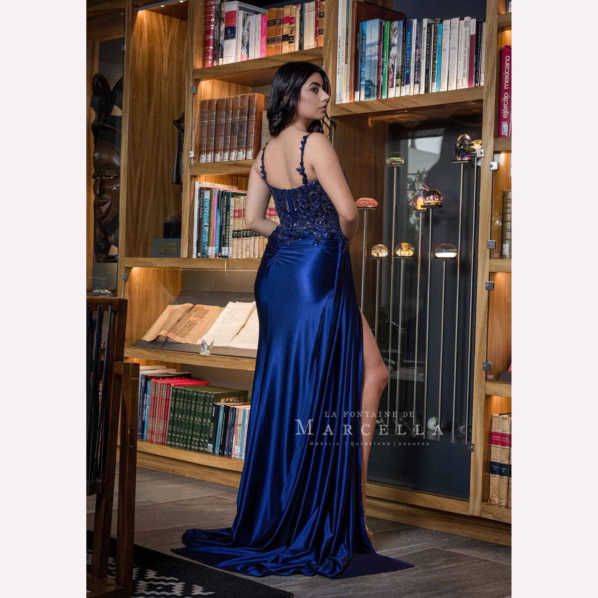 Vestido largo corte sirena con tirante delgado con aplicación, es recomendado para cuerpos tipo Reloj de Arena y Pera.Read more