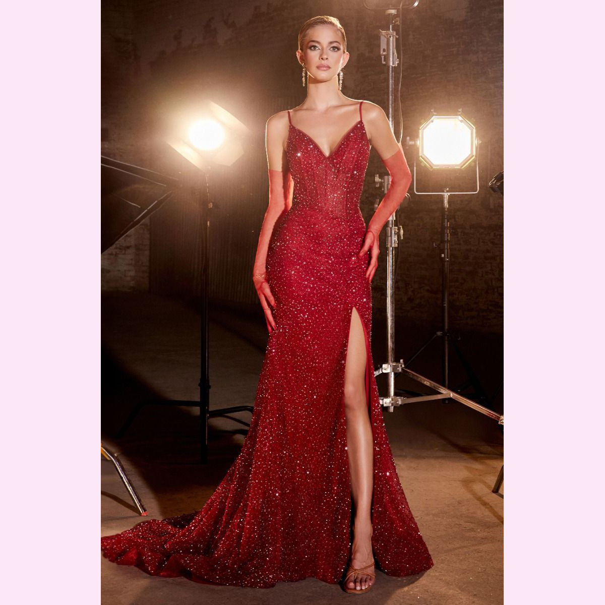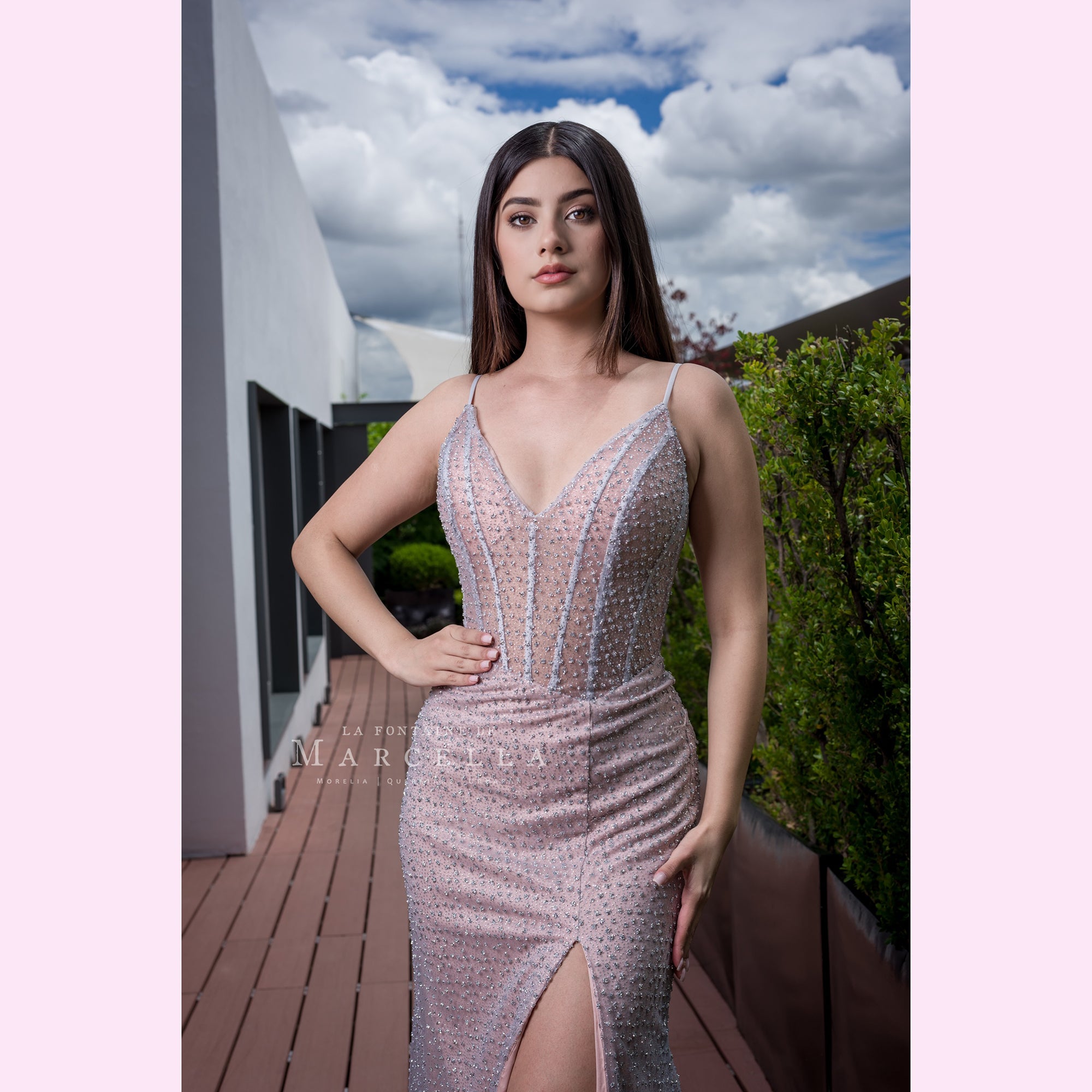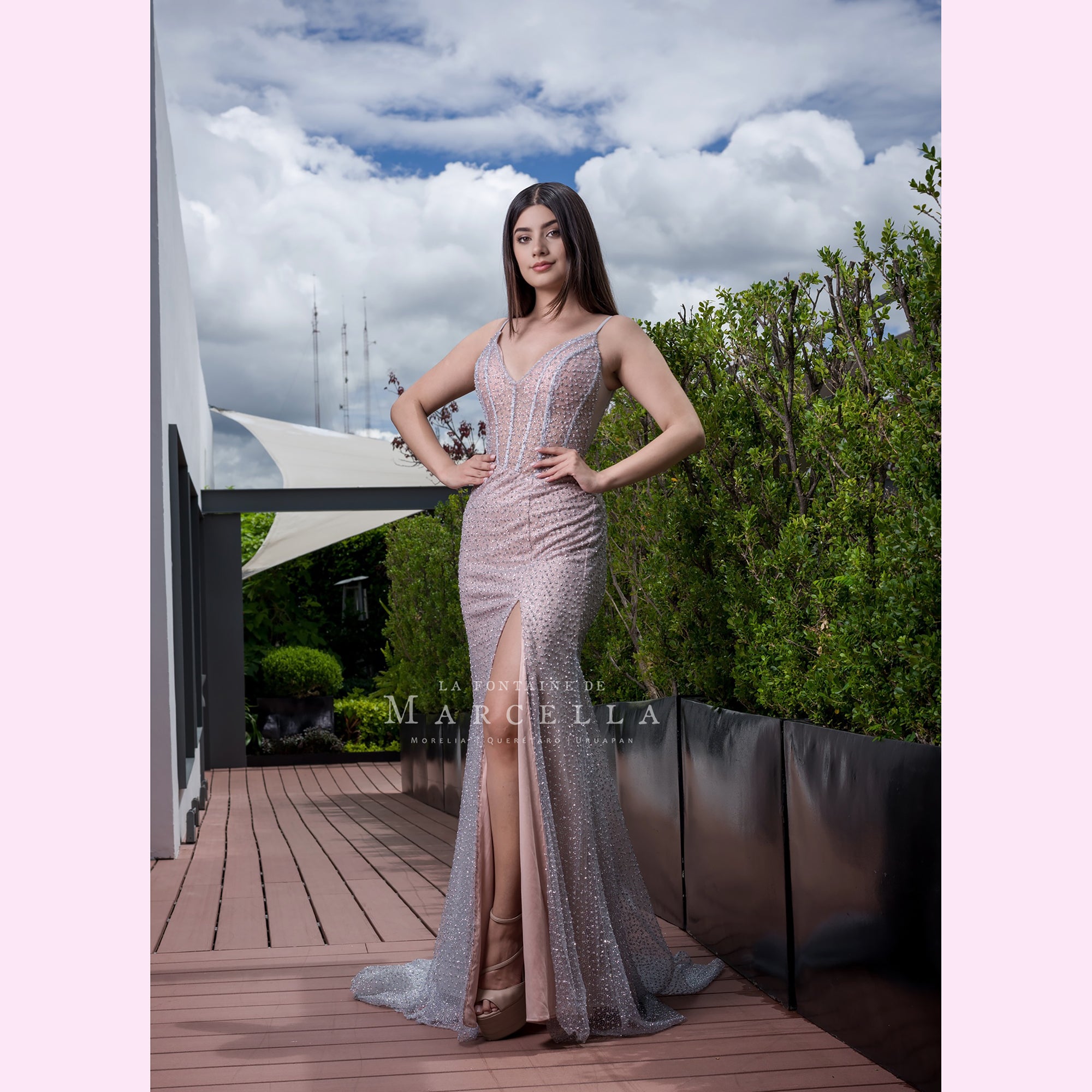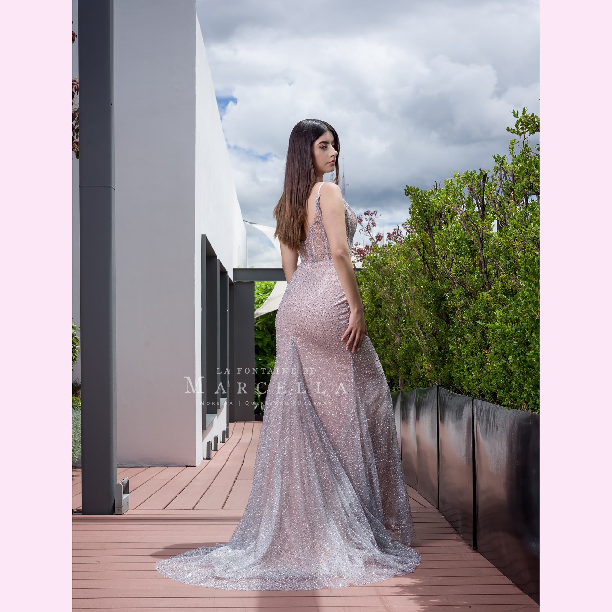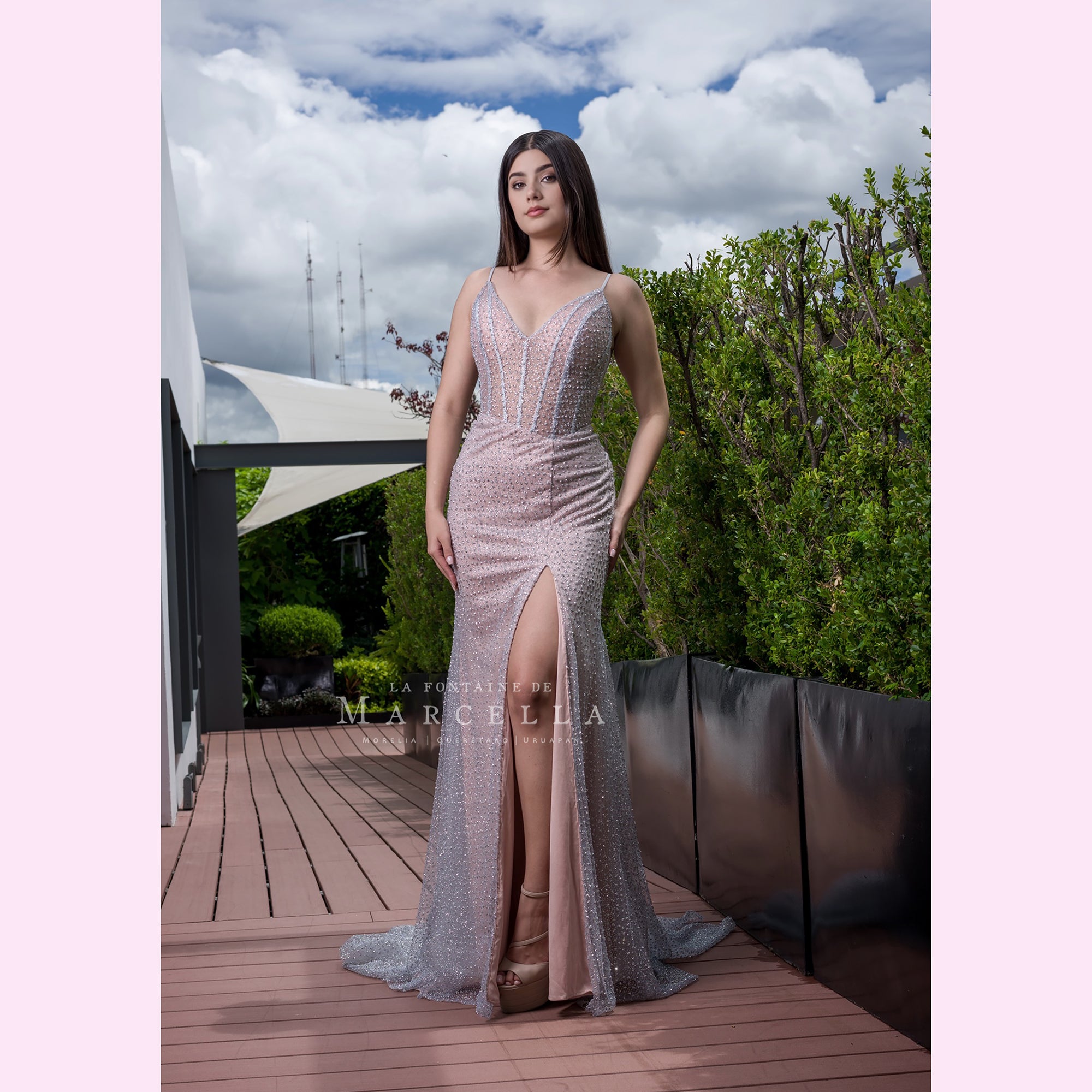 Vestido largo corte sirena con varilla y transparencia en la parte superior, es recomendado para cuerpos tipo Reloj de Arena y Pera.