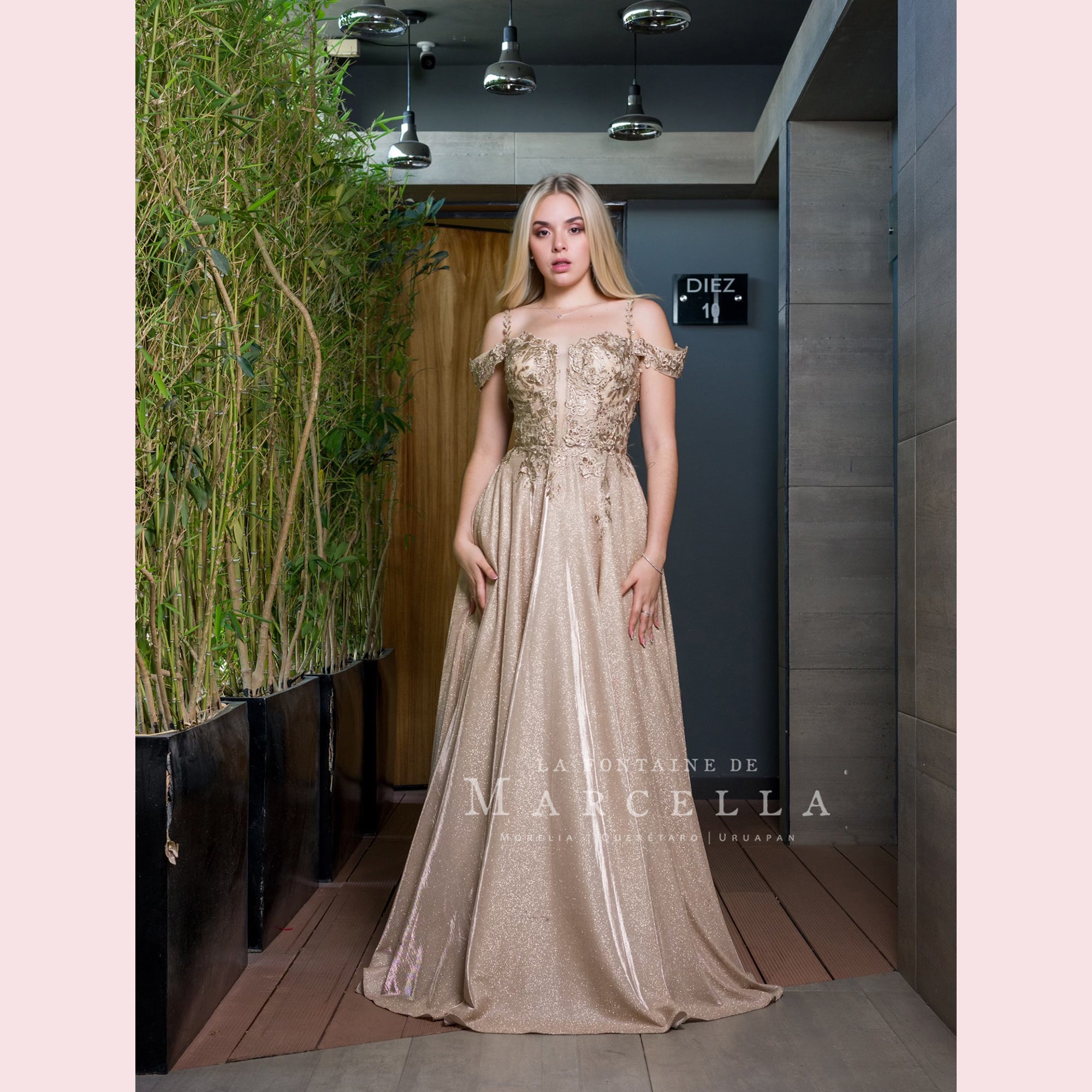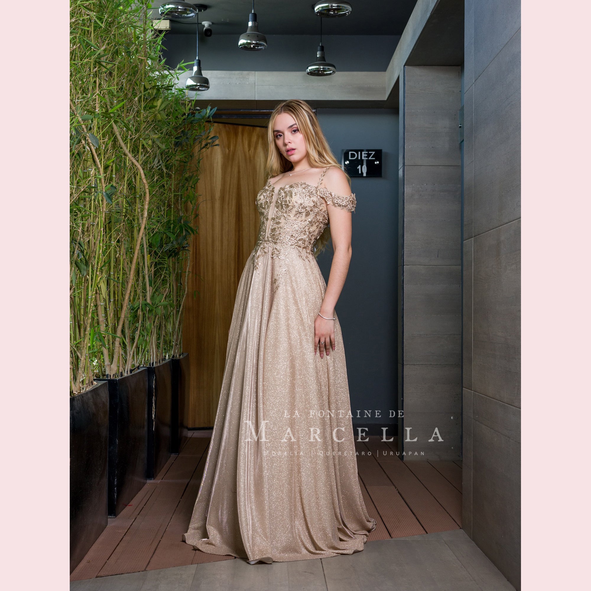 Vestido corte en A con aplicación en la parte superior y manga de ojal, es recomendado para cuerpos tipo Rectángulo y Triangulo Invertido.
