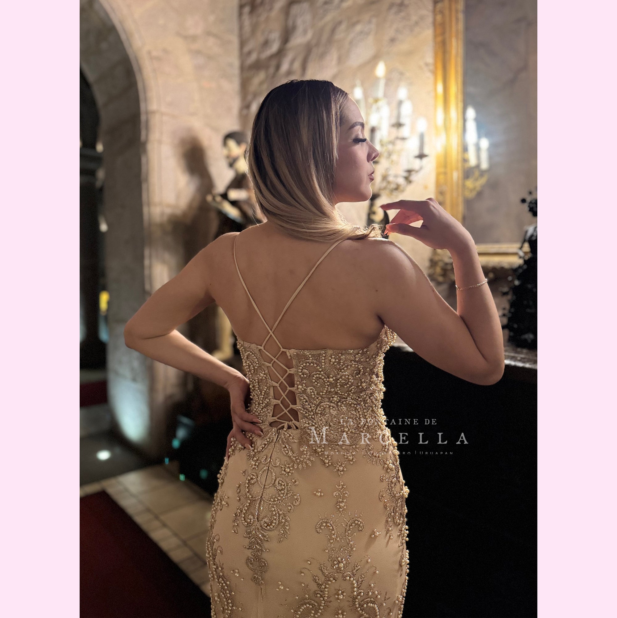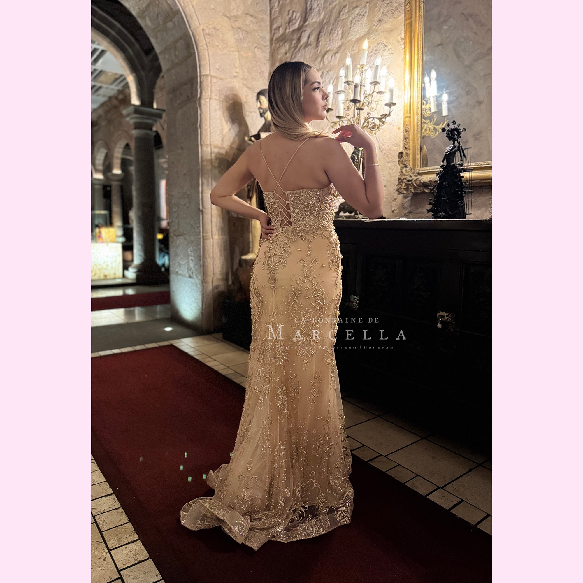 Vestido largo corte sirena adornado hermosamente con pedrería de fantasía, con tirante delgado y escote en V, es recomendado para cuerpos tipo Reloj de Arena y Pera.
