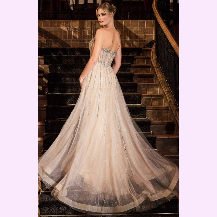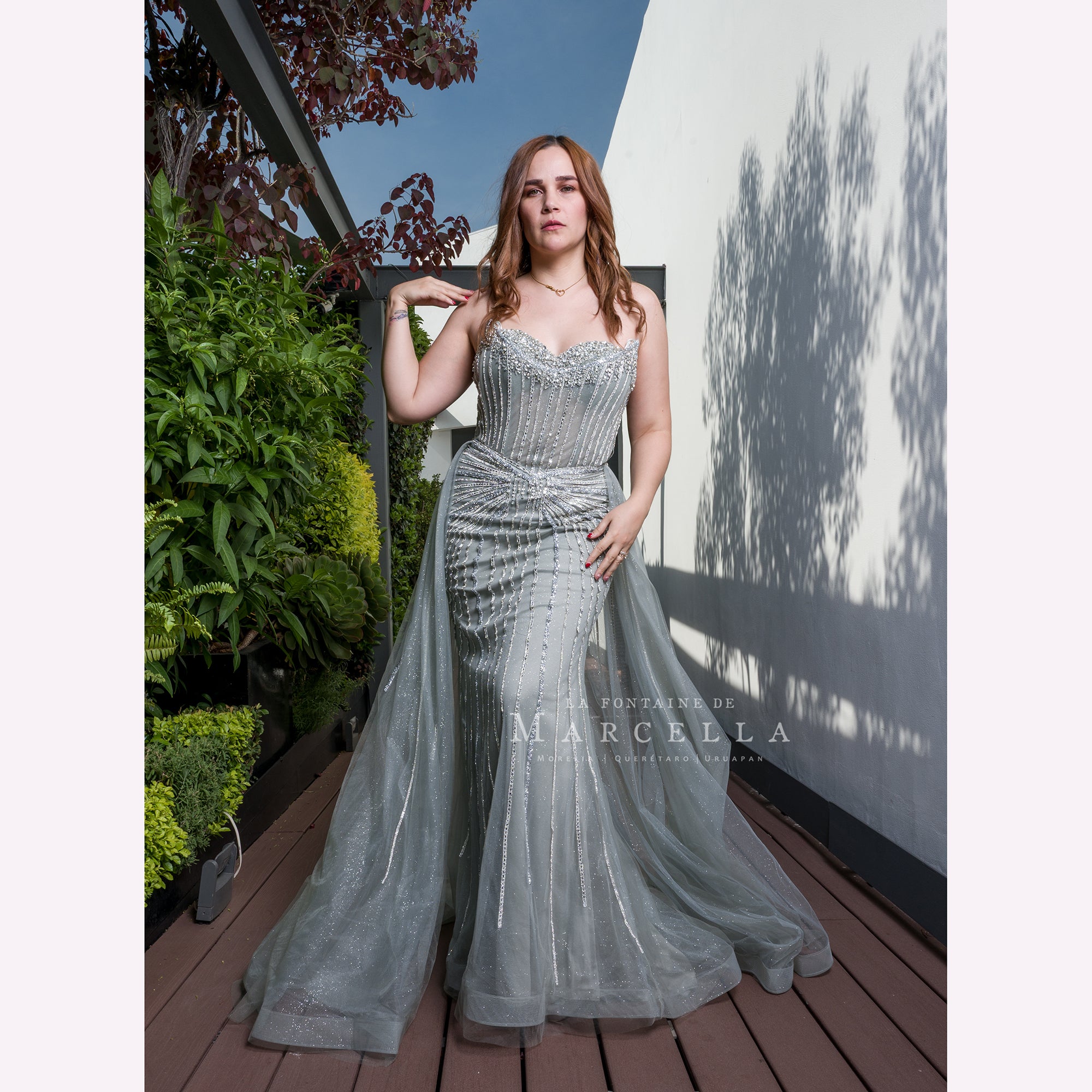 Vestido largo corte sirena con cauda externa, adornado con pedrería de fantasía, es recomendado para cuerpos tipo Triangulo Invertido y Rectángulo.Read more