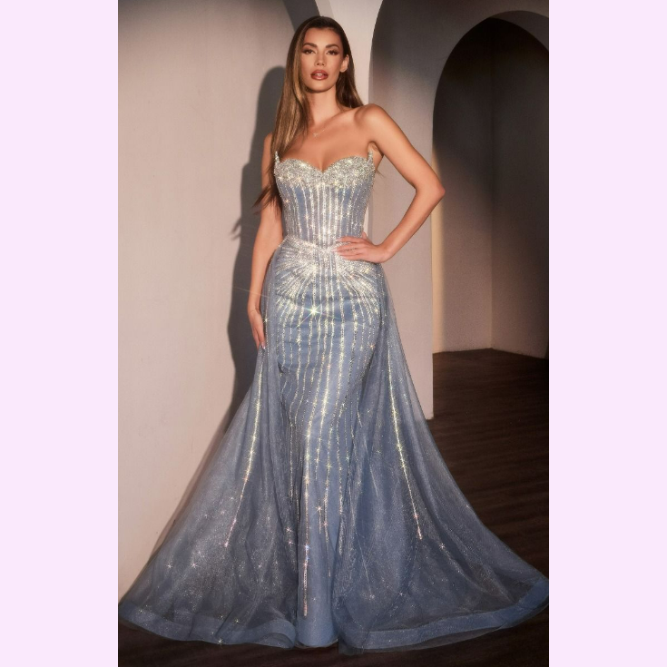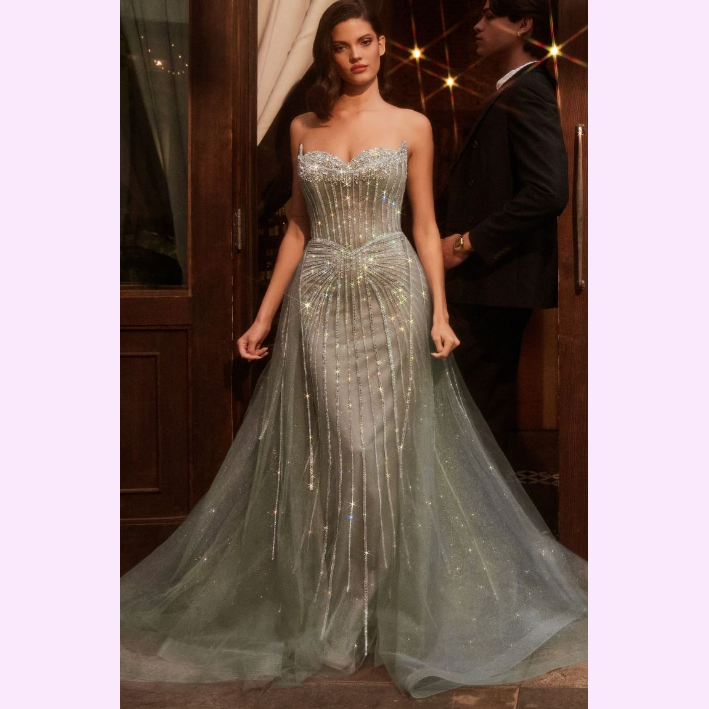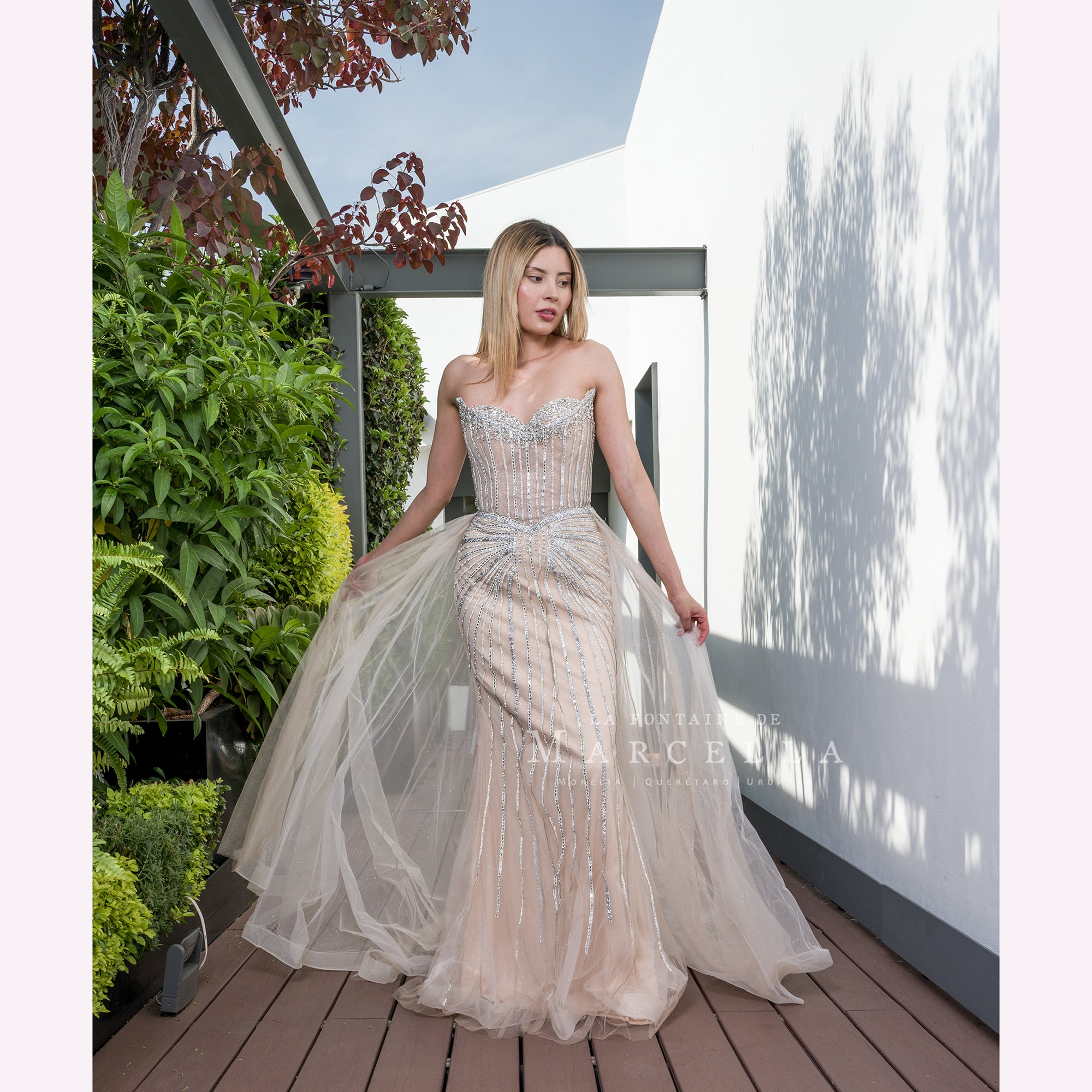 Vestido largo corte sirena con cauda externa, adornado con pedrería de fantasía, es recomendado para cuerpos tipo Triangulo Invertido y Rectángulo.