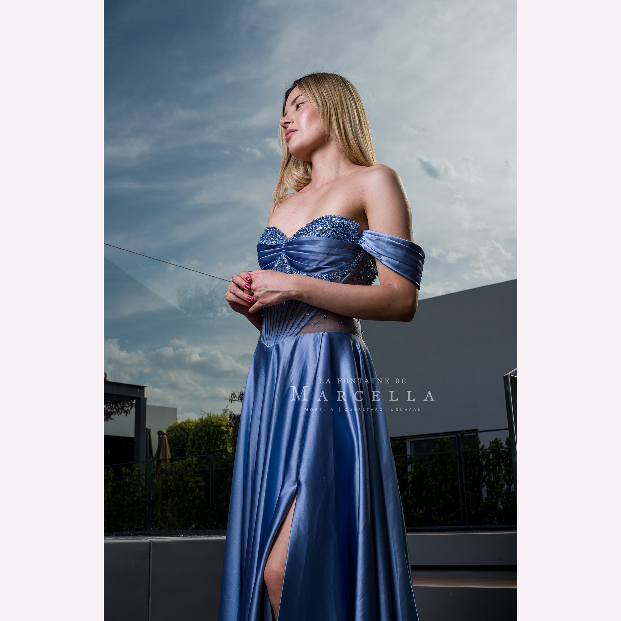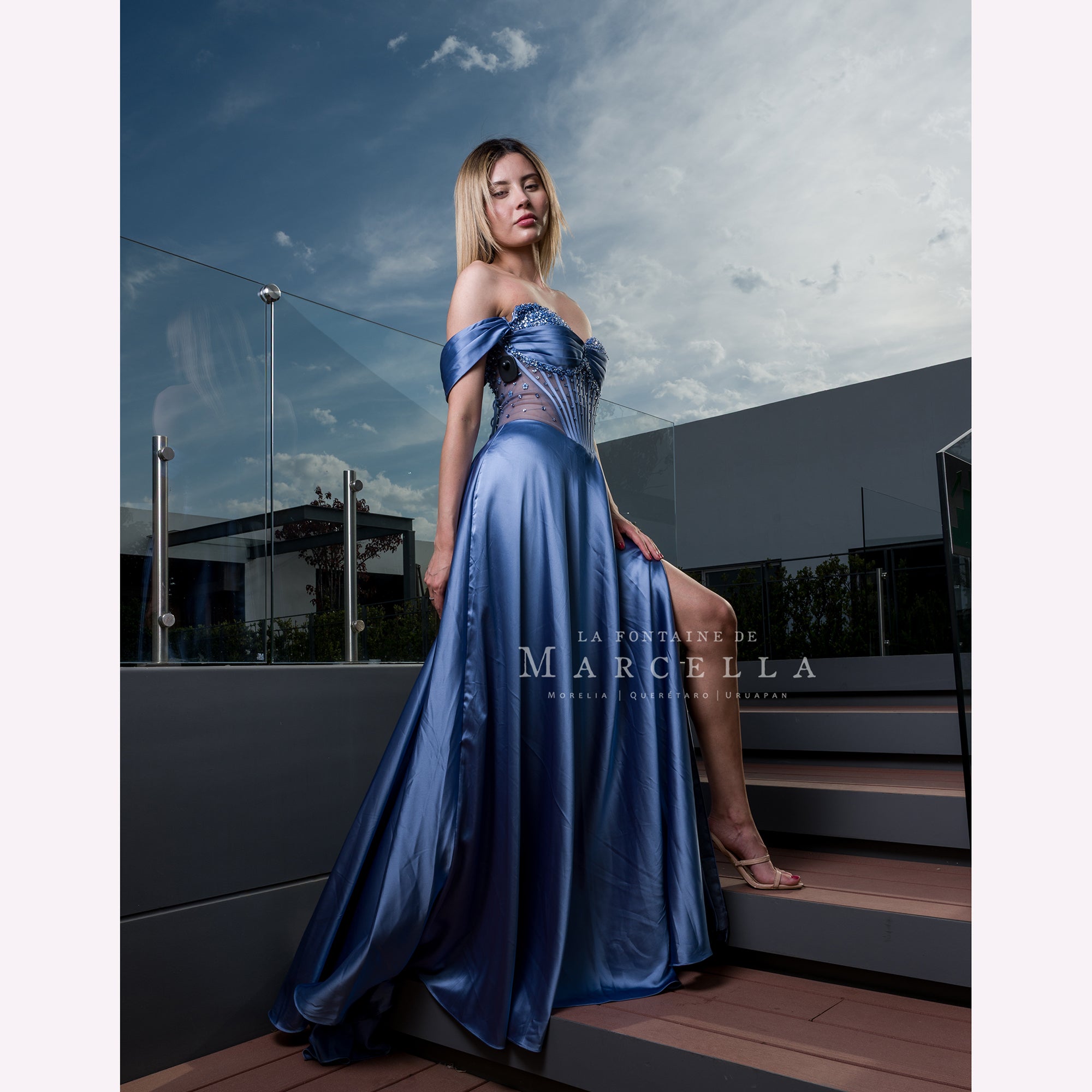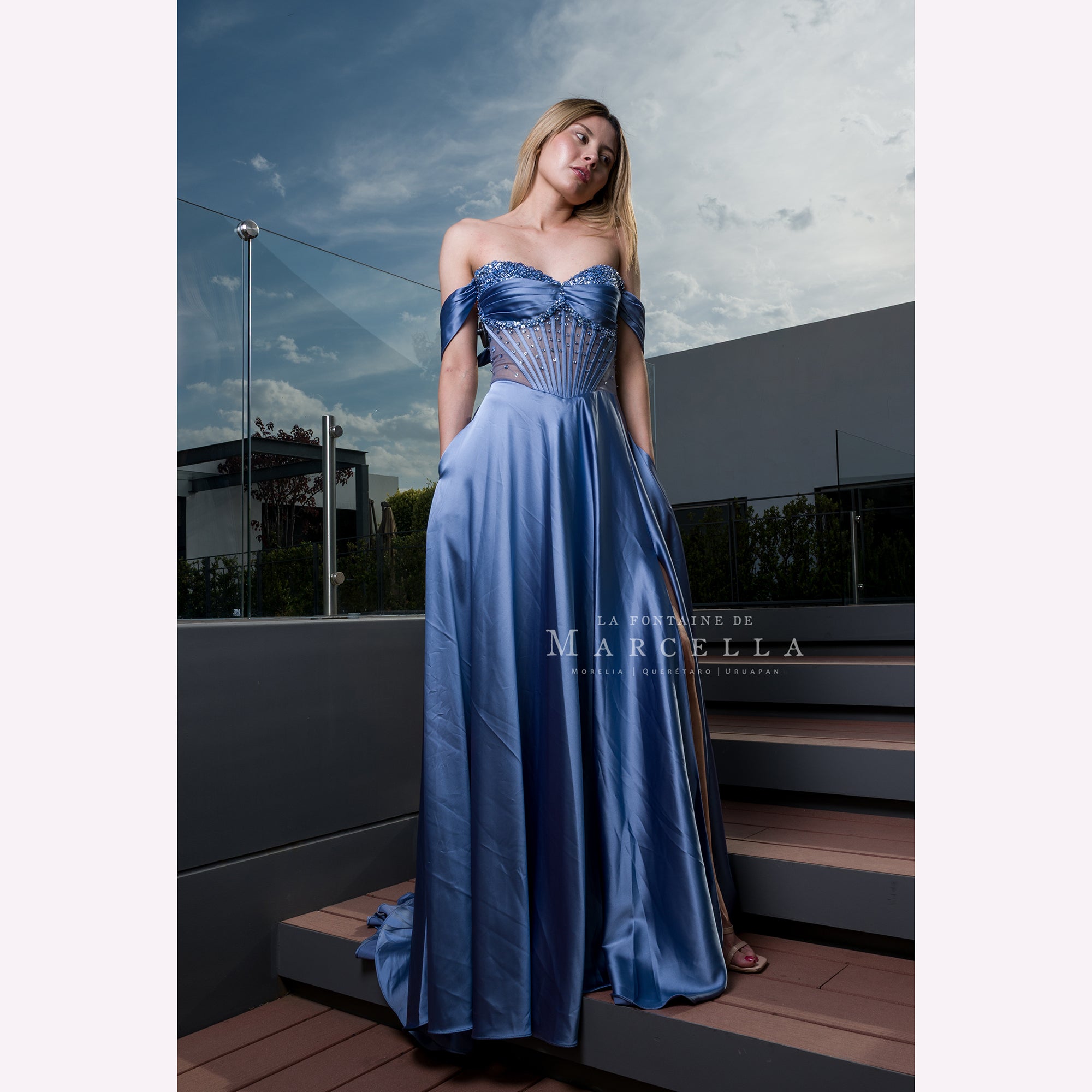 Vestido corte en A con manga de ojal desmontable y transparencia en la parte superior, es recomendado para cuerpos tipo Rectángulo, Manzana y Triangulo Invertido,