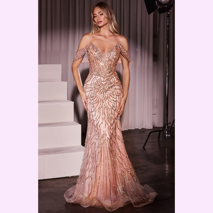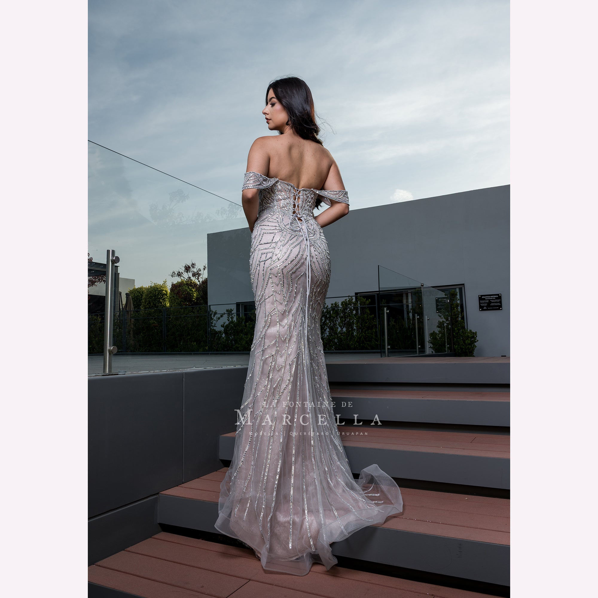 Vestido corte sirena con maga de ojal y escote corazón, adornado hermosamente con pedrería de fantasía, es recomendado para cuerpos tipo Reloj de Arena y Pera.