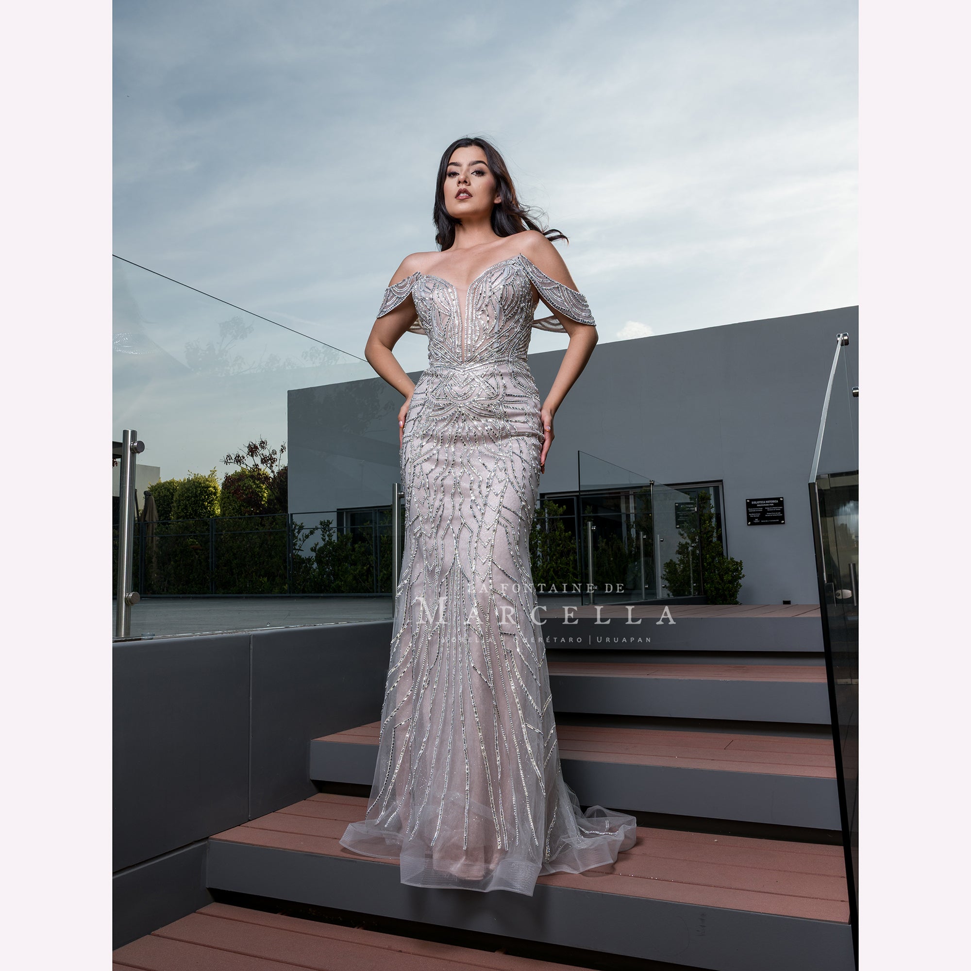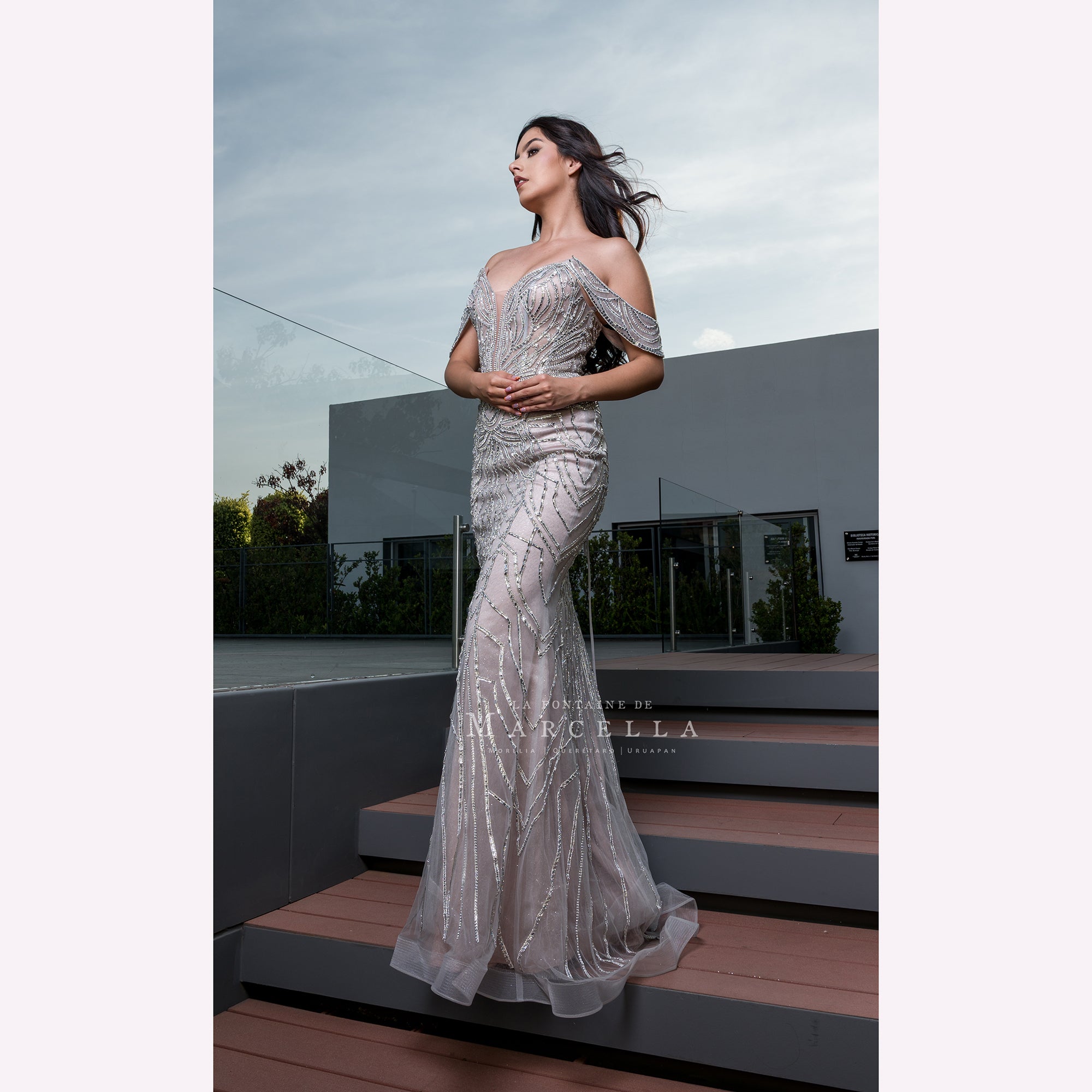 Vestido corte sirena con maga de ojal y escote corazón, adornado hermosamente con pedrería de fantasía, es recomendado para cuerpos tipo Reloj de Arena y Pera. Read more