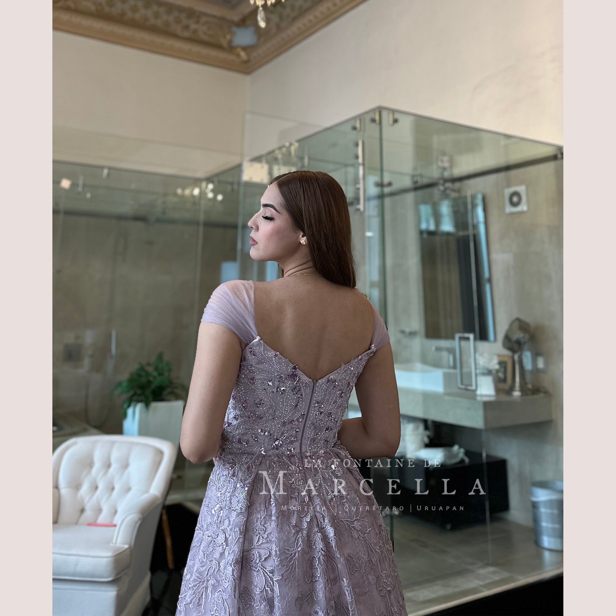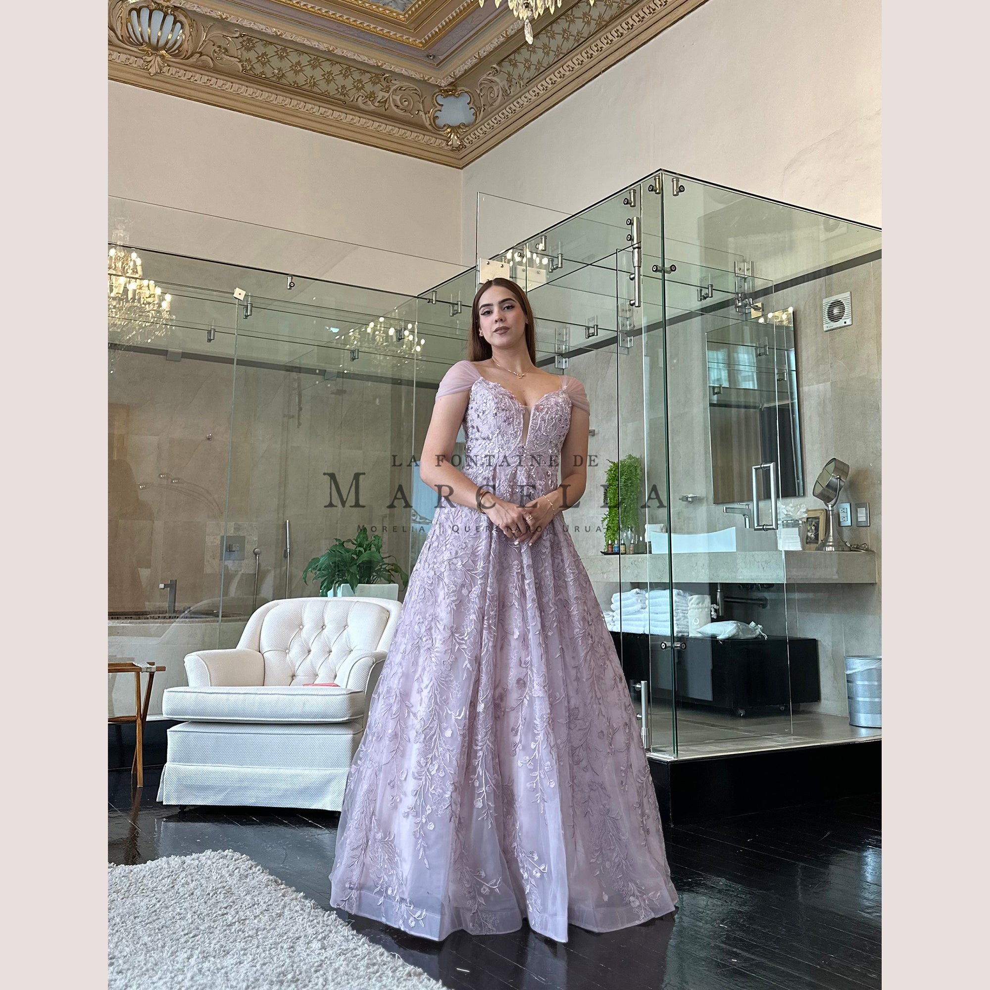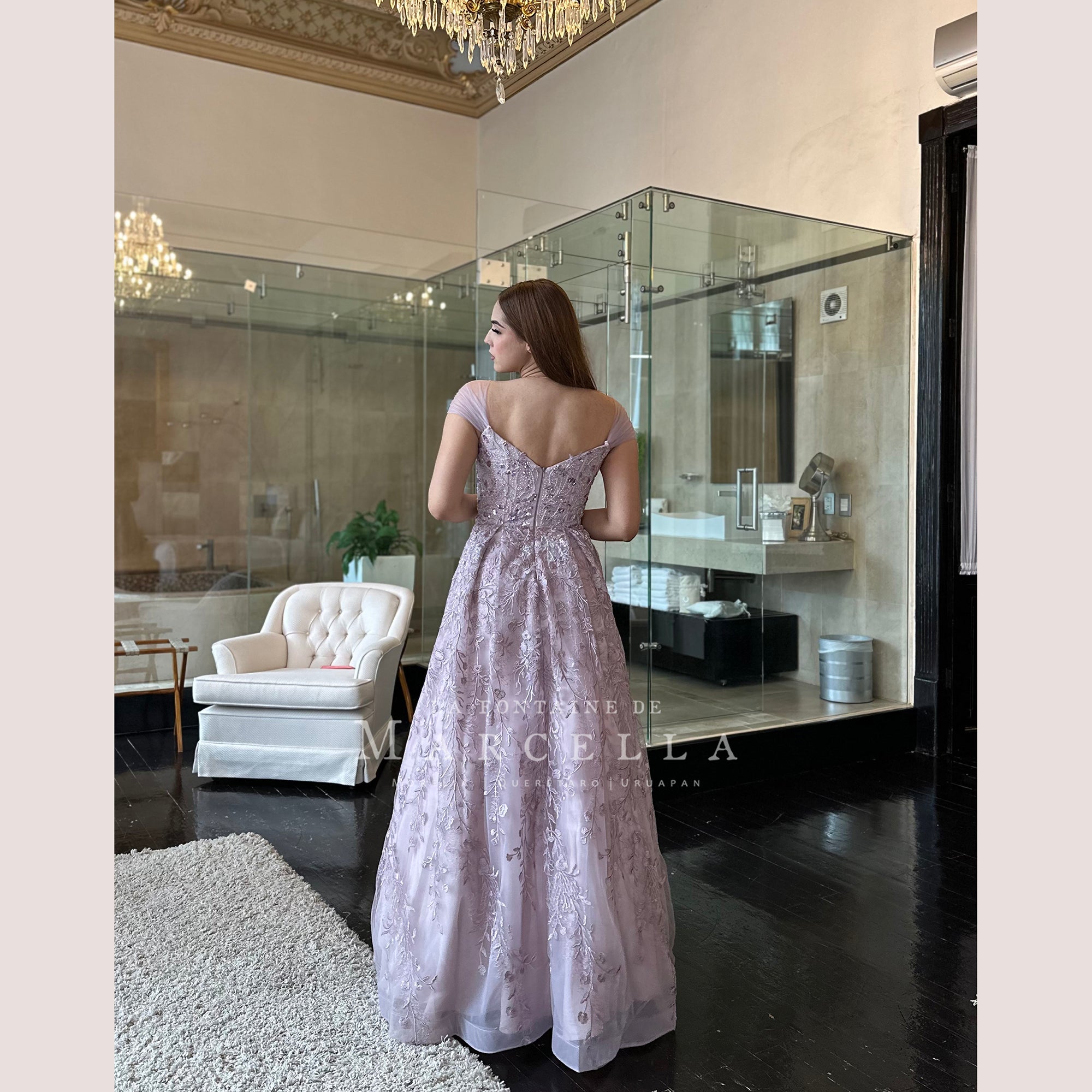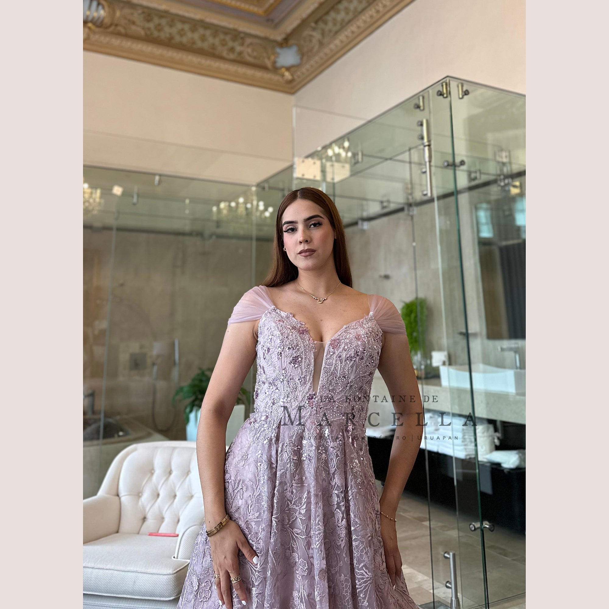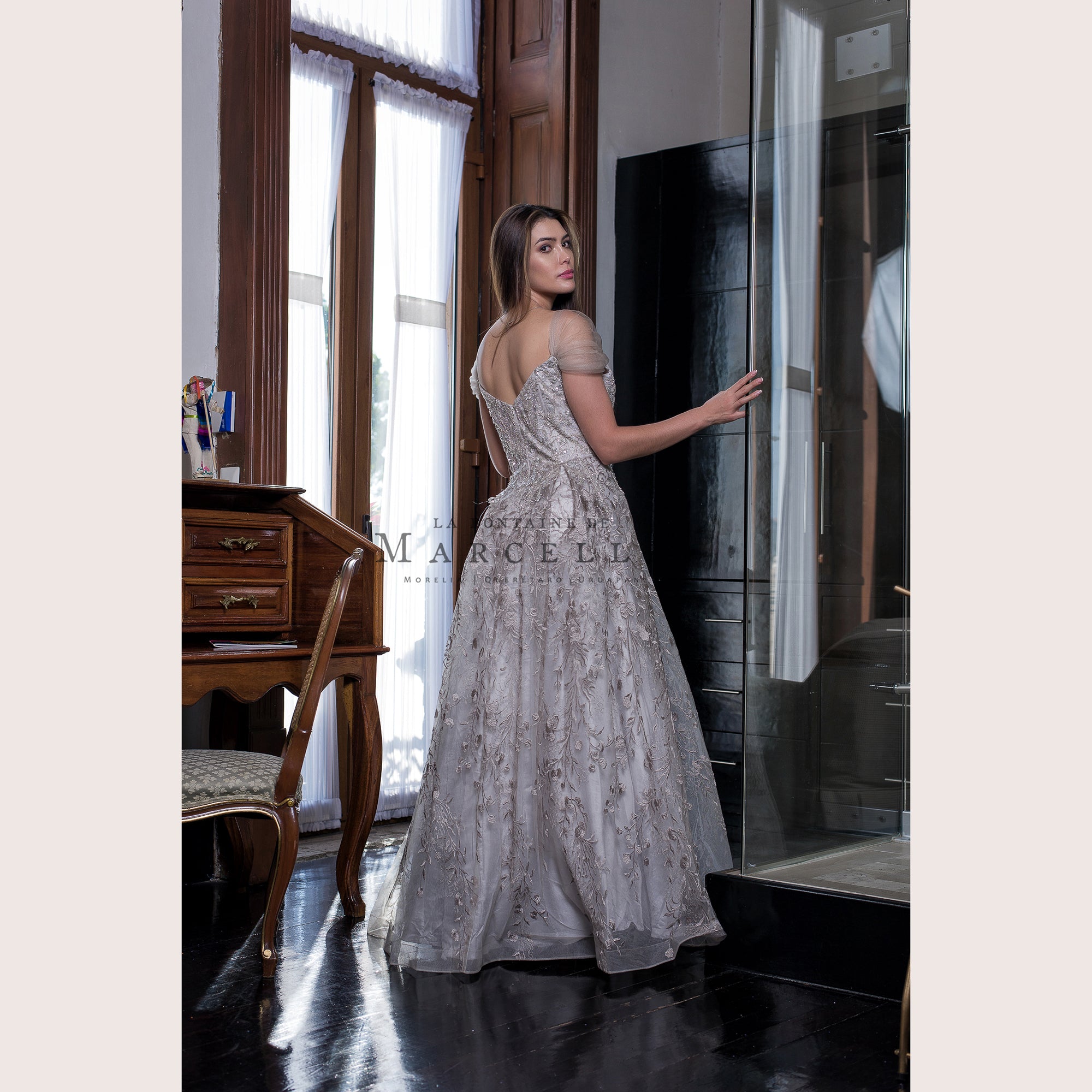 Vestido largo corte princesa con relieve floral en la tela, con manga de tul es recomendado para cuerpos tipo Rectángulo y Triangulo Invertido.Read more