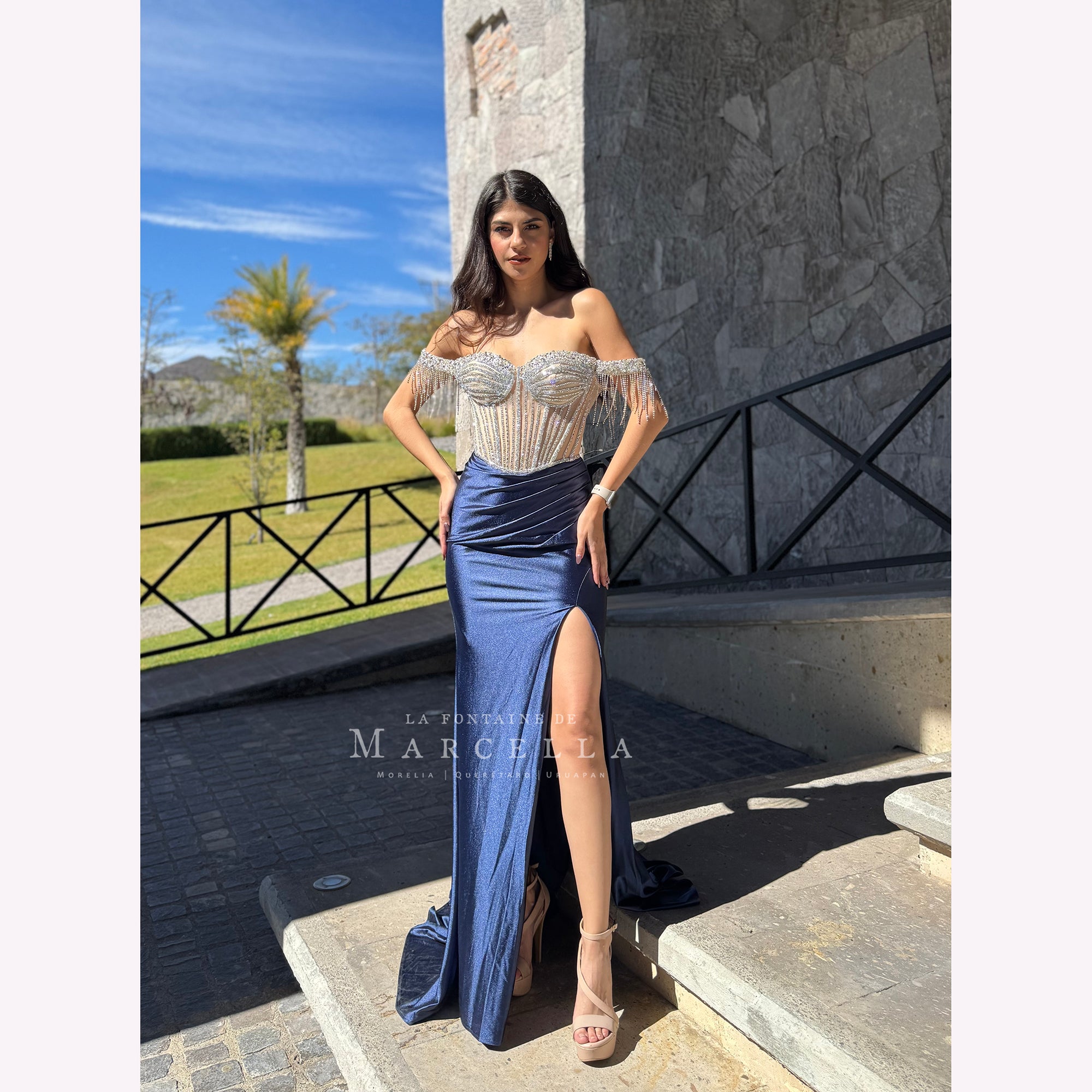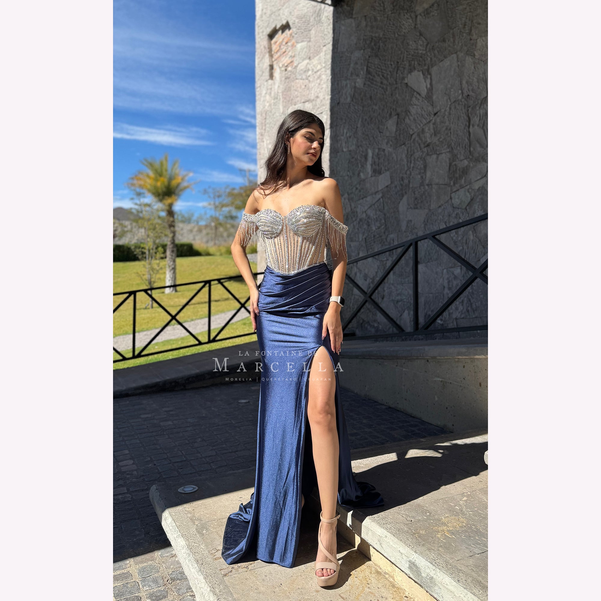 Vestido corte sirena con manga de ojal y pedrería de fantasía en la parte superior, es recomendado para cuerpos tipo Reloj de Arena y Pera. Read more