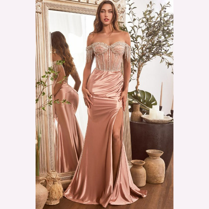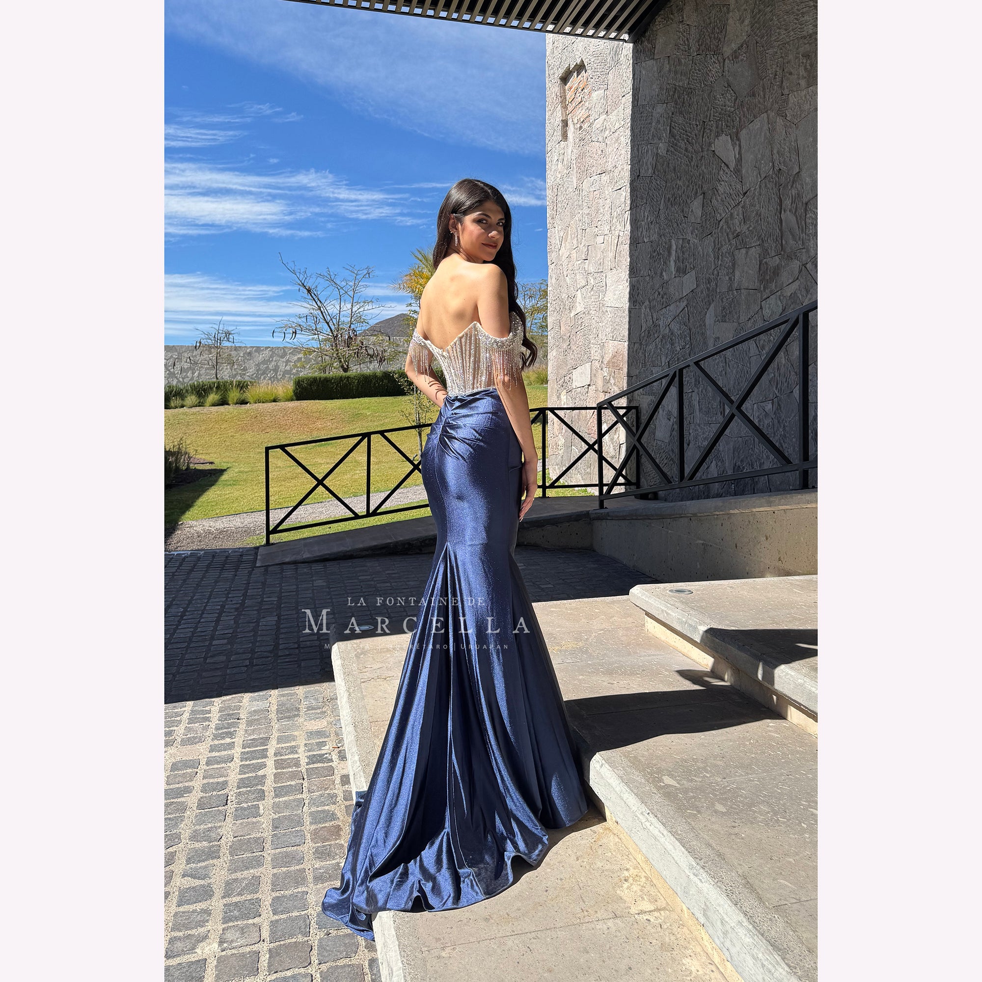 Vestido corte sirena con manga de ojal y pedrería de fantasía en la parte superior, es recomendado para cuerpos tipo Reloj de Arena y Pera.