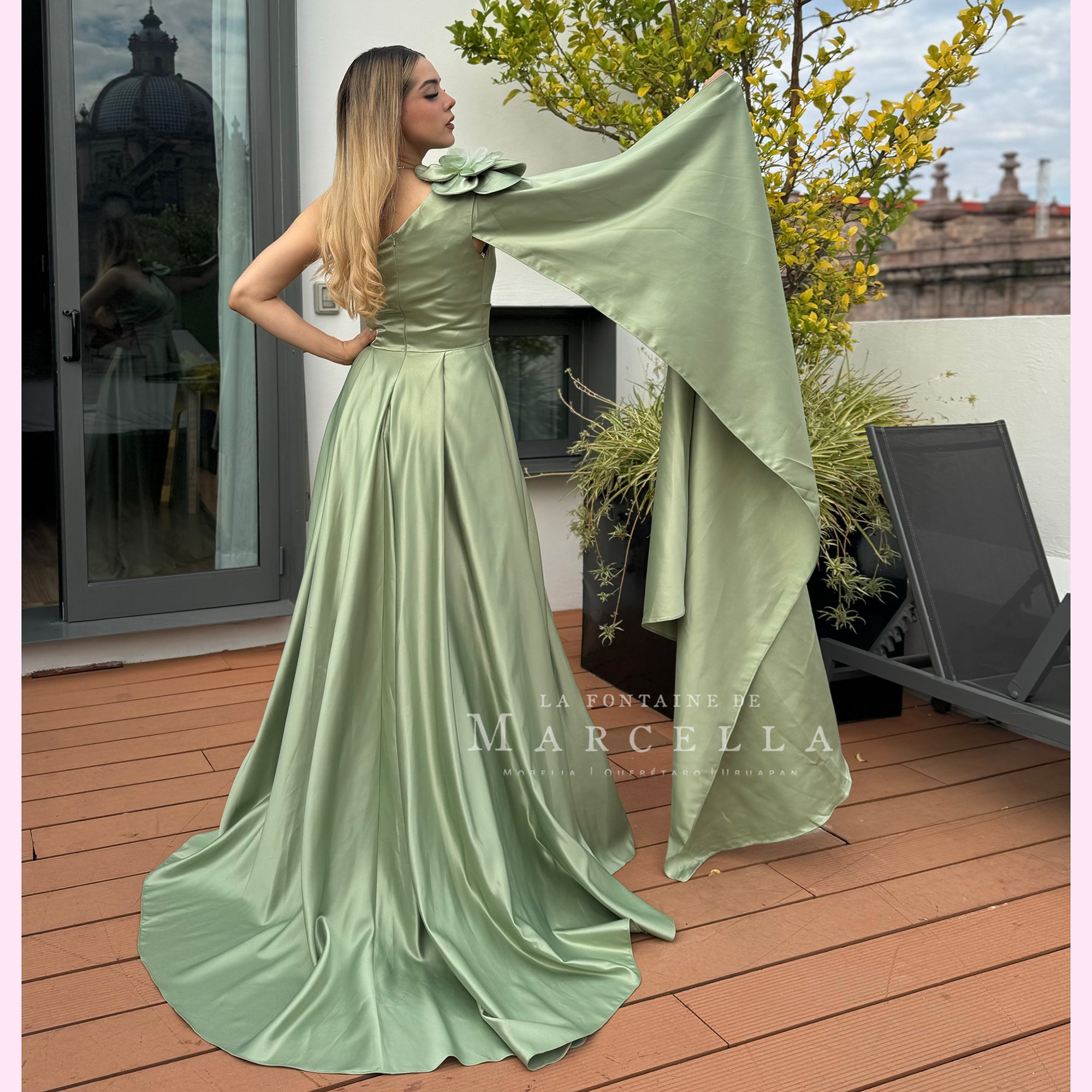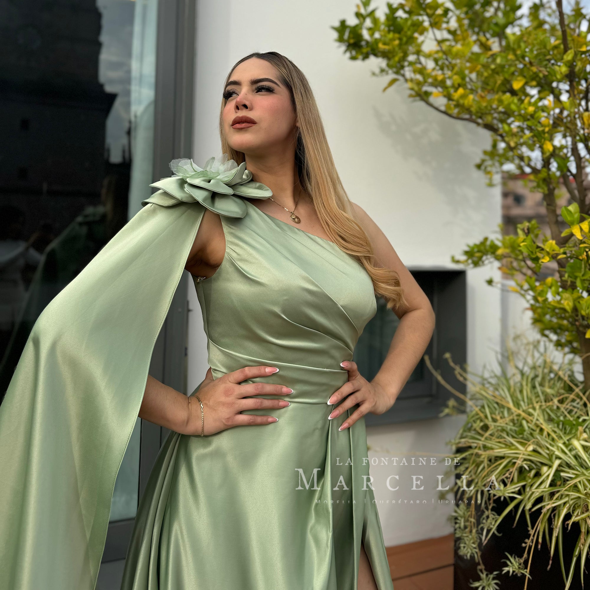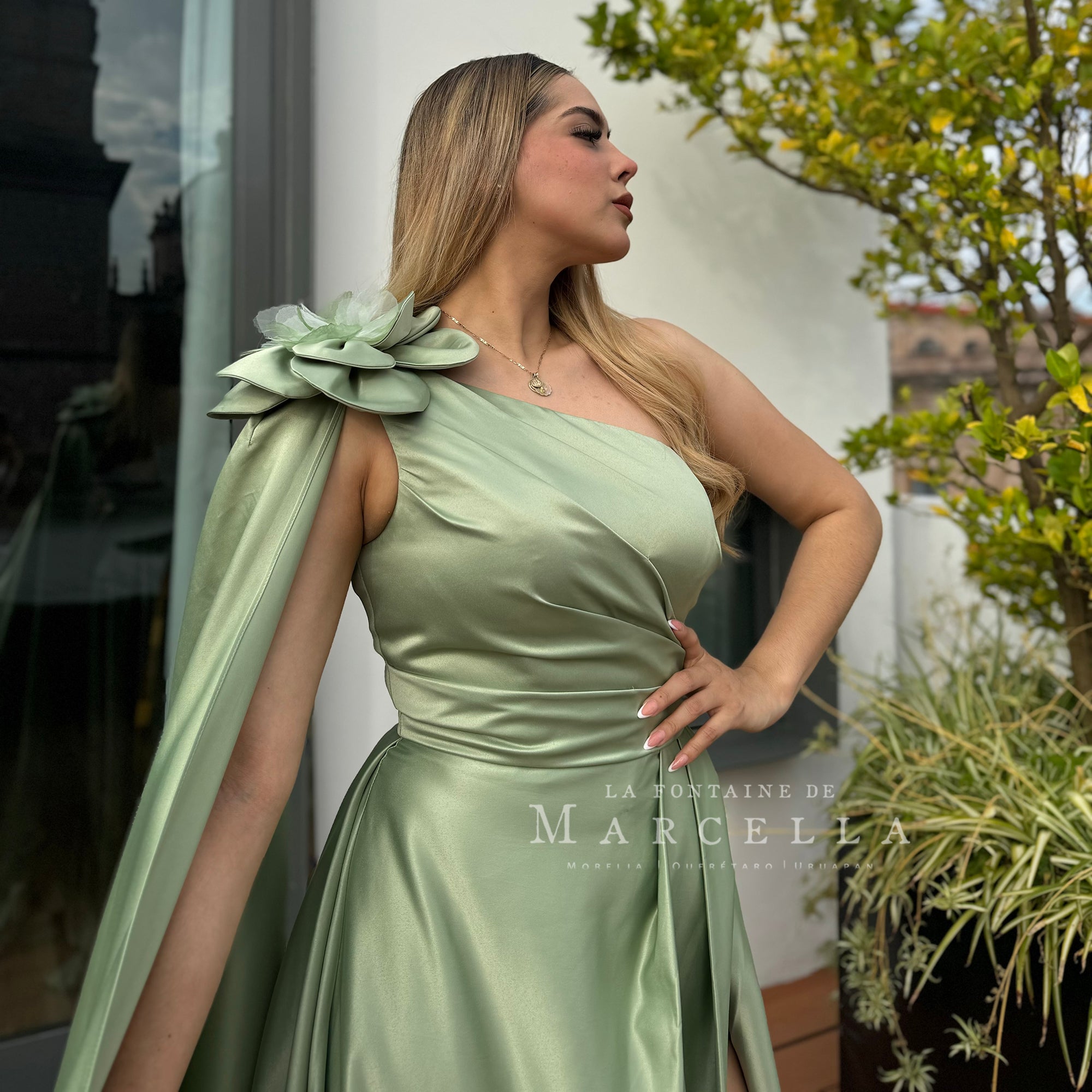 Vestido largo corte en A con escote en diagonal y ensamble desmontable que se sostiene con una flor, es recomendado para cuerpos tipo Rectángulo y Triangulo Invertido.
