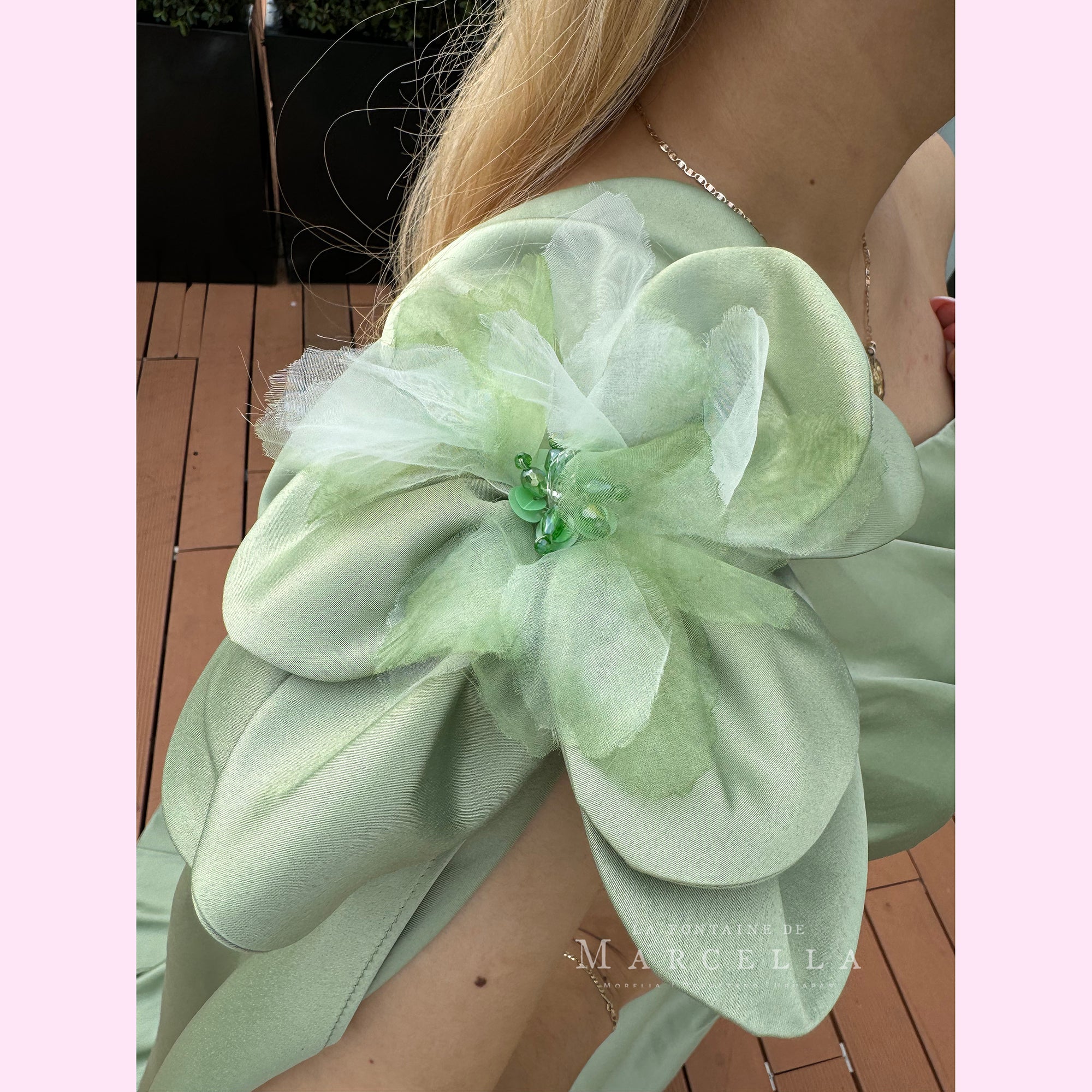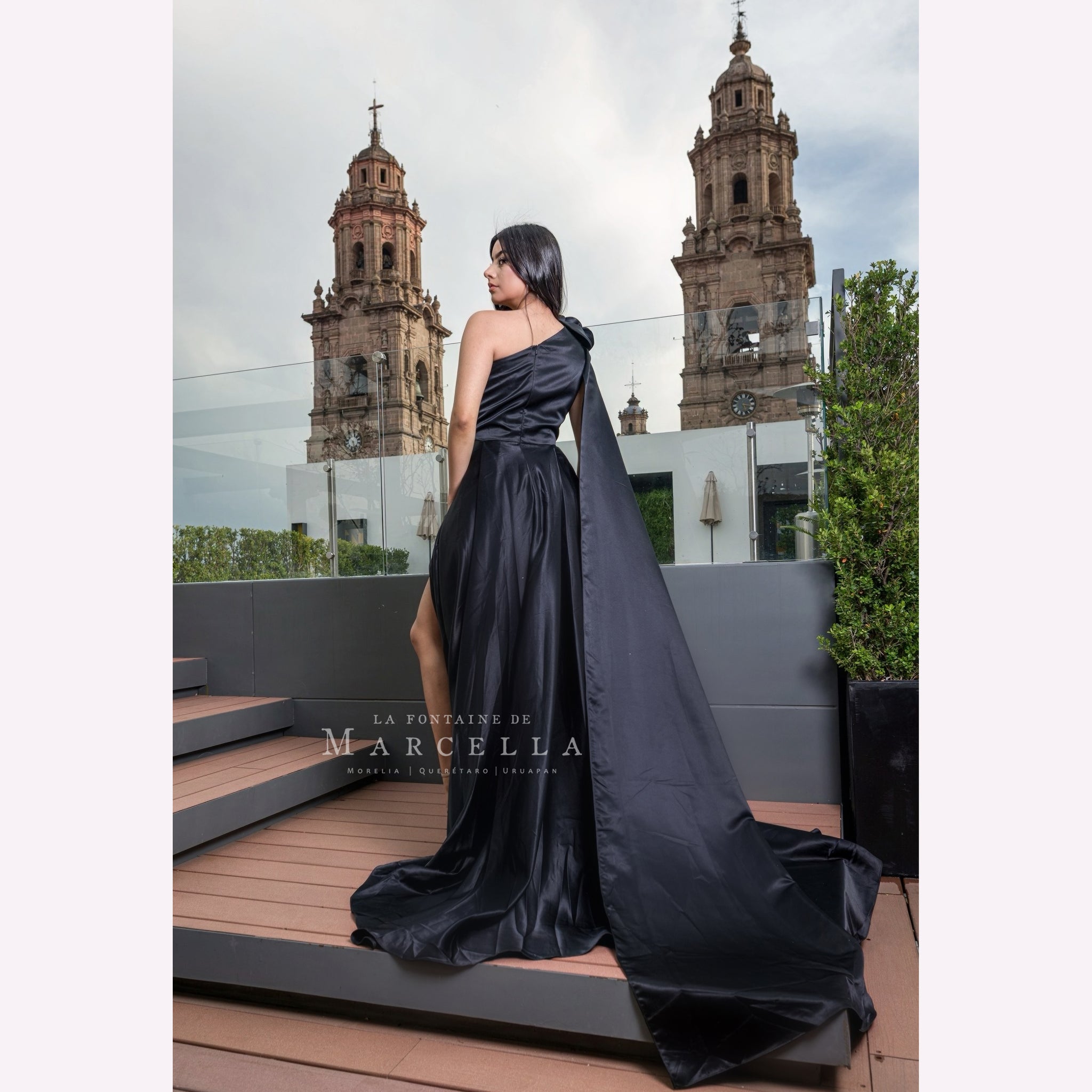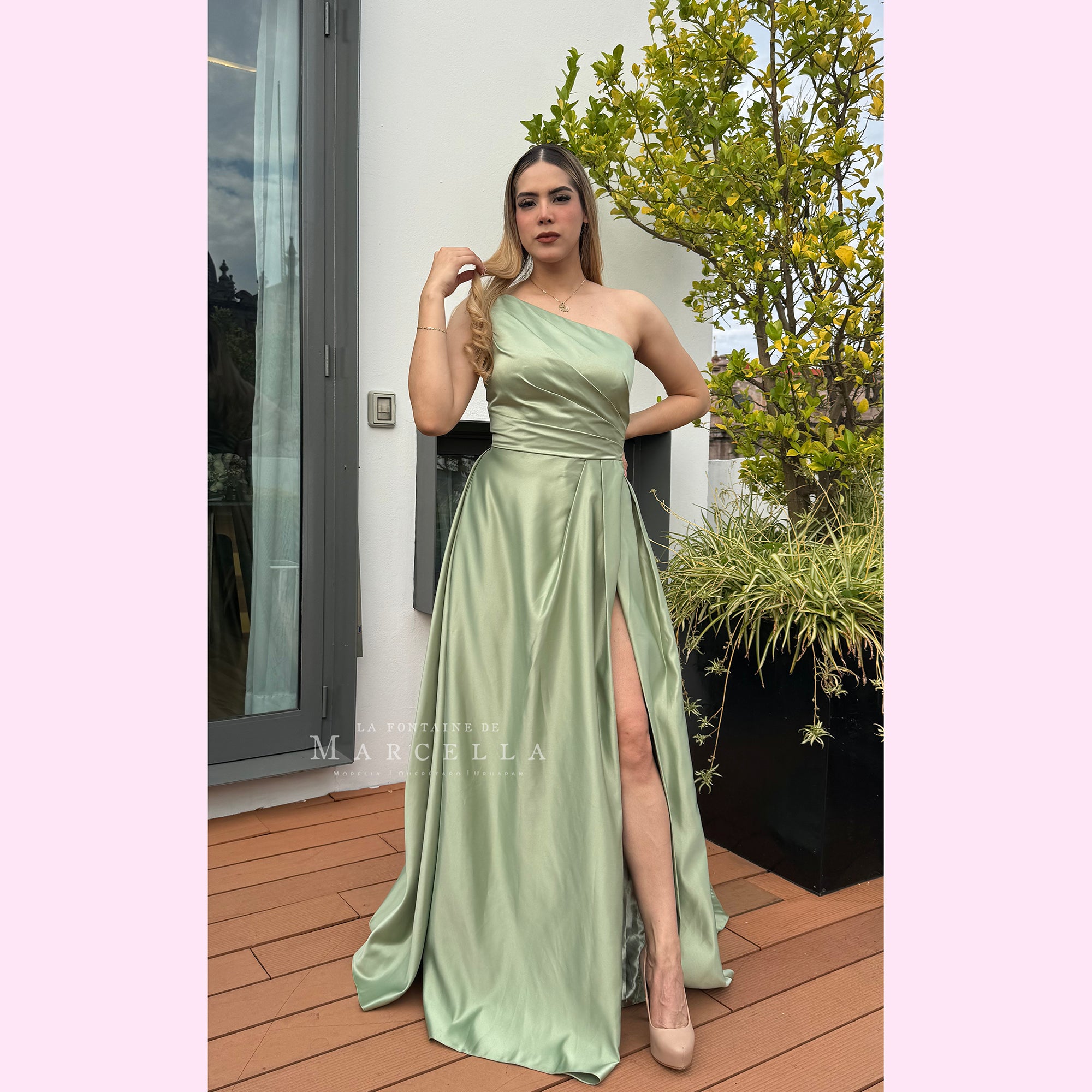 Vestido largo corte en A con escote en diagonal y ensamble desmontable que se sostiene con una flor, es recomendado para cuerpos tipo Rectángulo y Triangulo Invertido.