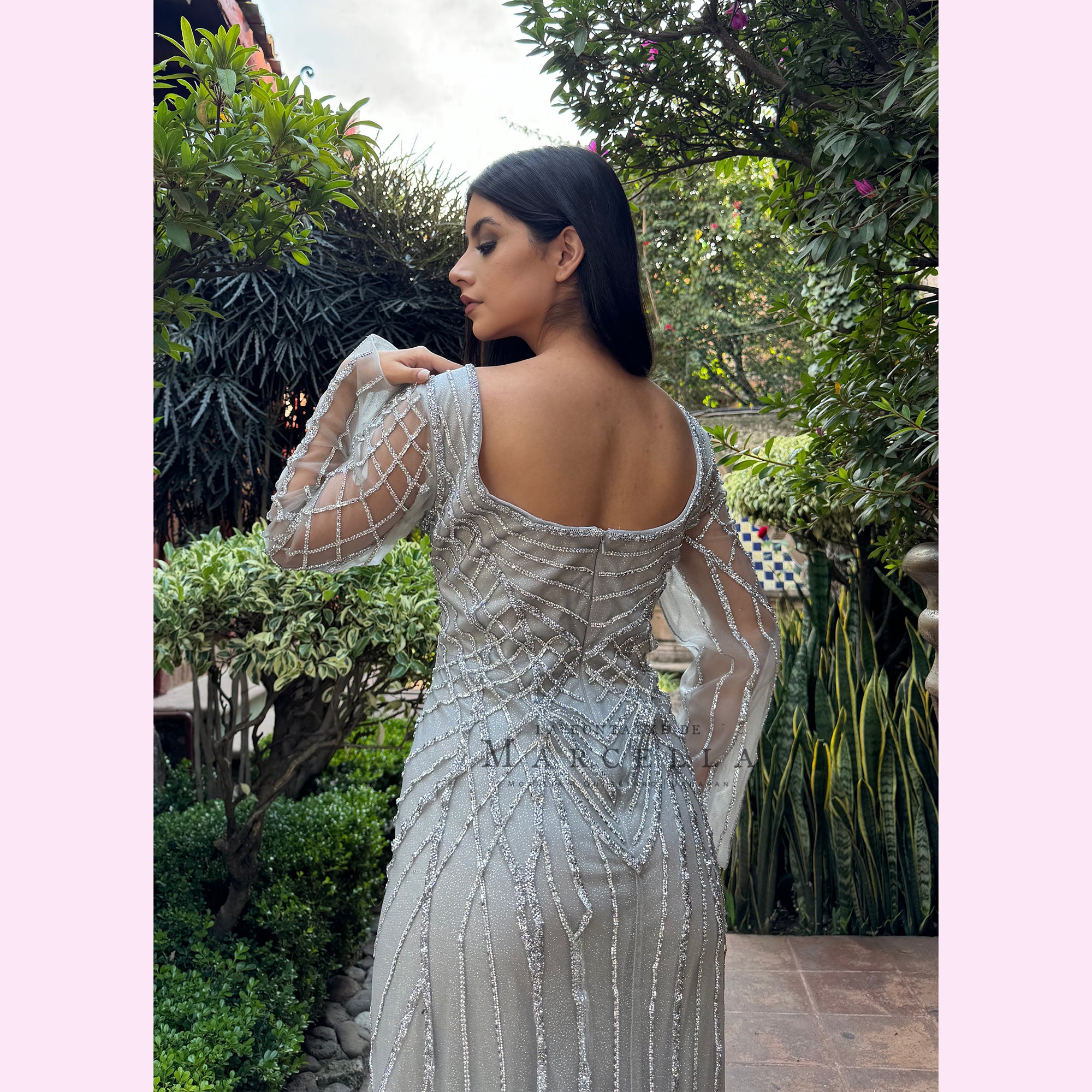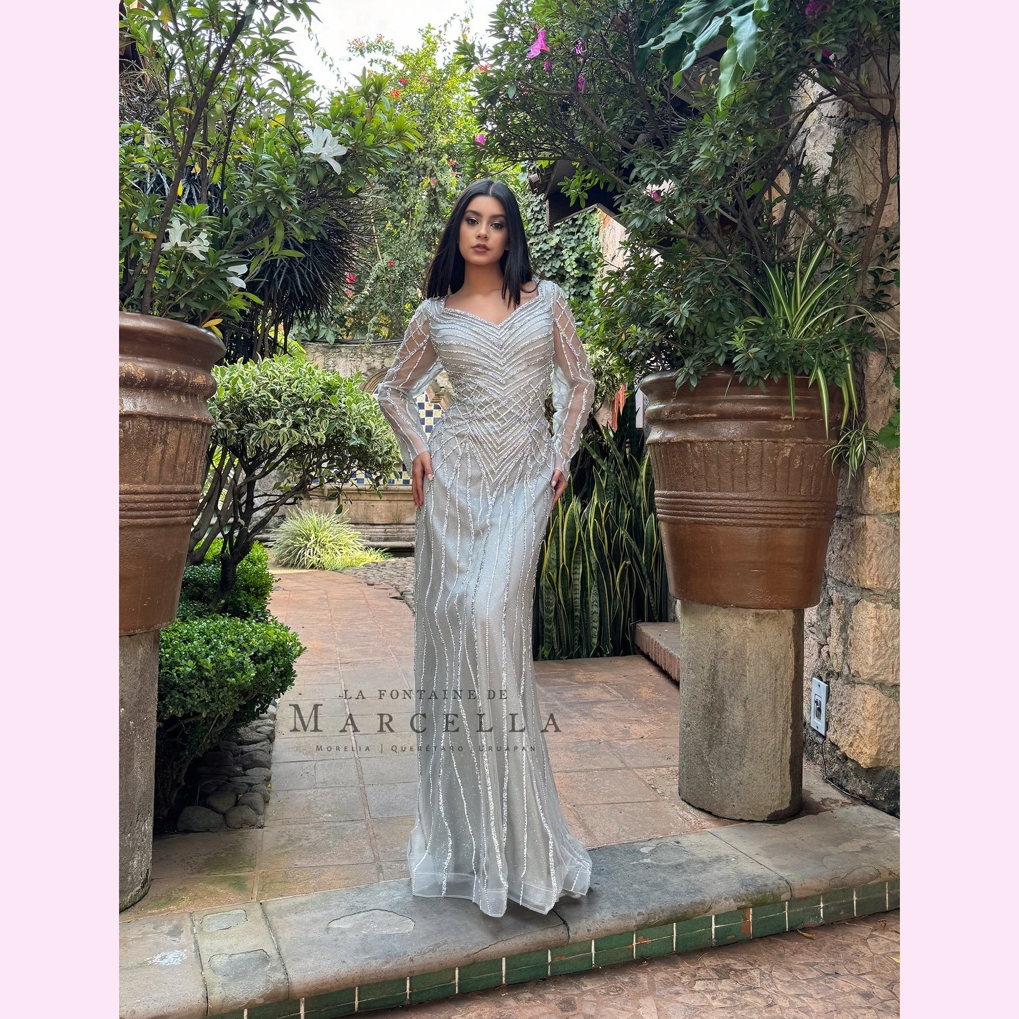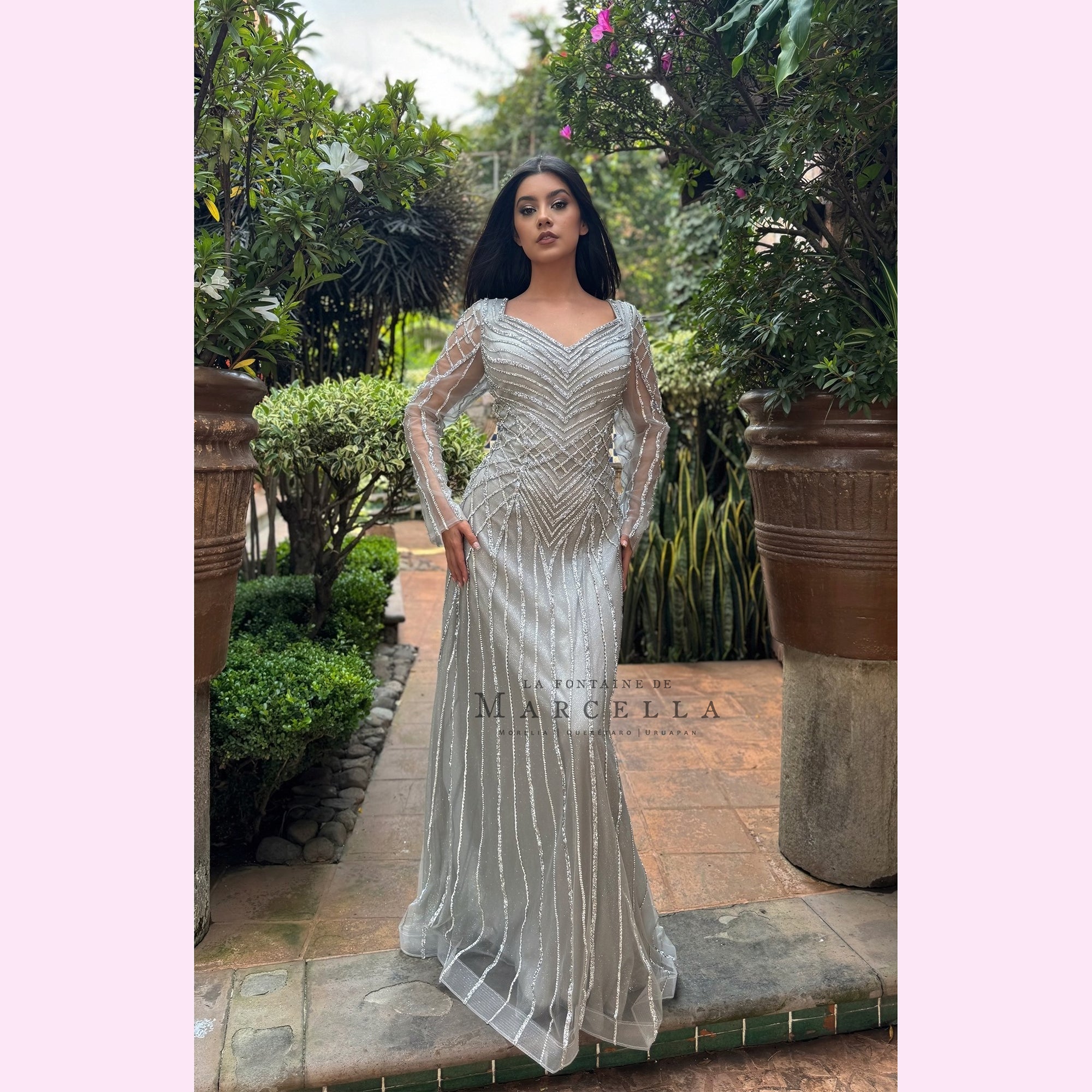 Vestido largo corte sirena con maga larga hermosamente adonado con pedrería de cristal fantasía, es recomendado para cuerpos tipo Reloj de Arena y Pera.