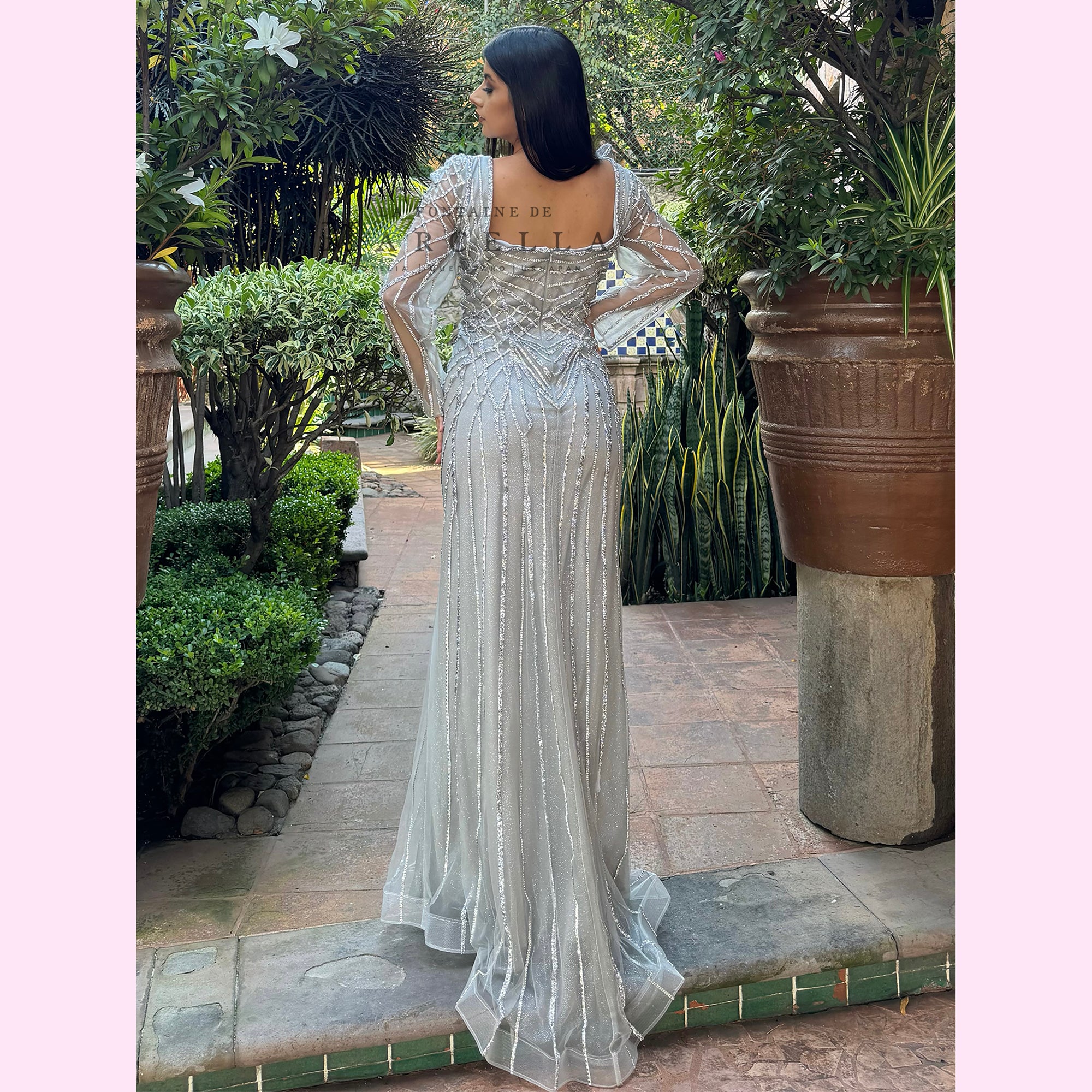 Vestido largo corte sirena con maga larga hermosamente adonado con pedrería de cristal fantasía, es recomendado para cuerpos tipo Reloj de Arena y Pera. Read more