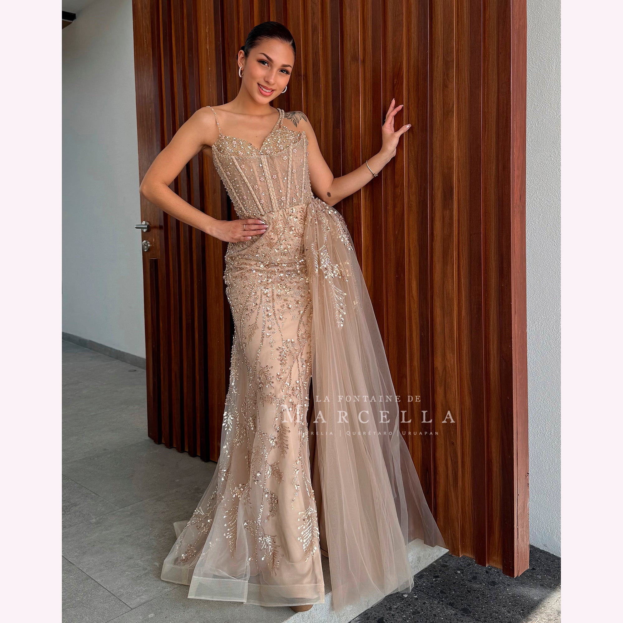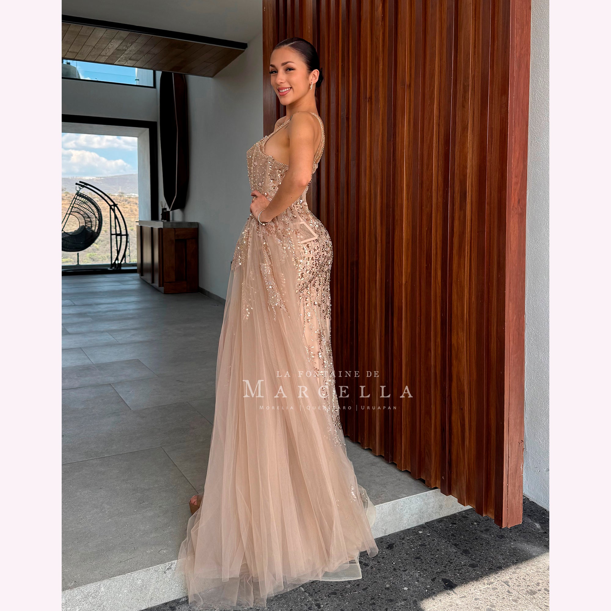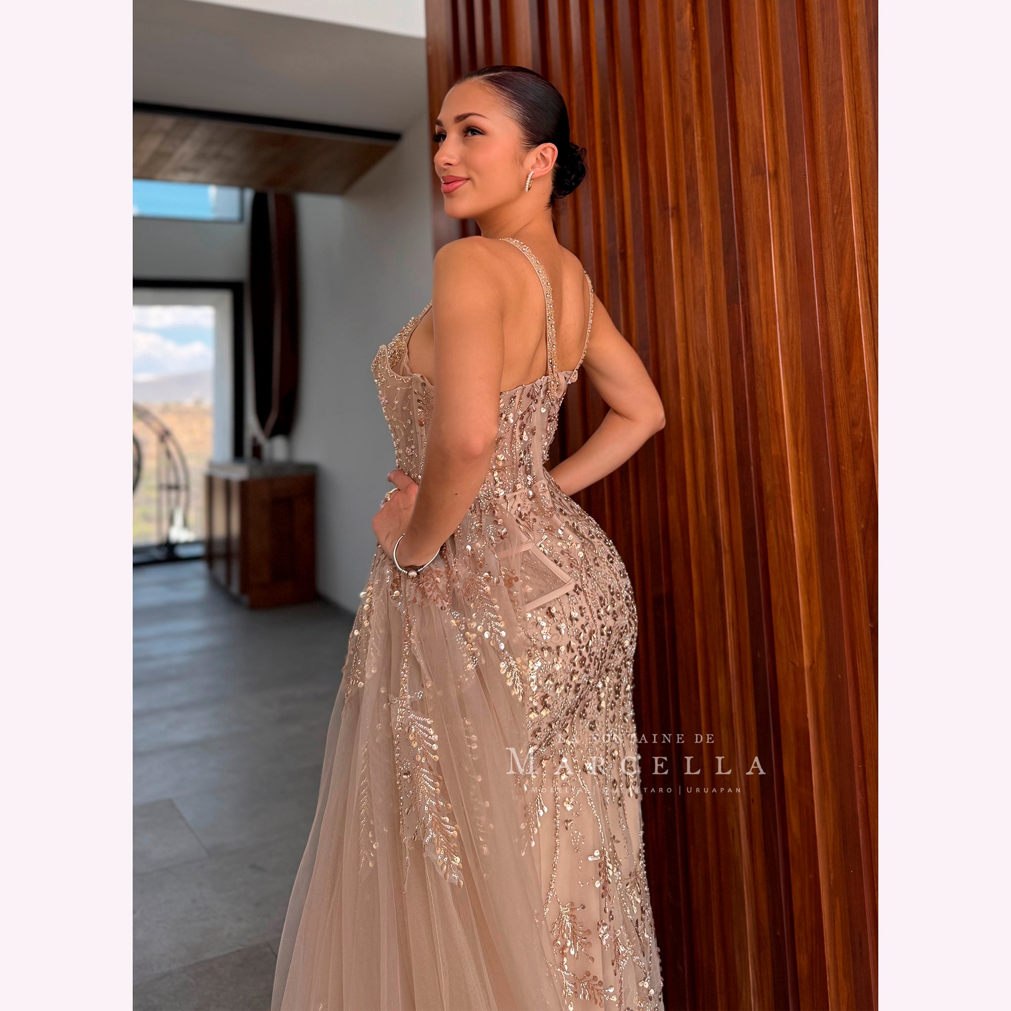 Vestido corte sirena con ensamble en la cadera y efecto corse con transparencia, hermosamente adornado con pedrería de fantasía, es recomendado para cuerpos tipo Rectángulo y Triangulo Invertido.