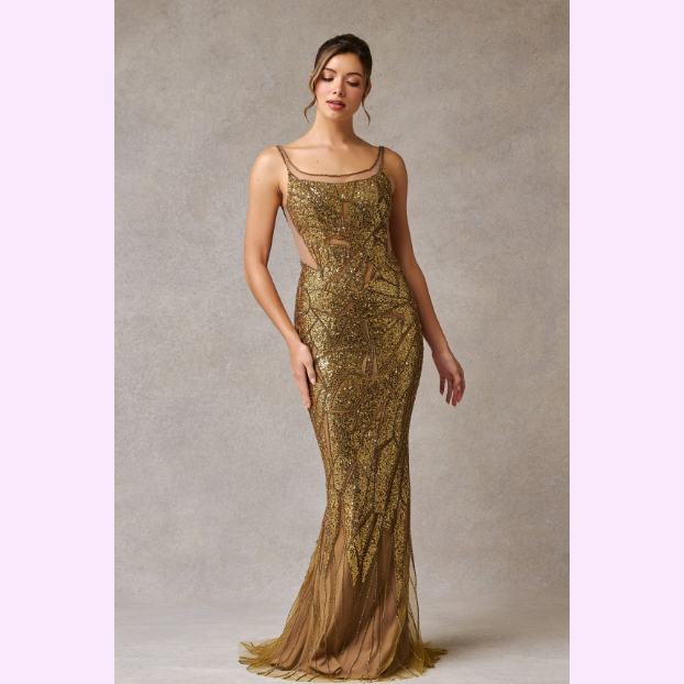 Vestido largo corte sirena con patrón en lentejuela es recomendado para cuerpos tipo Reloj de Arena y Pera.
