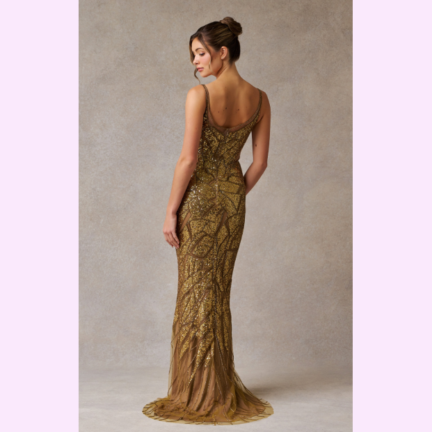 Vestido largo corte sirena con patrón en lentejuela es recomendado para cuerpos tipo Reloj de Arena y Pera.Read more