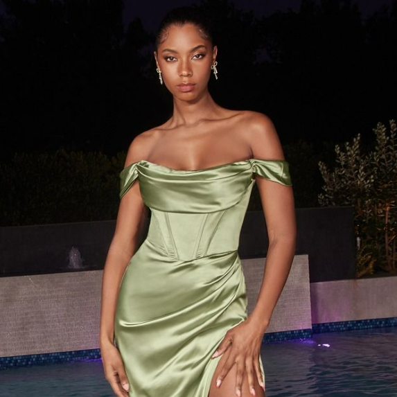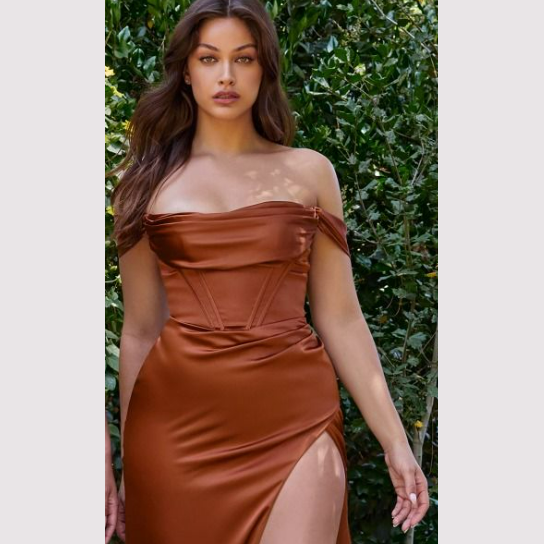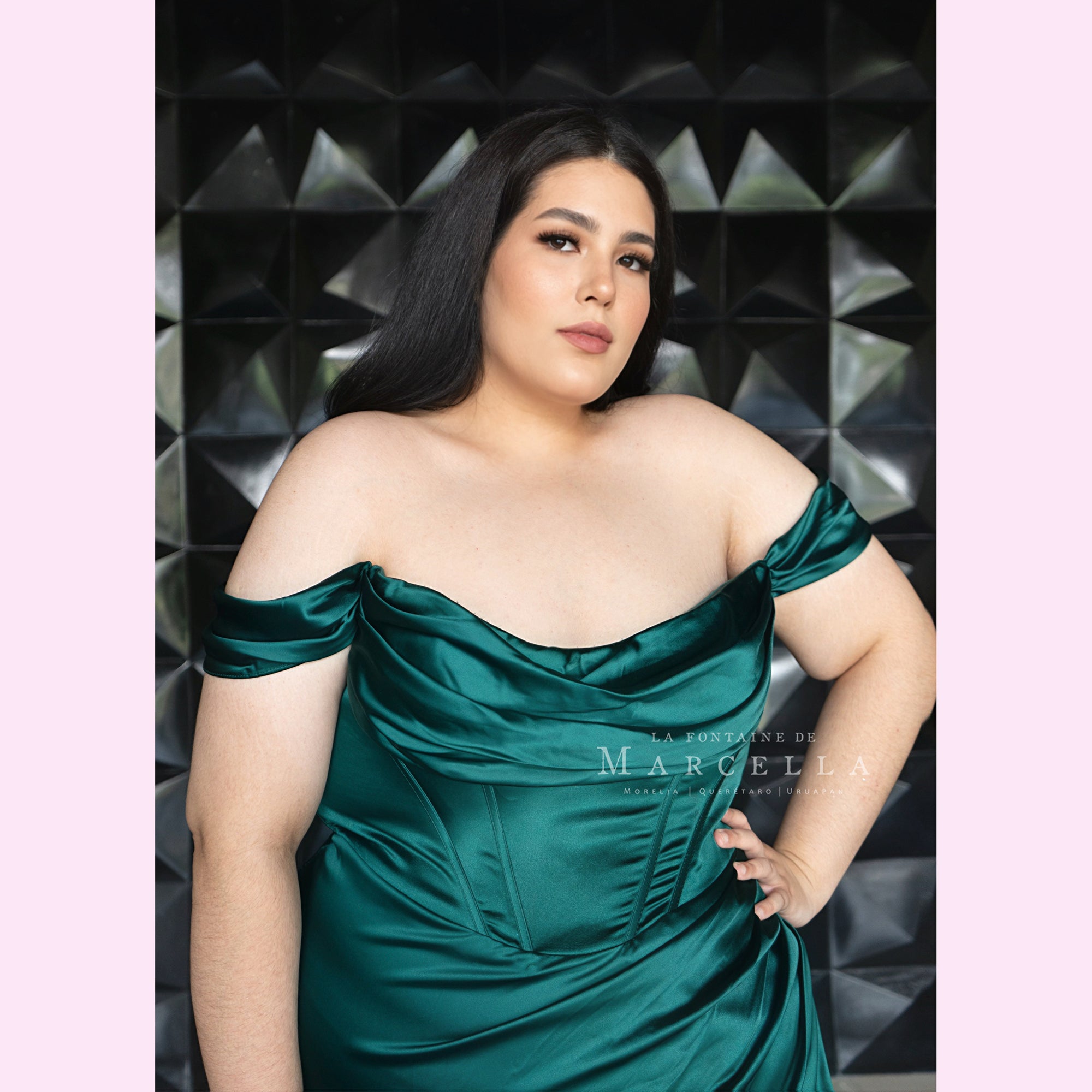 Vestido largo corte sirena con vista de corsé y manga de ojal, recomendado para cuerpos tipo Reloj de Arena y Pera.