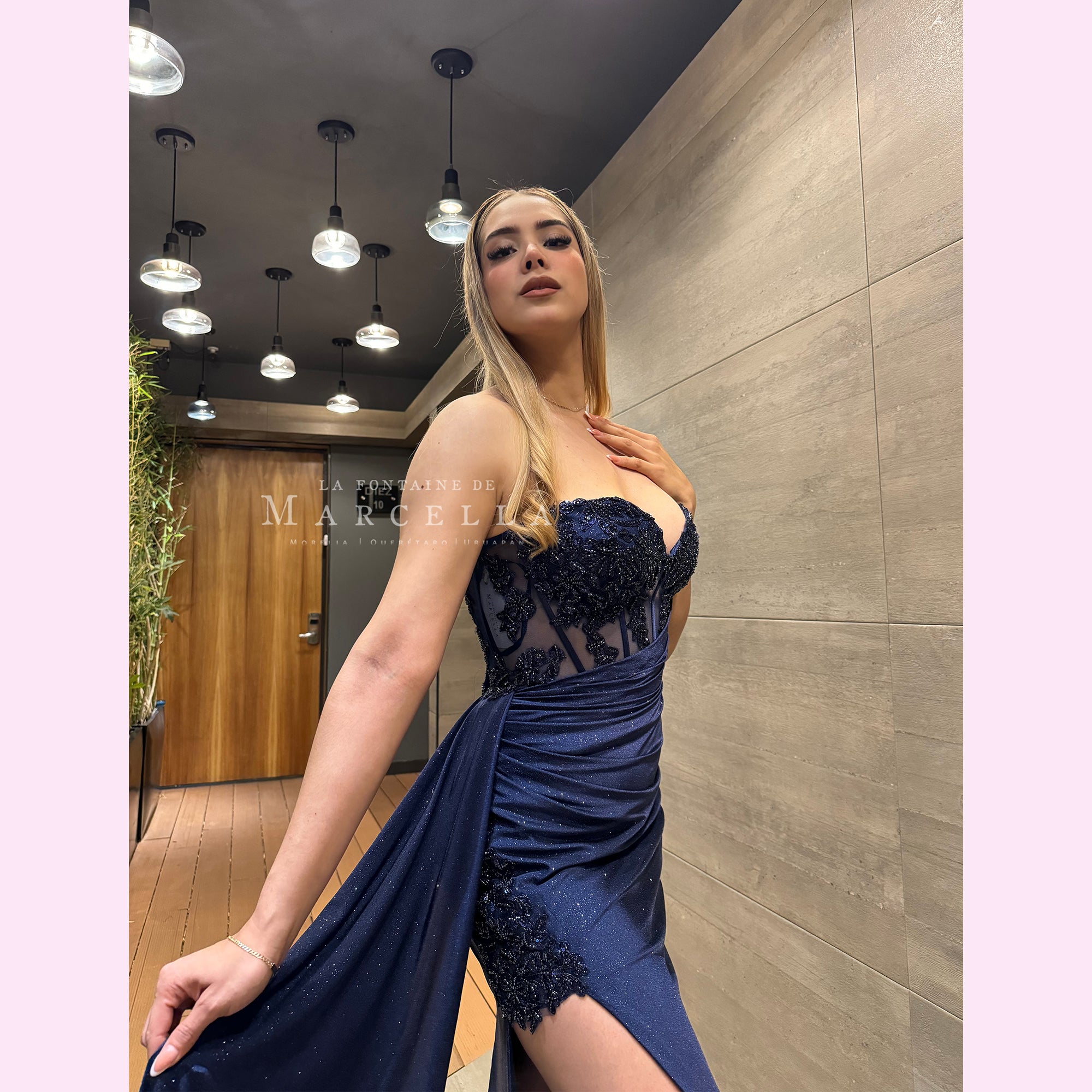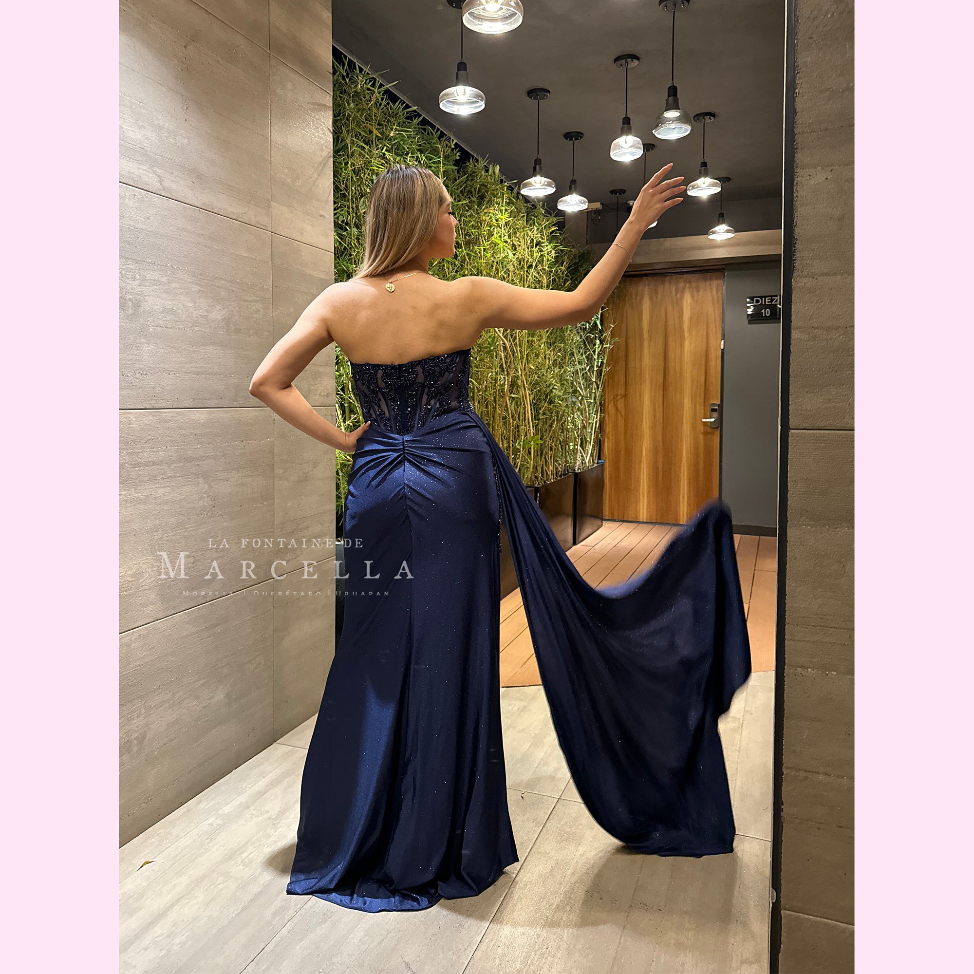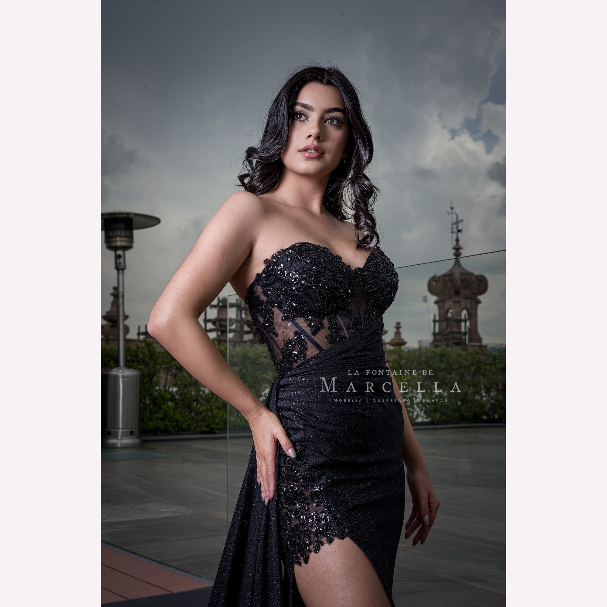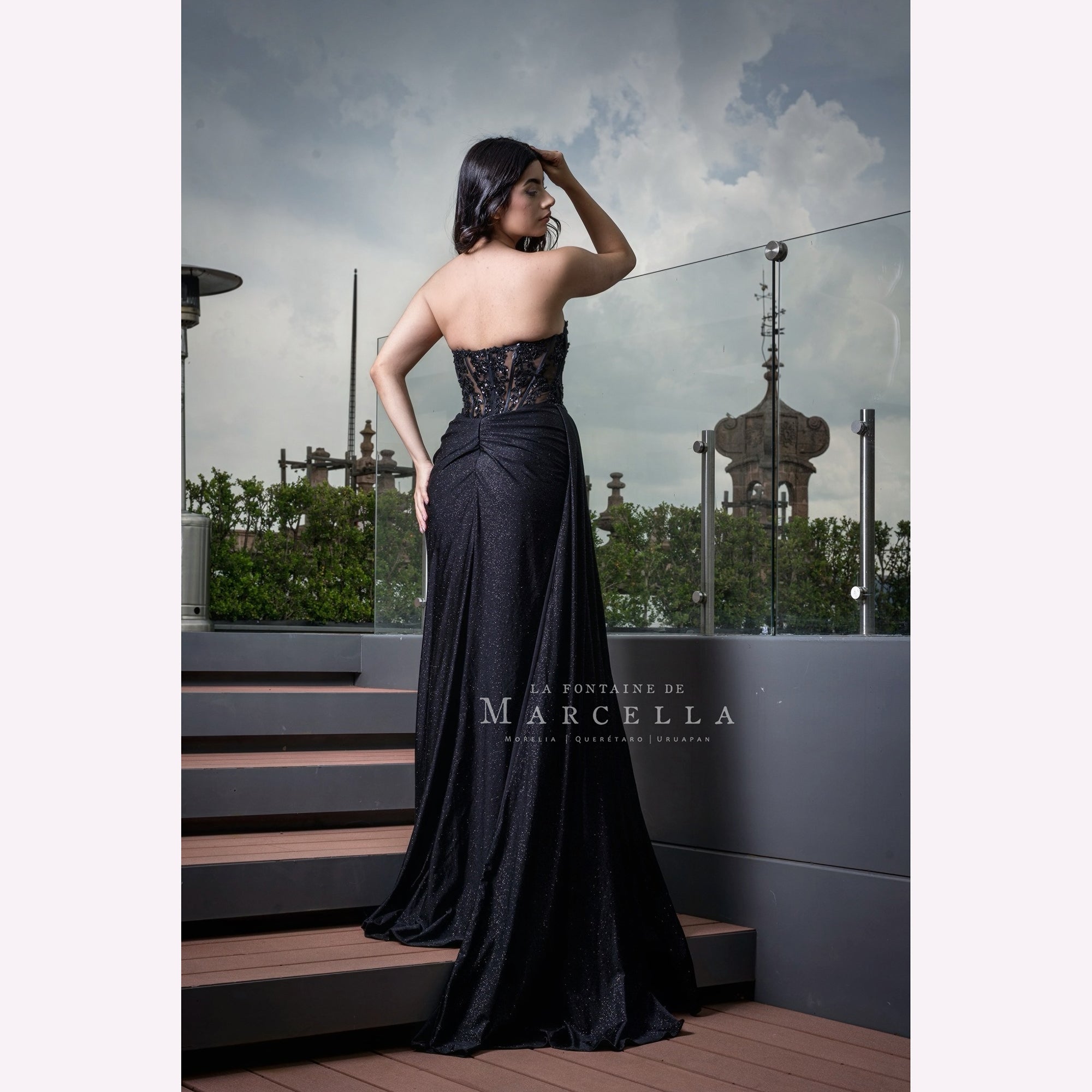 Vestido largo corte sirena con transparencia en la parte superior, cuanta con ensamble al costado de la cadera es recomendado para cuerpos tipo Reloj de Arena y Pera.Read more