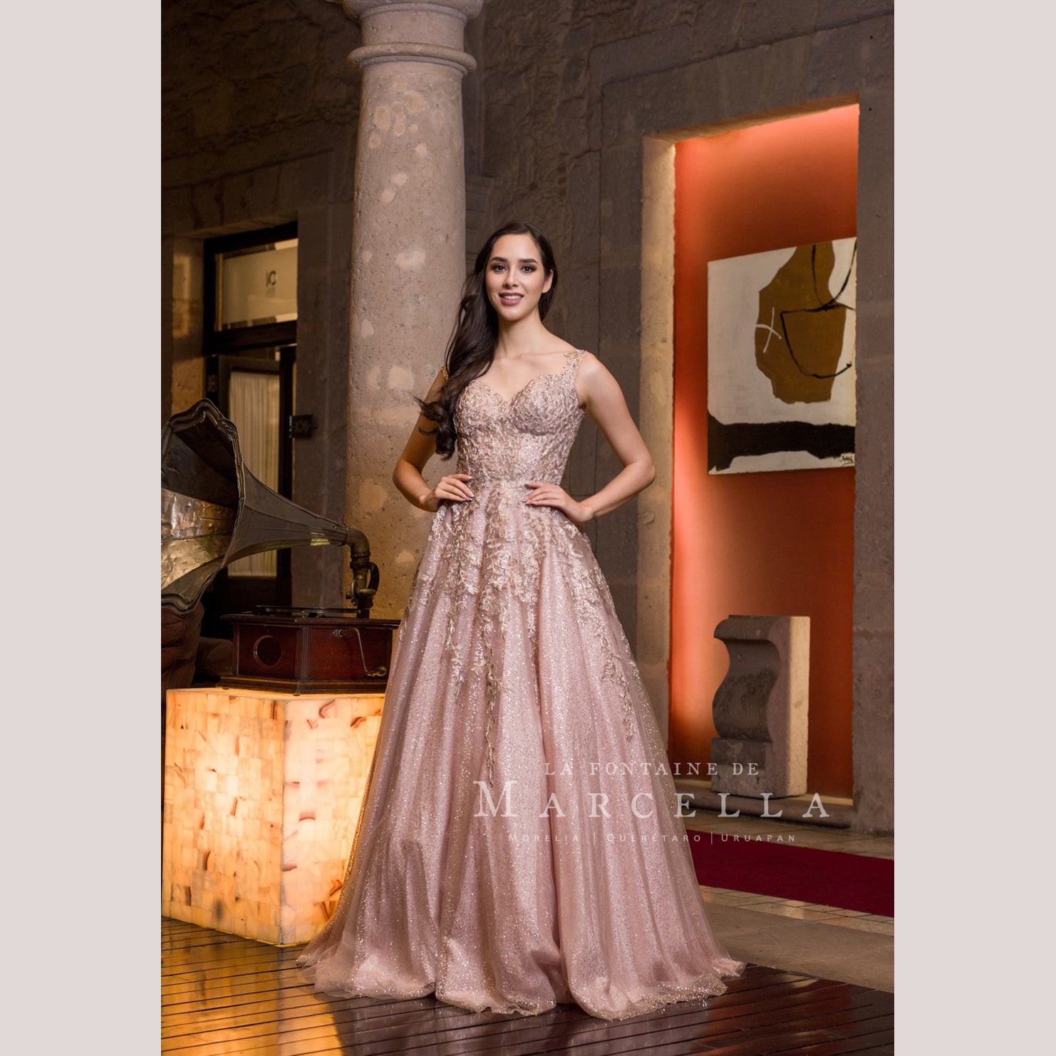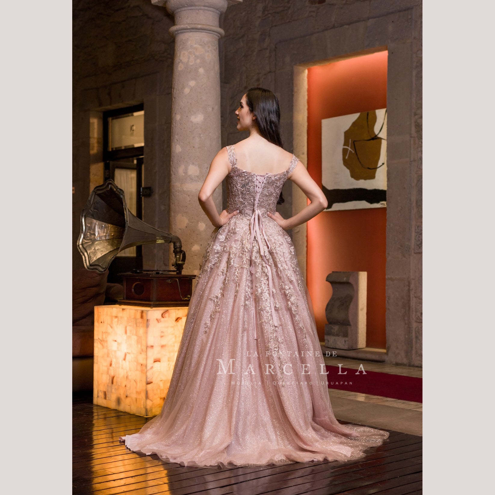Vestido largo corte princesa adornado con aplicación floral y hermoso corset en la espalda, es recomendado para cuerpos tipo Triangulo Invertido y Rectángulo.
