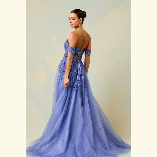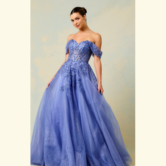 Vestido corte en A de tul con manga de ojal, recomendado para cuerpos tipo Rectángulo y Manzana.