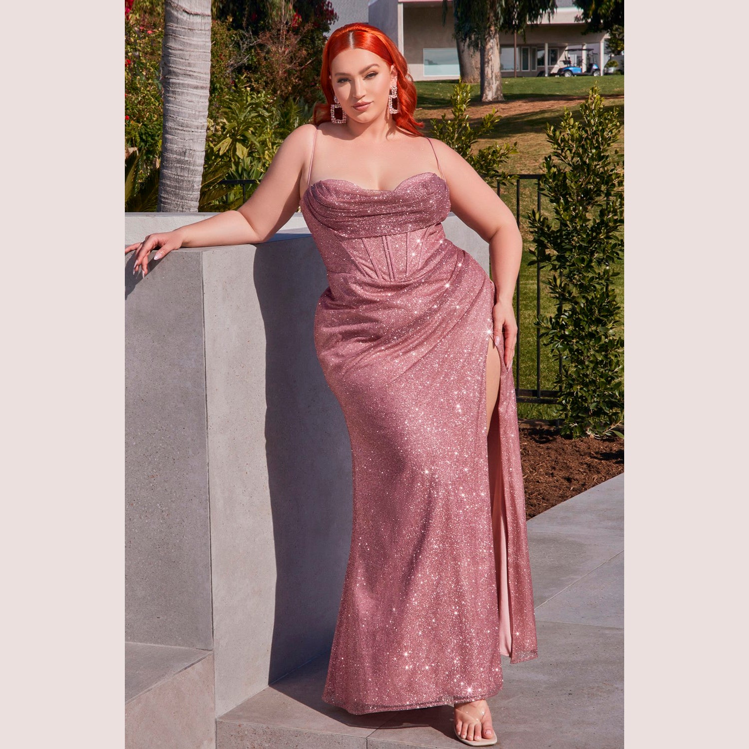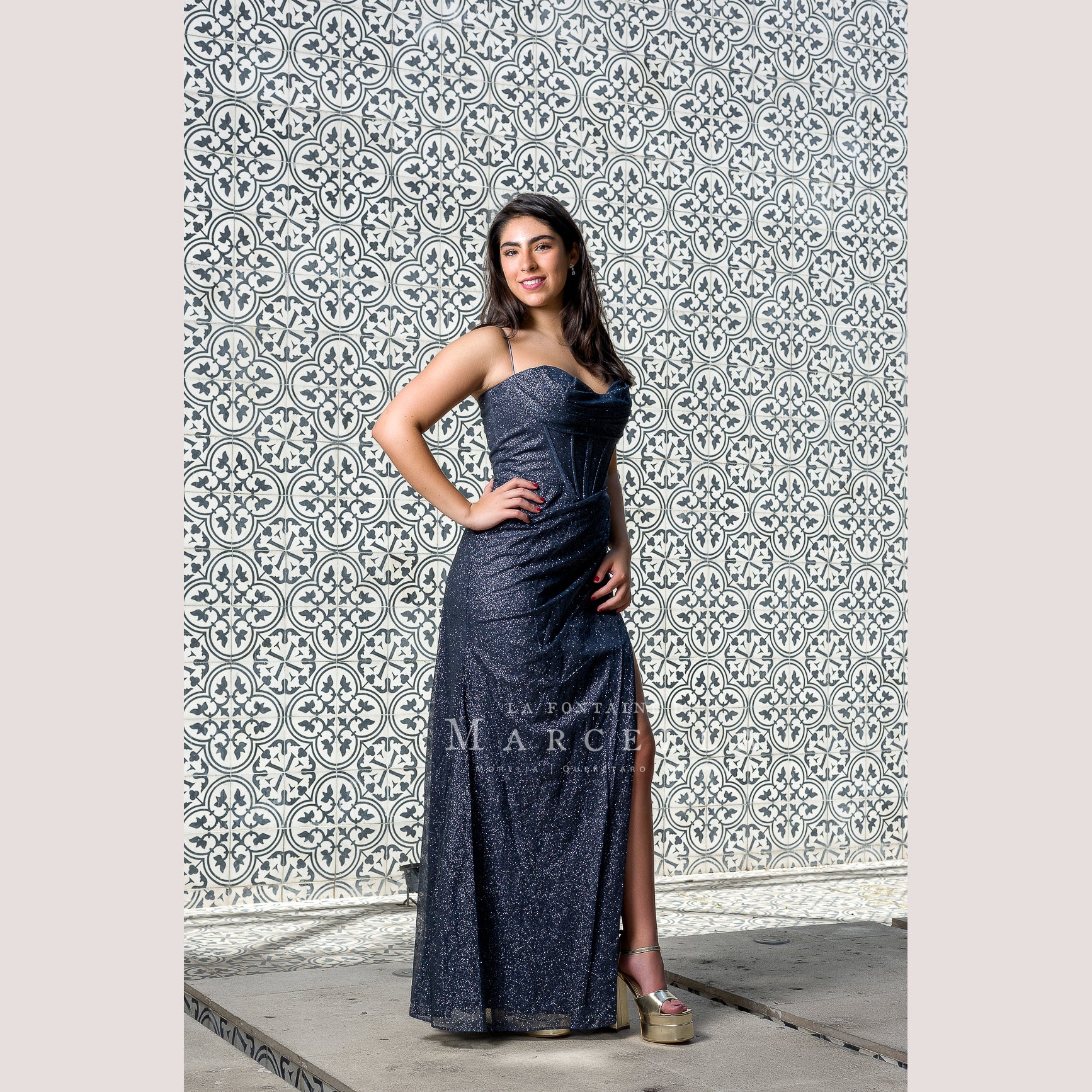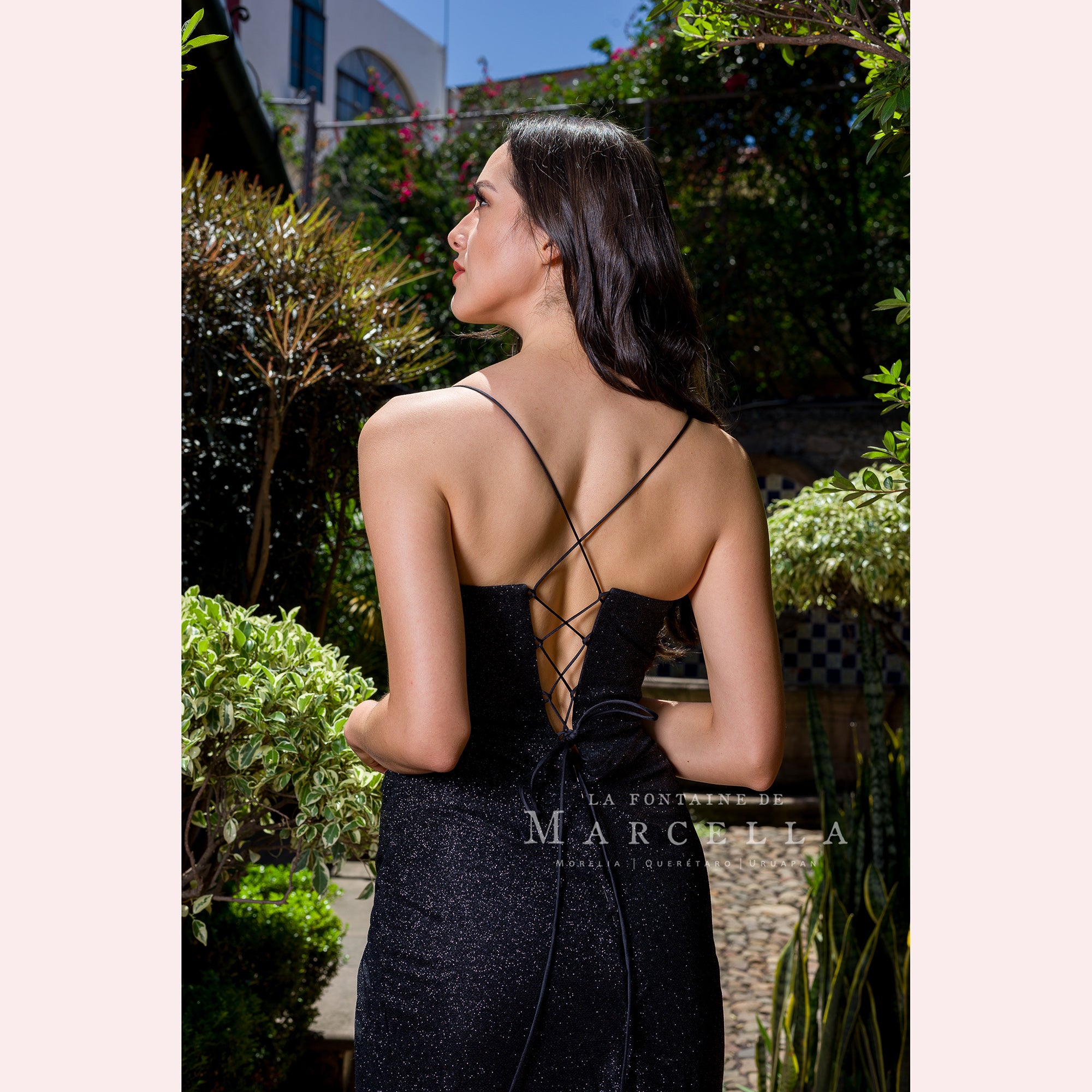 Vestido de escote corazón adornado con varilla, tirante delgado y abertura en la pierna es recomendado para cuerpos tipo Rectángulo, Manzana y Reloj de Arena.