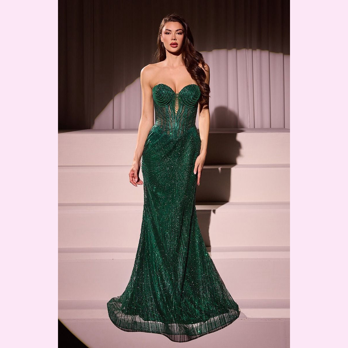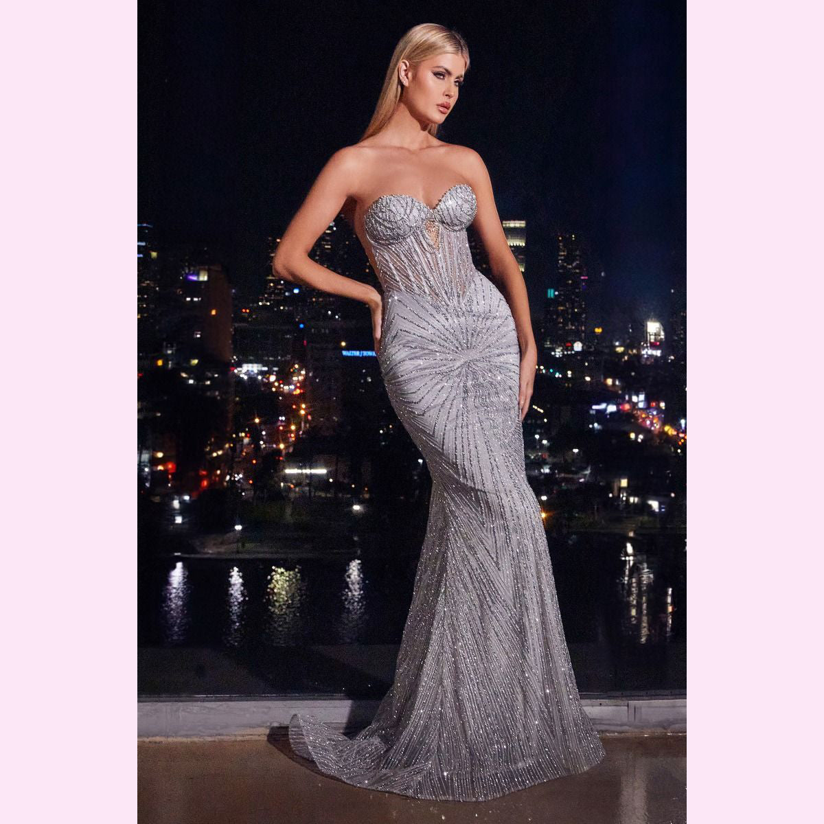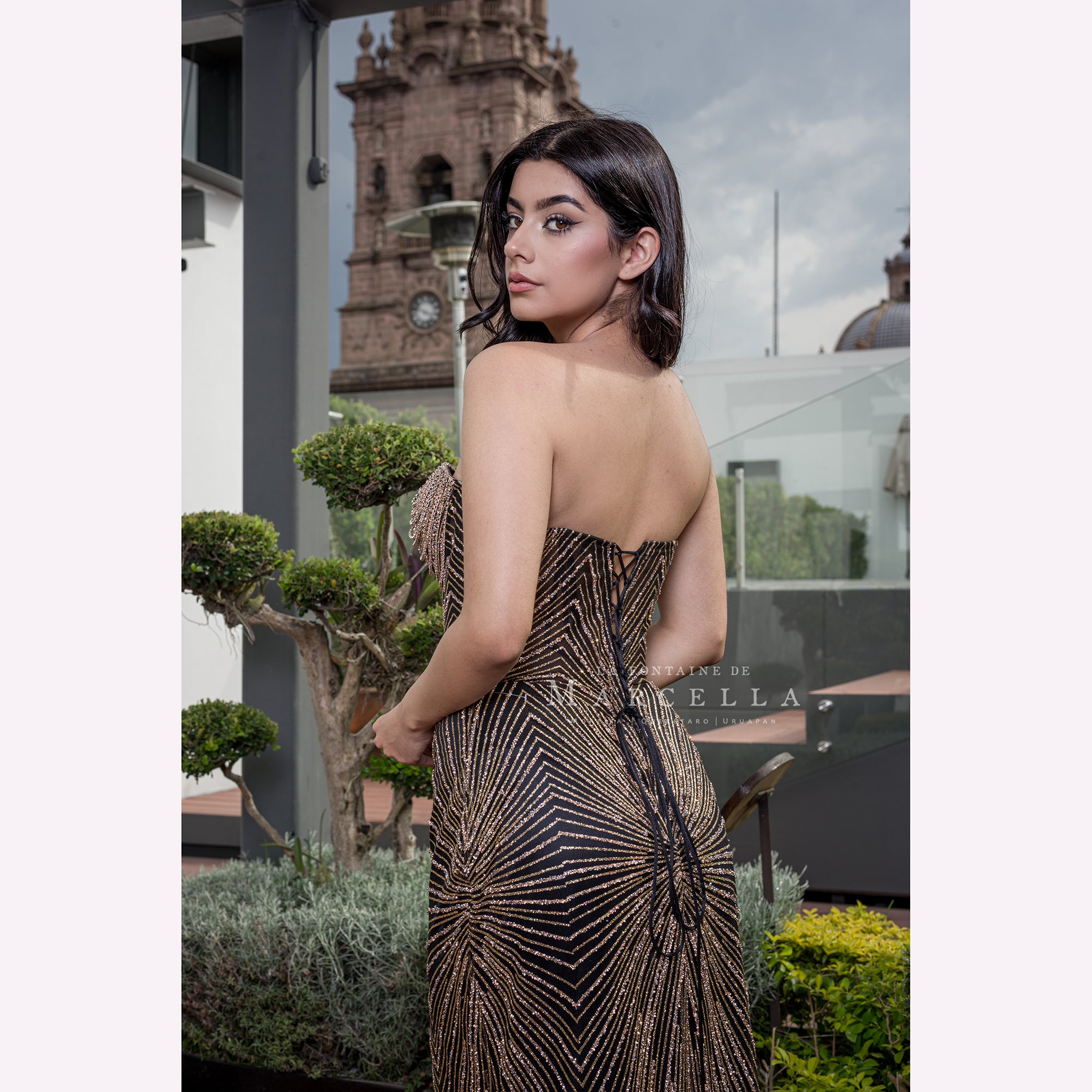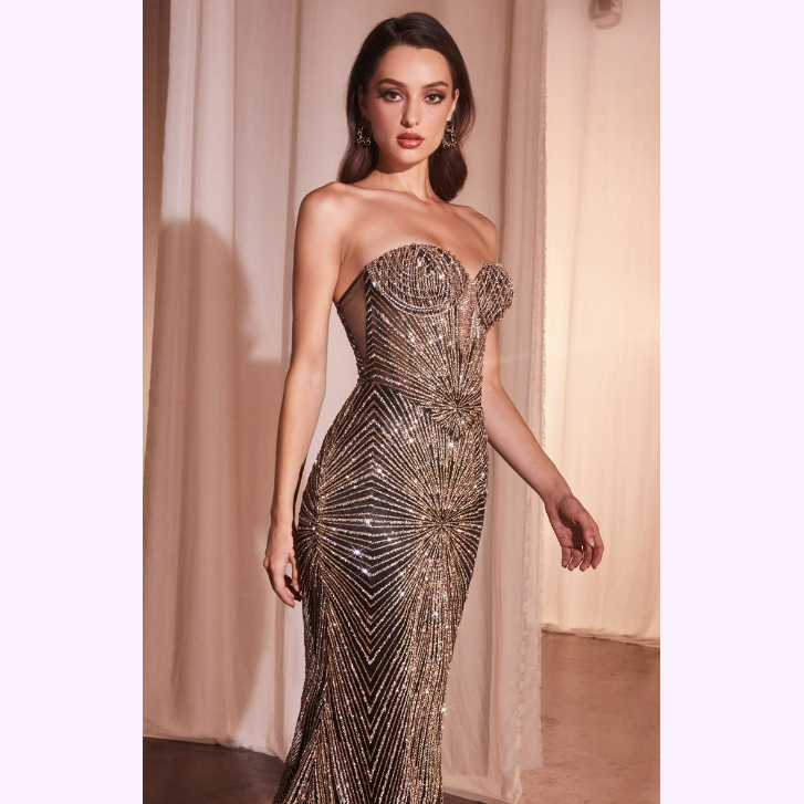 Vestido largo corte sirena strapless, hermosamente adornado con patrón de lentejuelas, es recomendado para cuerpos tipo Reloj de Arena y Pera.
