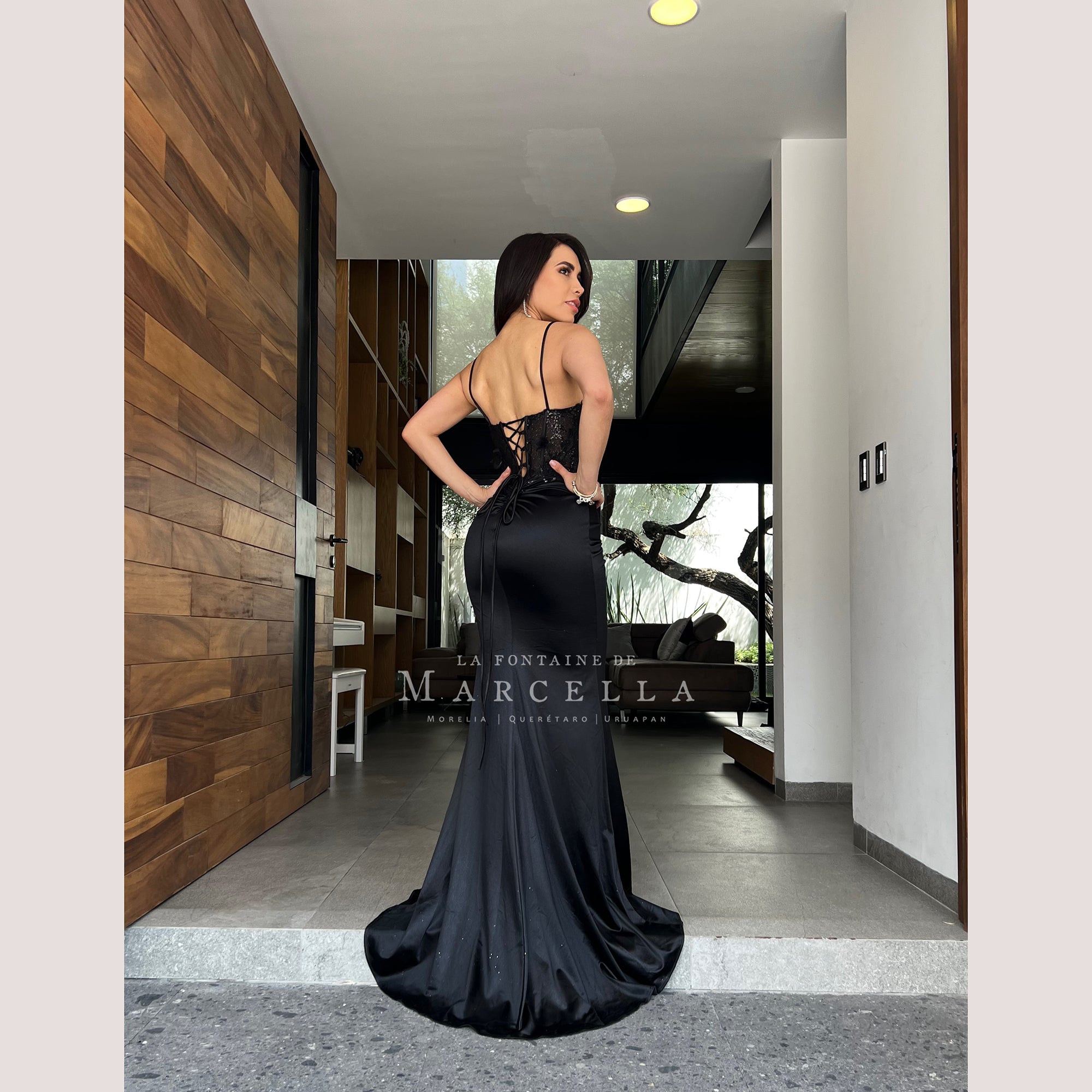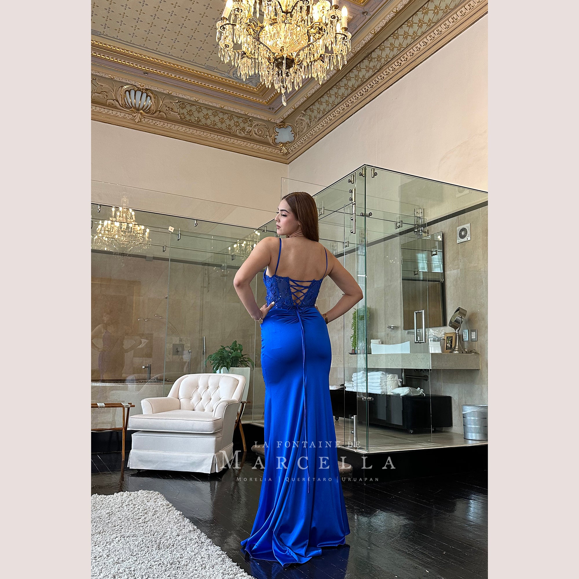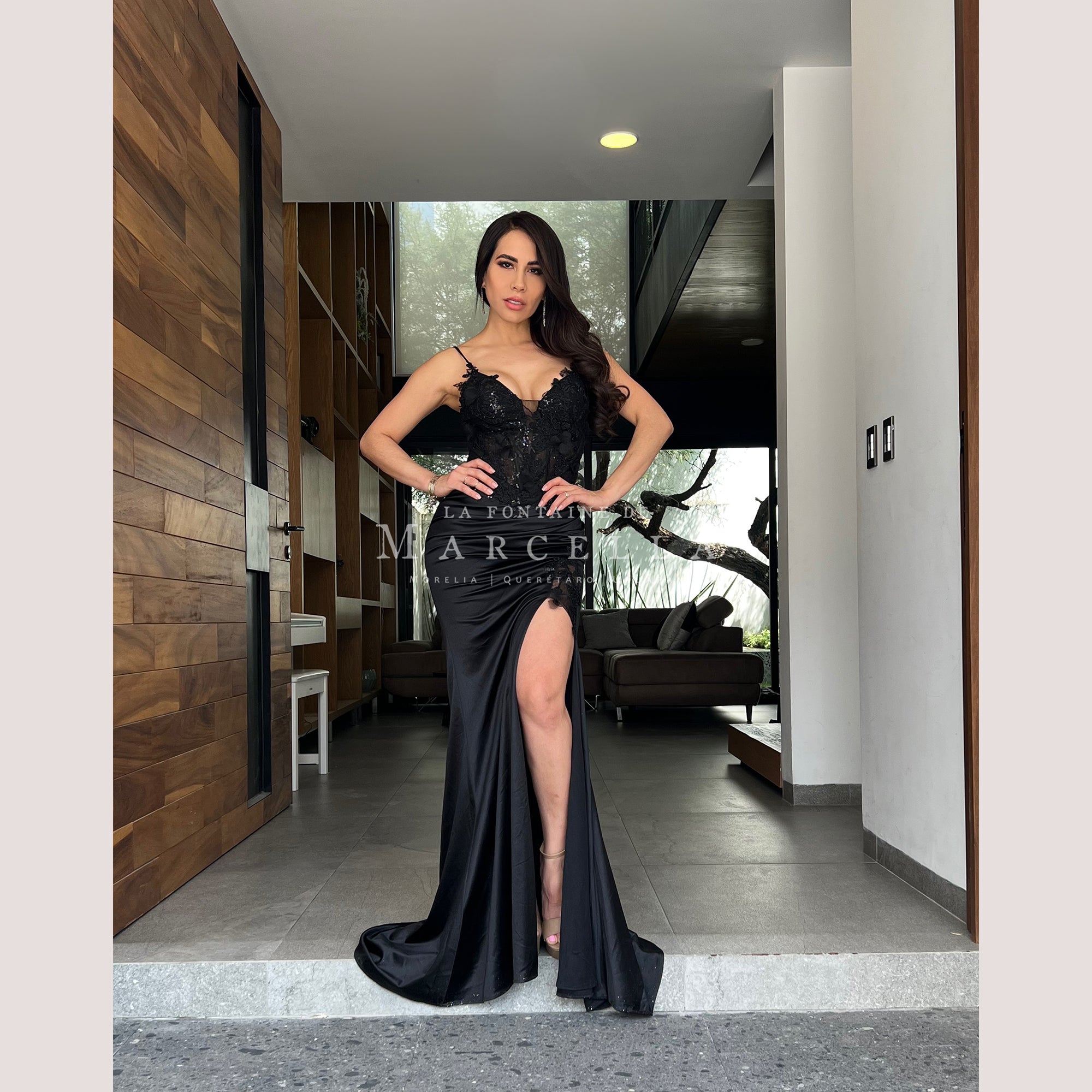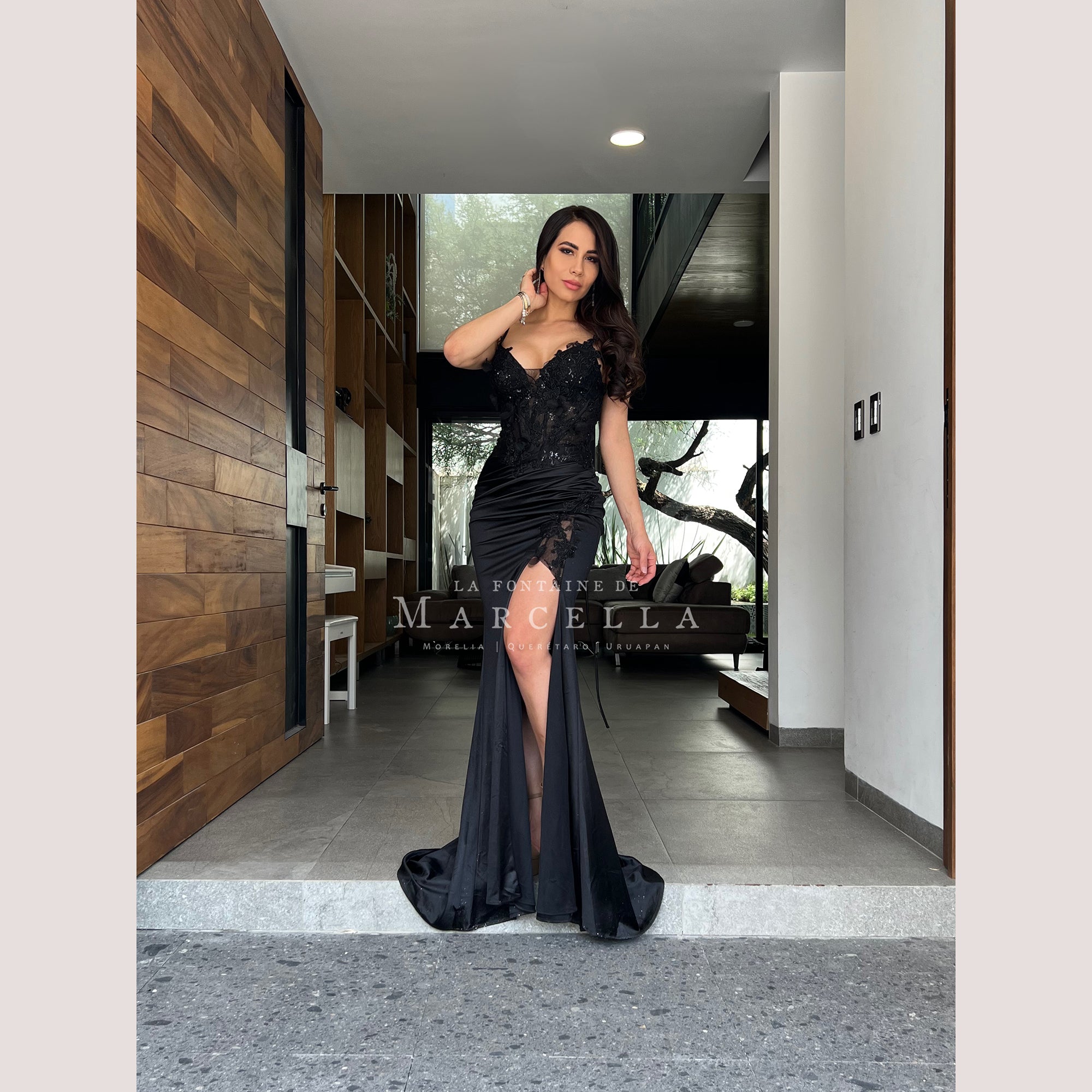 Vestido largo de corte sirena hermosamente adornado con transparencia y apicación brillante.